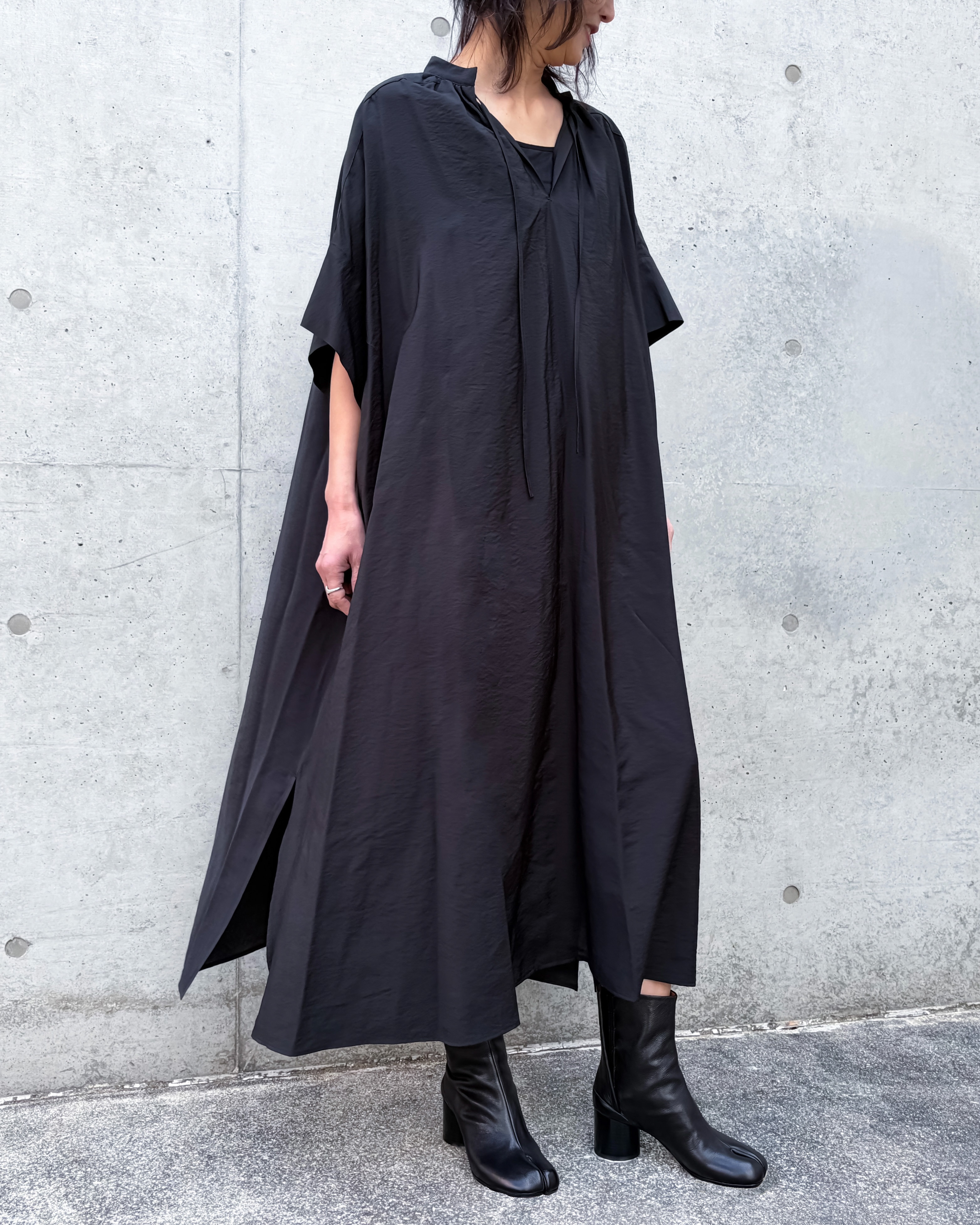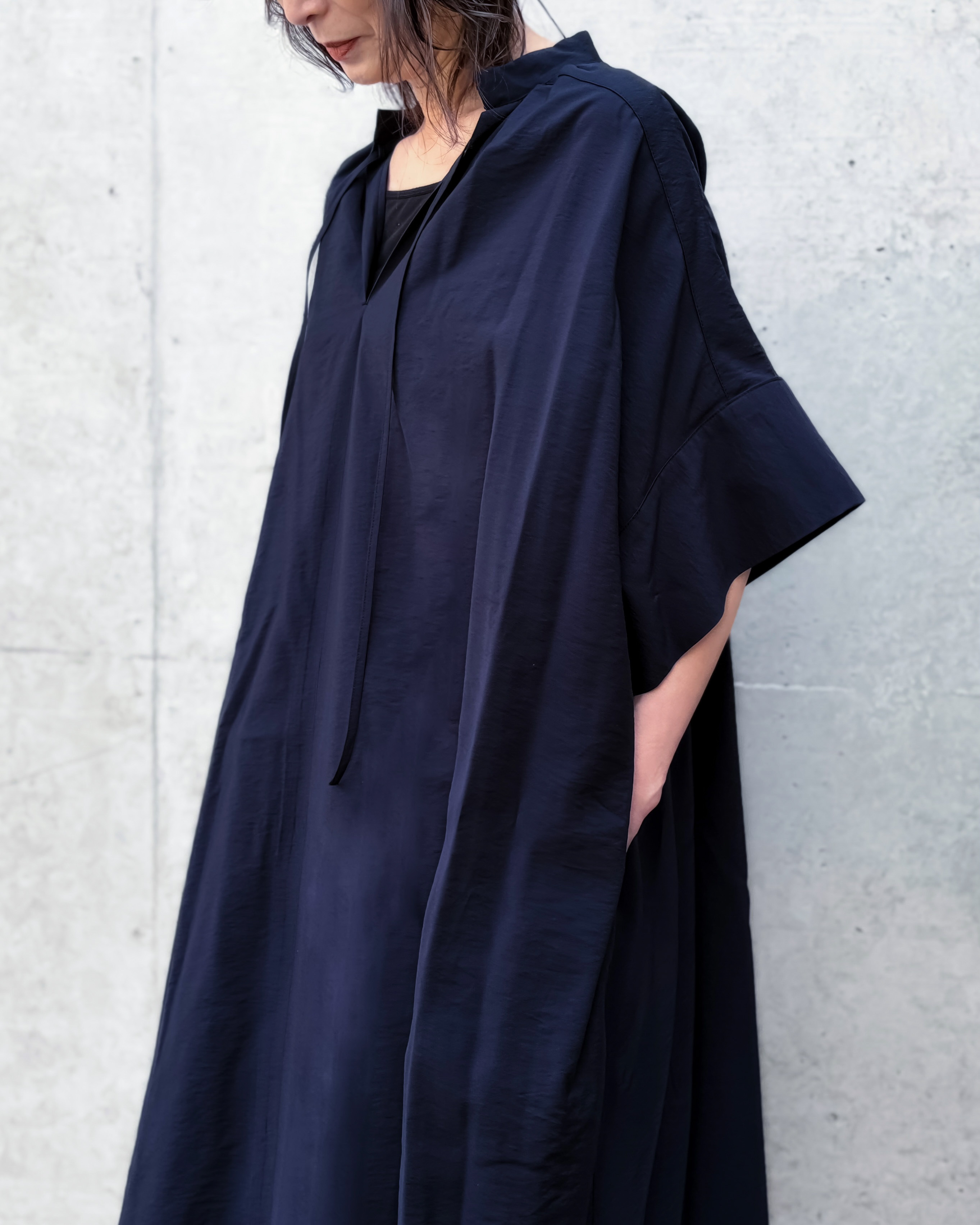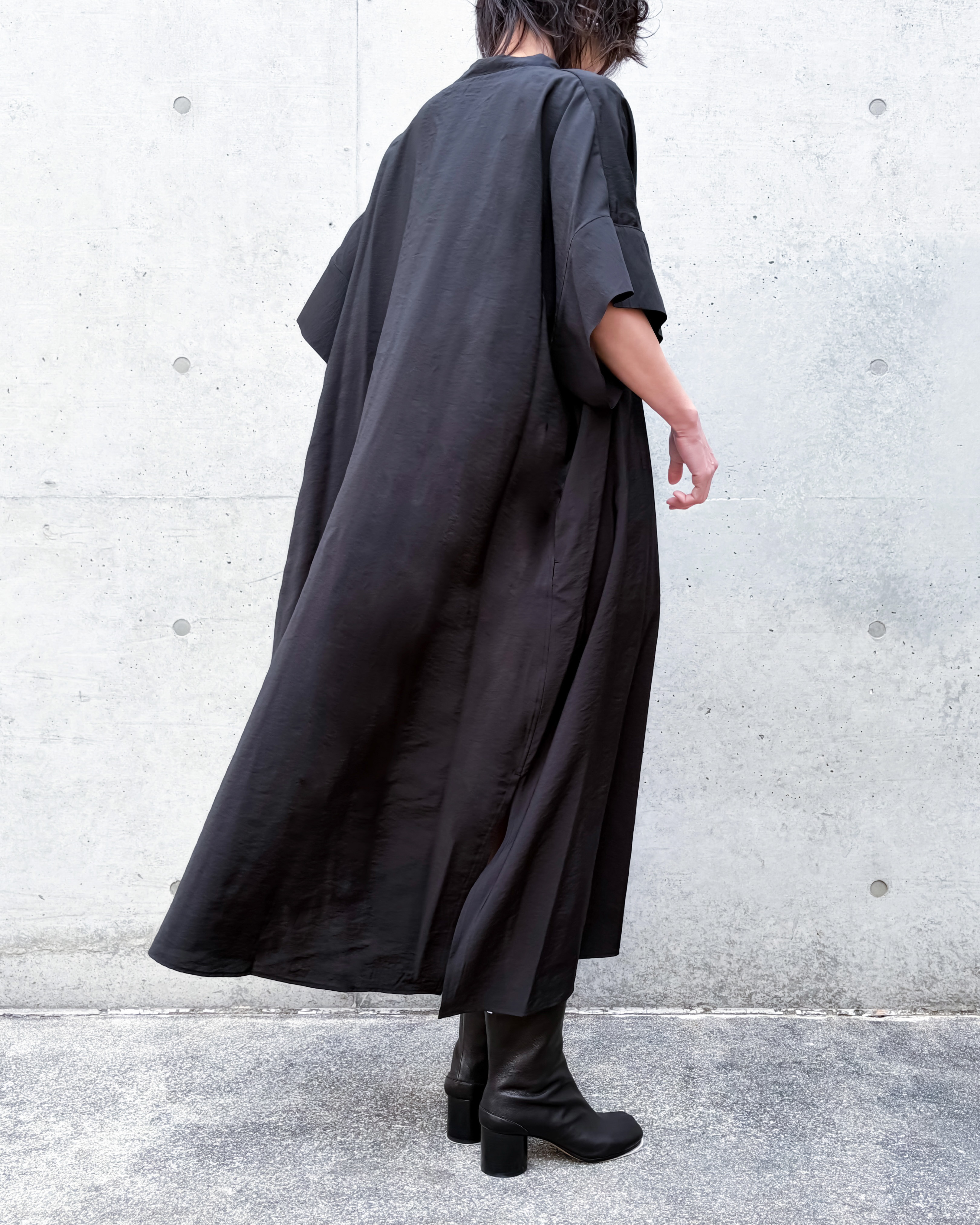 袖はわずかに跳ねるようなフォルムで、腕のラインを自然にぼかしながら洗練された印象を残す。スリット入りの裾が動きやすさを両立。リラックス感とエレガントな印象が両立した1着です。