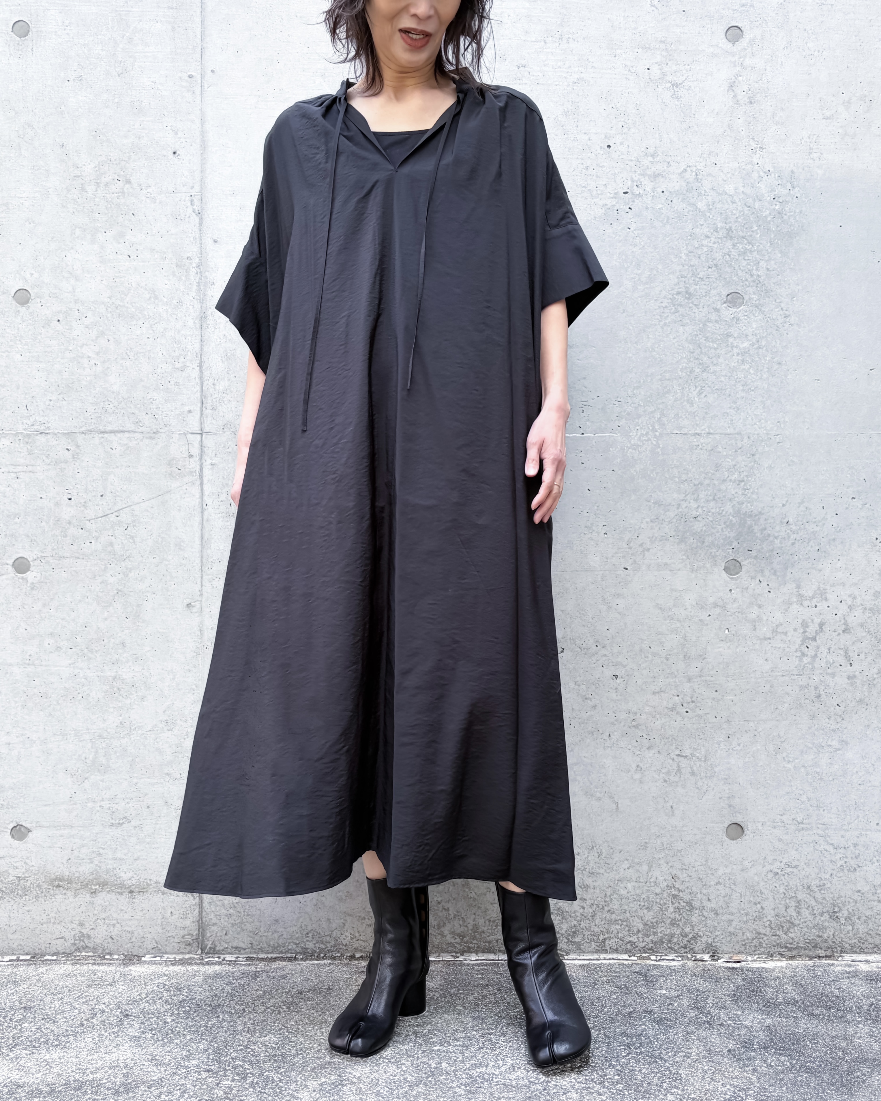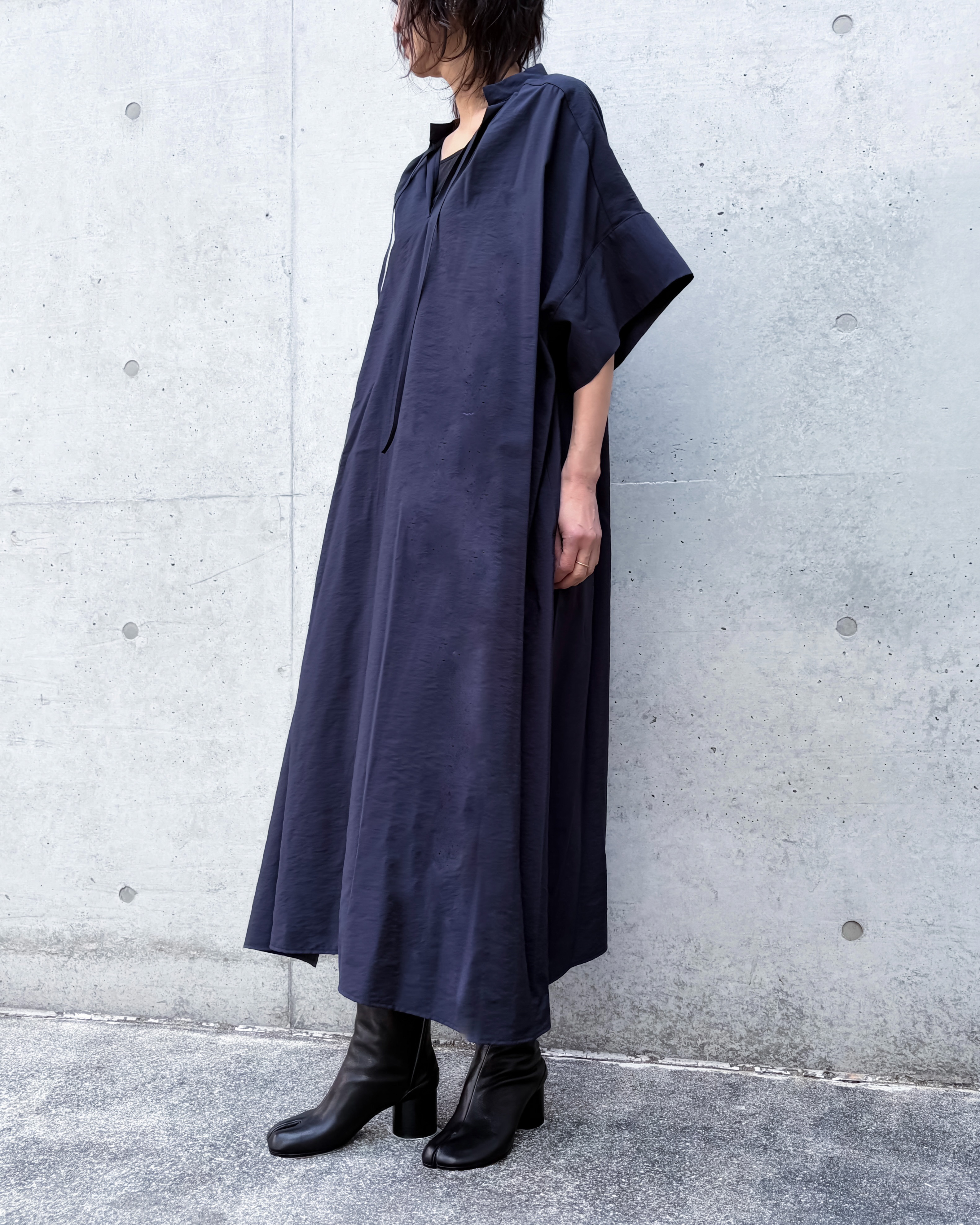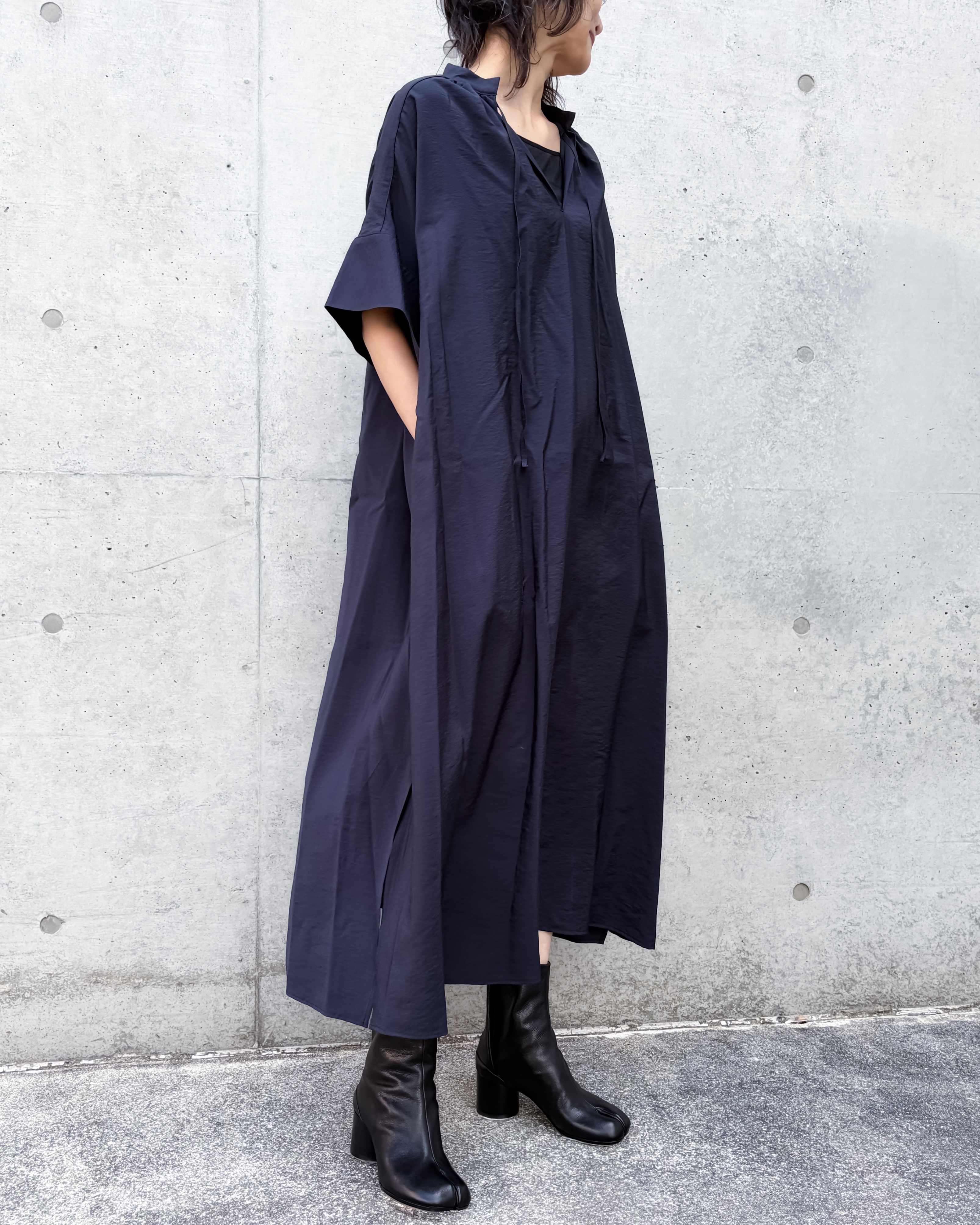 袖はわずかに跳ねるようなフォルムで、腕のラインを自然にぼかしながら洗練された印象を残す。スリット入りの裾が動きやすさを両立。リラックス感とエレガントな印象が両立した1着です。