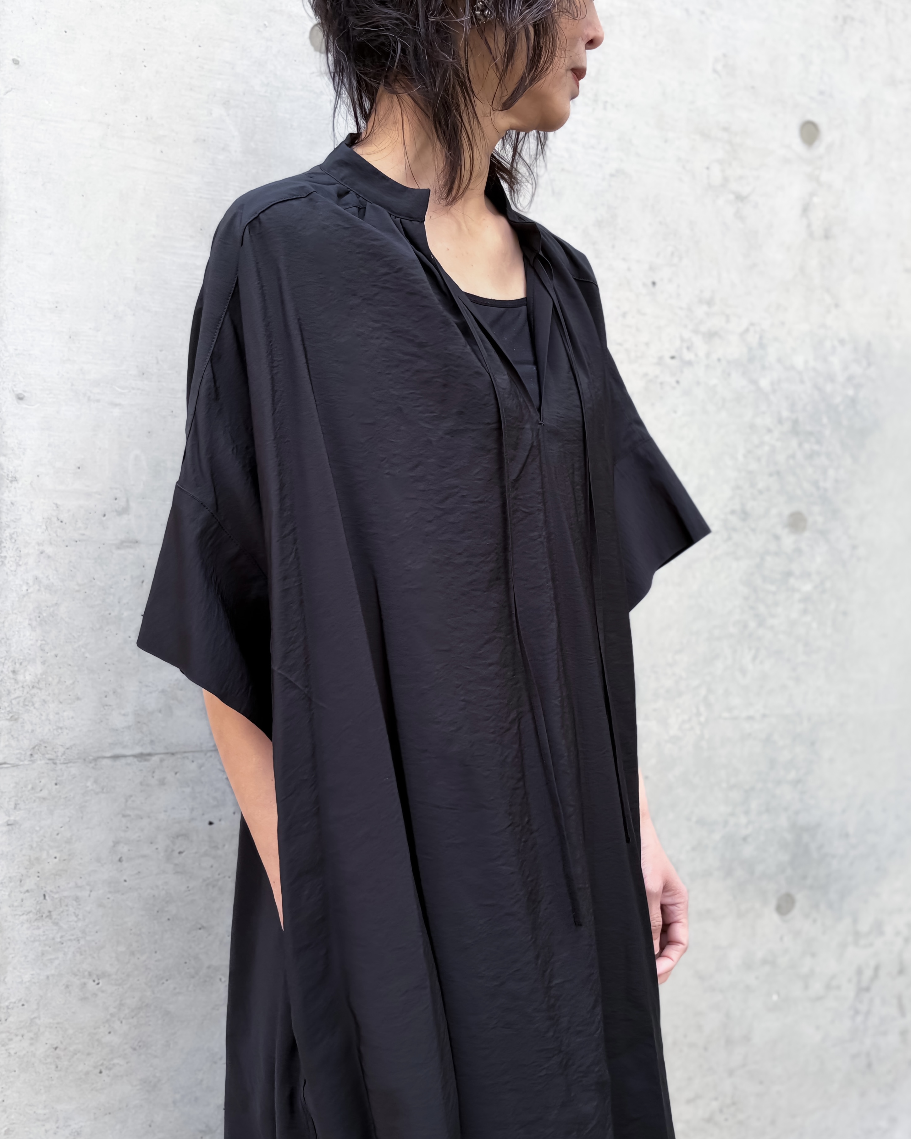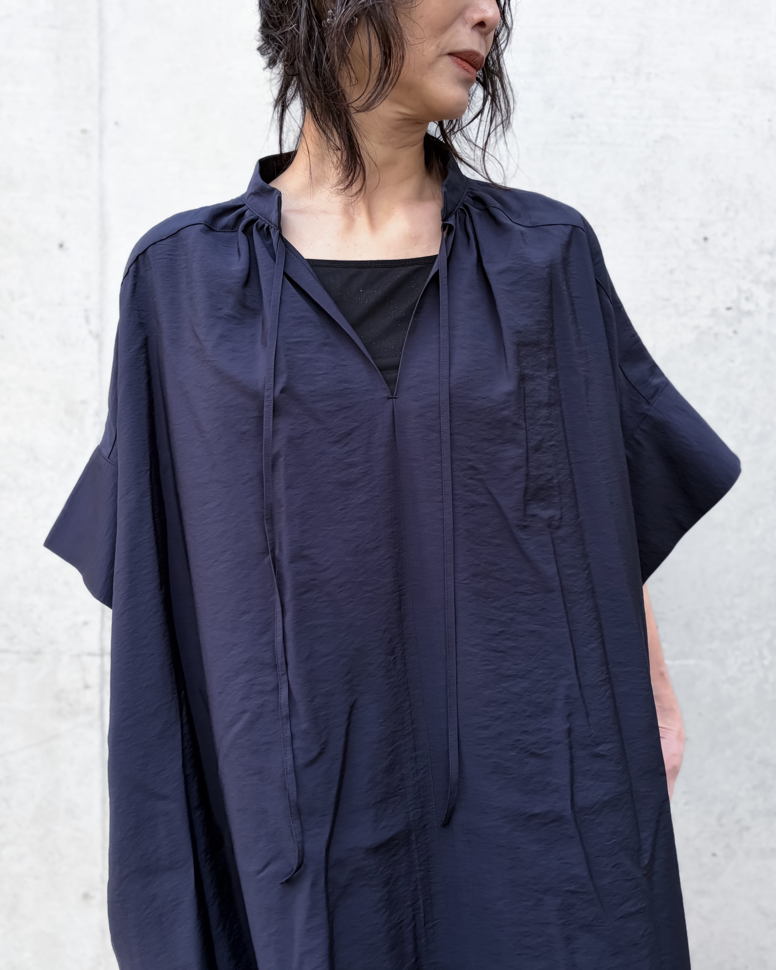 ネックラインを起点にギャザーで分量感を加え、ゆったりとしたボリュームの中に柔らかさを取り入れたフォルム。対して衿周りはシャープに設計し、デコルテラインをすっきりと美しく見せるバランスに。
