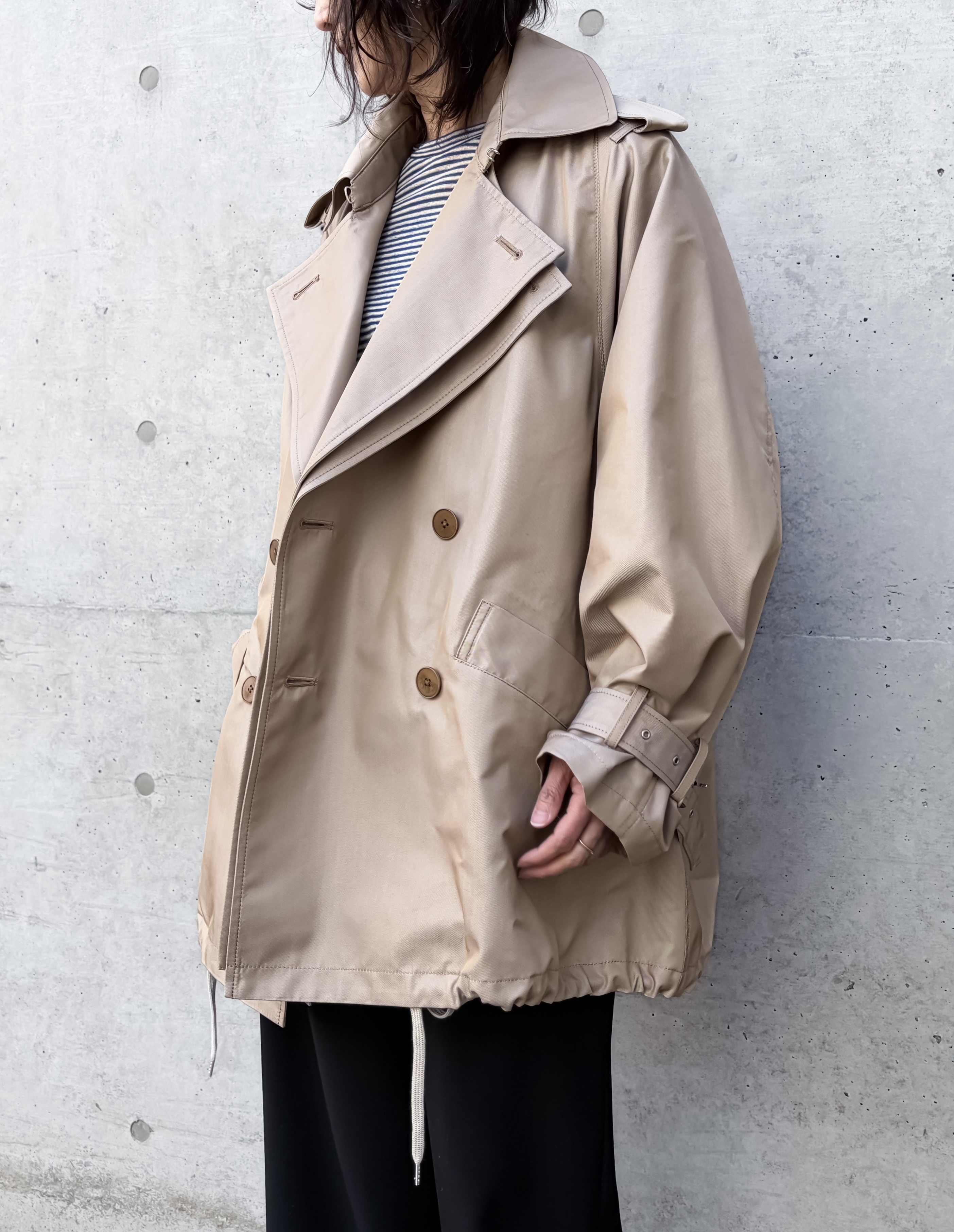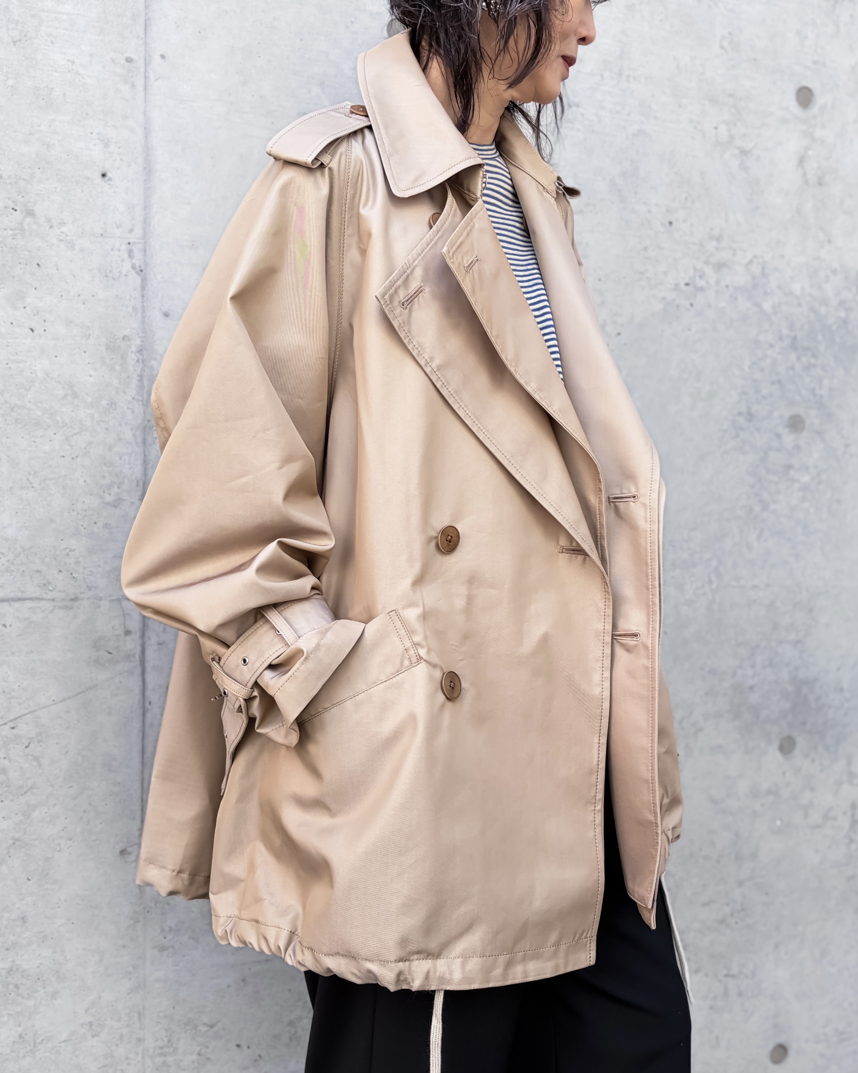 コレクションの中でもひときわ存在感を放つ、ミッド丈のトレンチコートです。