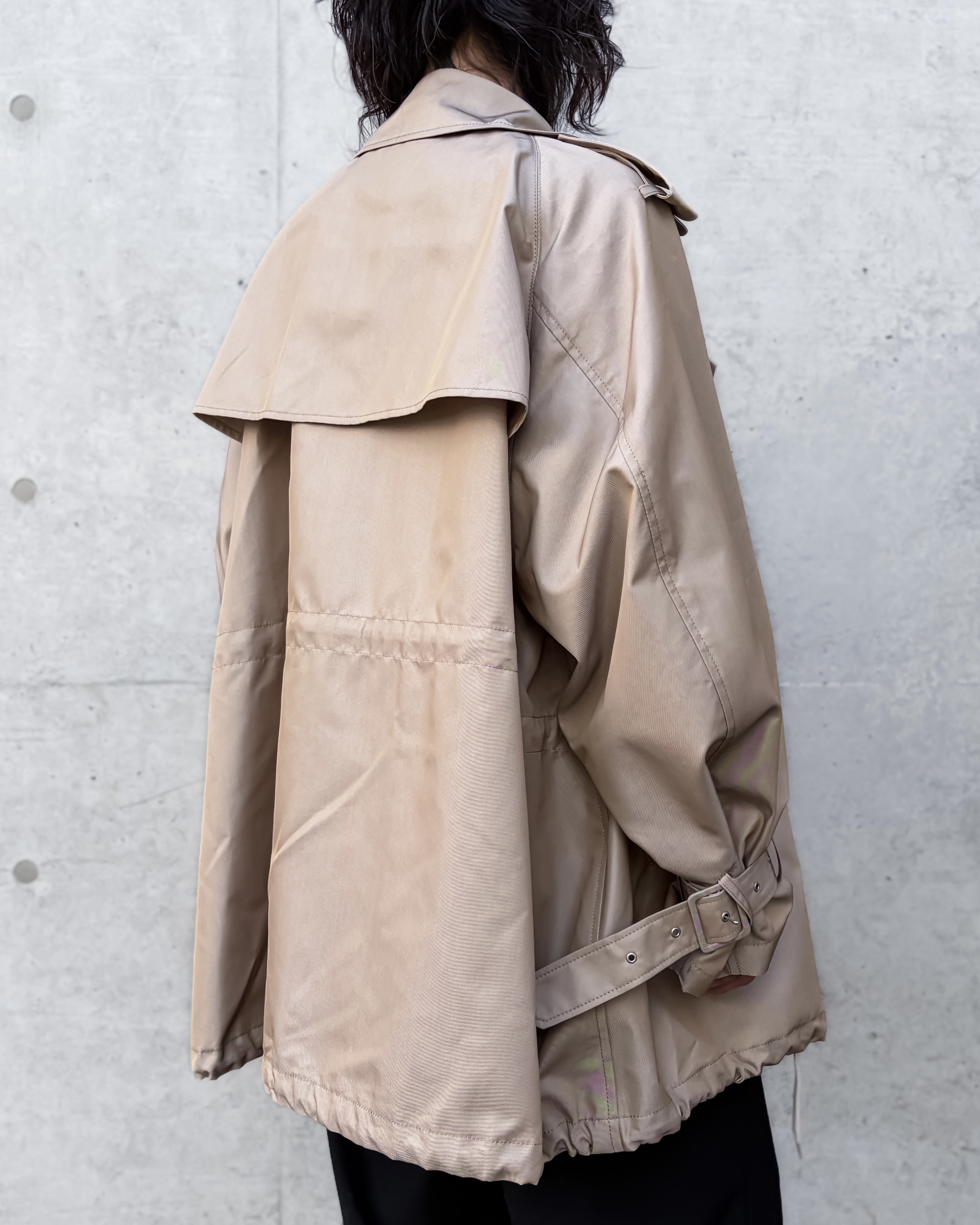 裾にあしらったドローコードで、フォルムにボリュームとギャザーを加え、迫力のある立体感を生み出す。また、ラグランスリーブにはセットインスリーブかのようなラインを描かせることで、身頃のボリュームに対して肩まわりが大きく見えすぎず、全体のバランスを整えている。