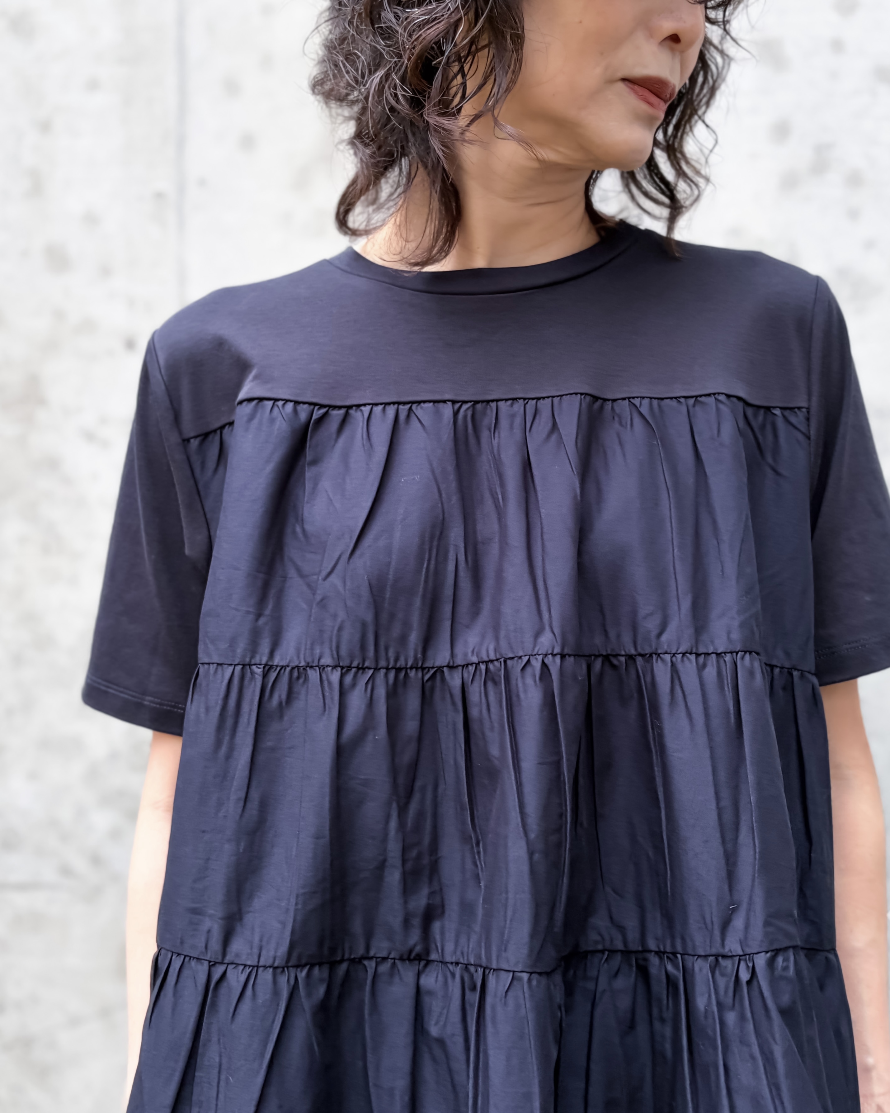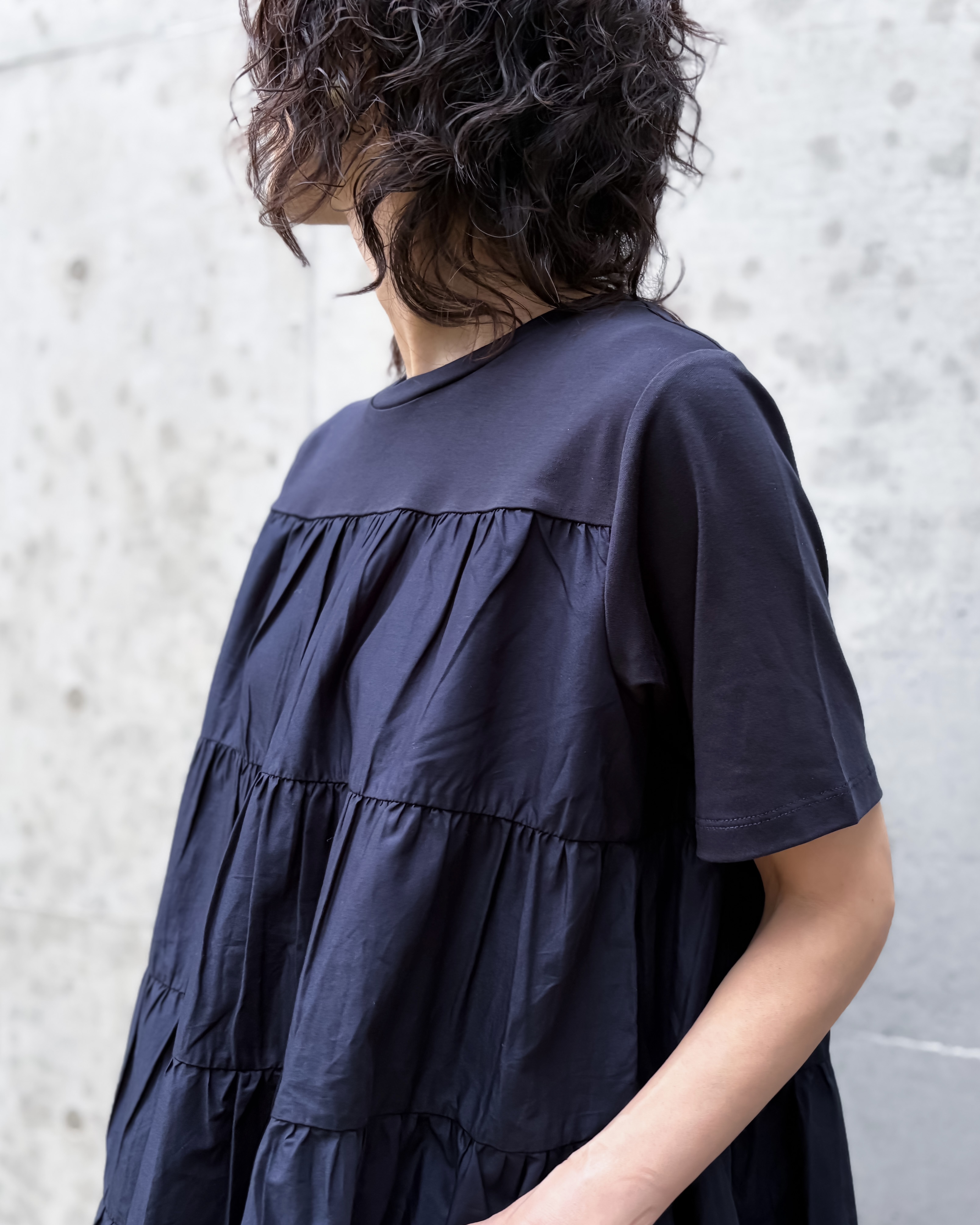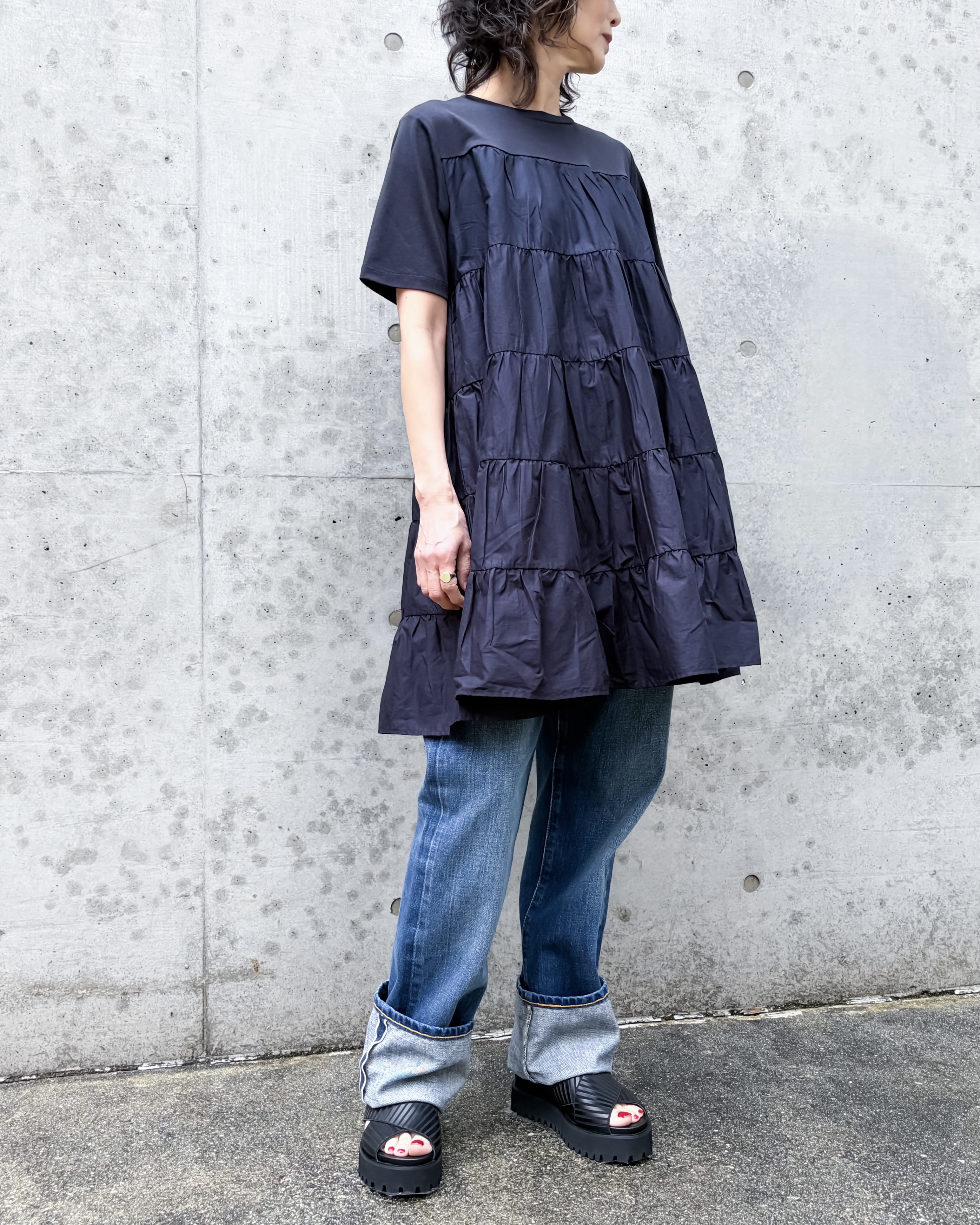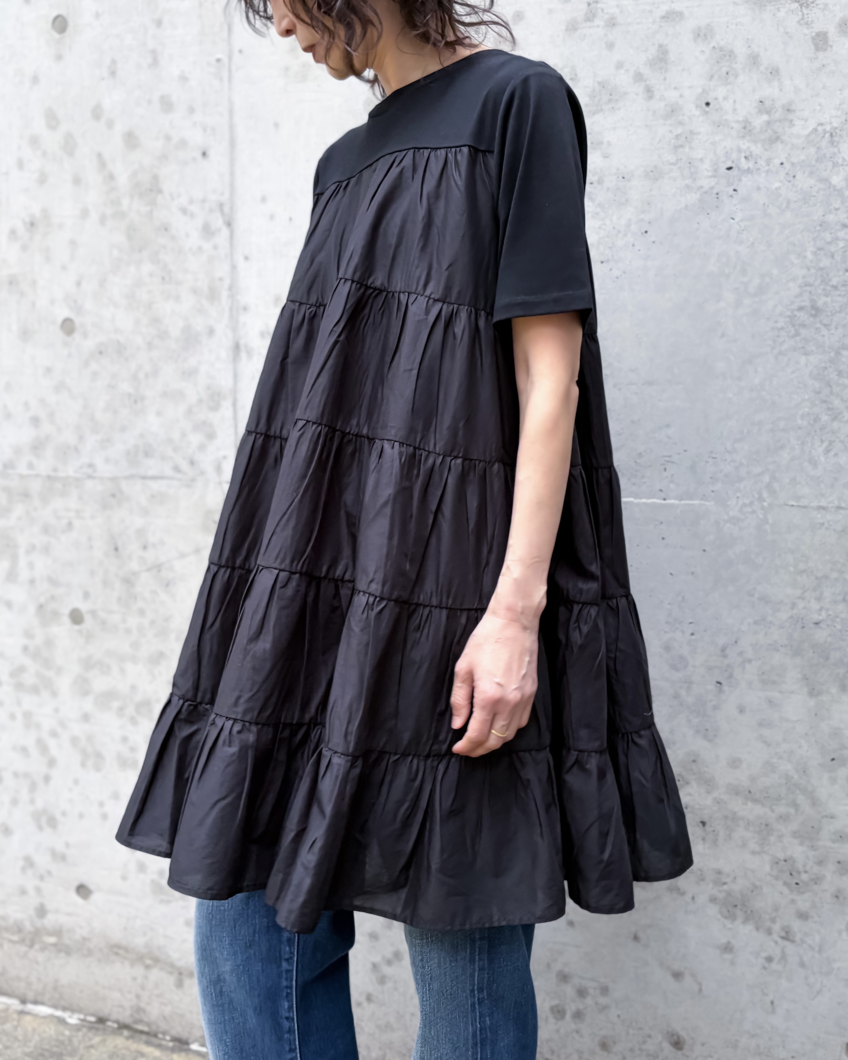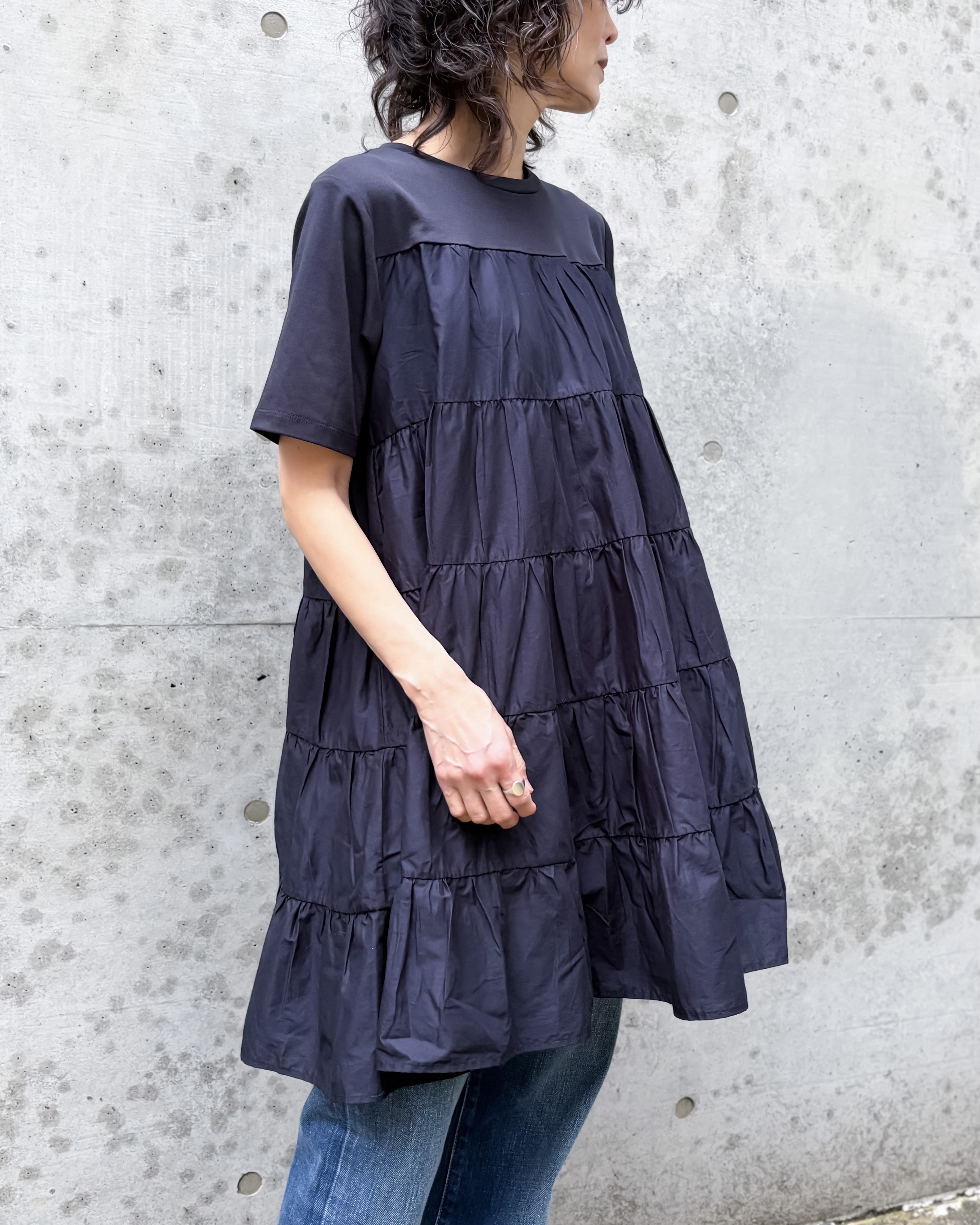 カットソーと布帛生地を組み合わせた、ドッキングデザインのチュニックです。