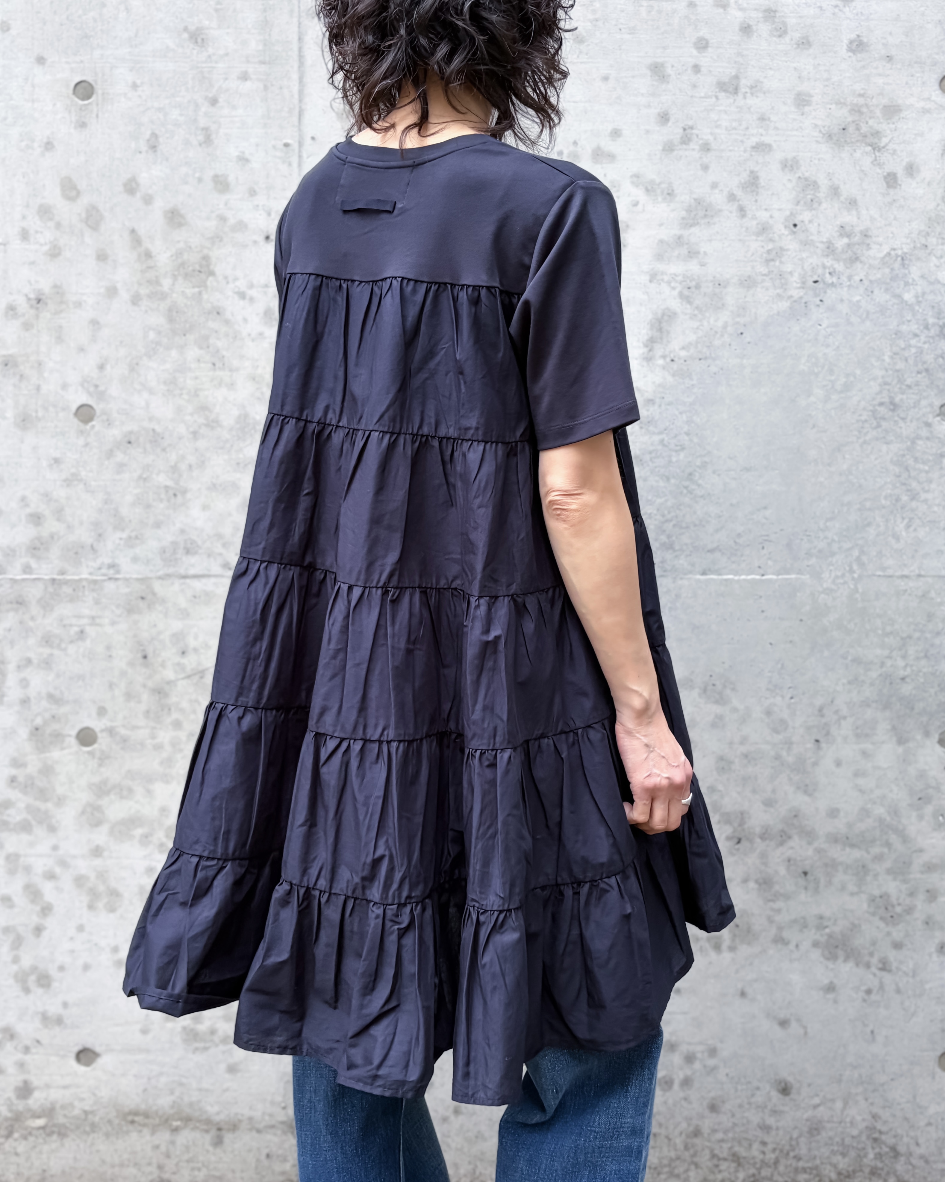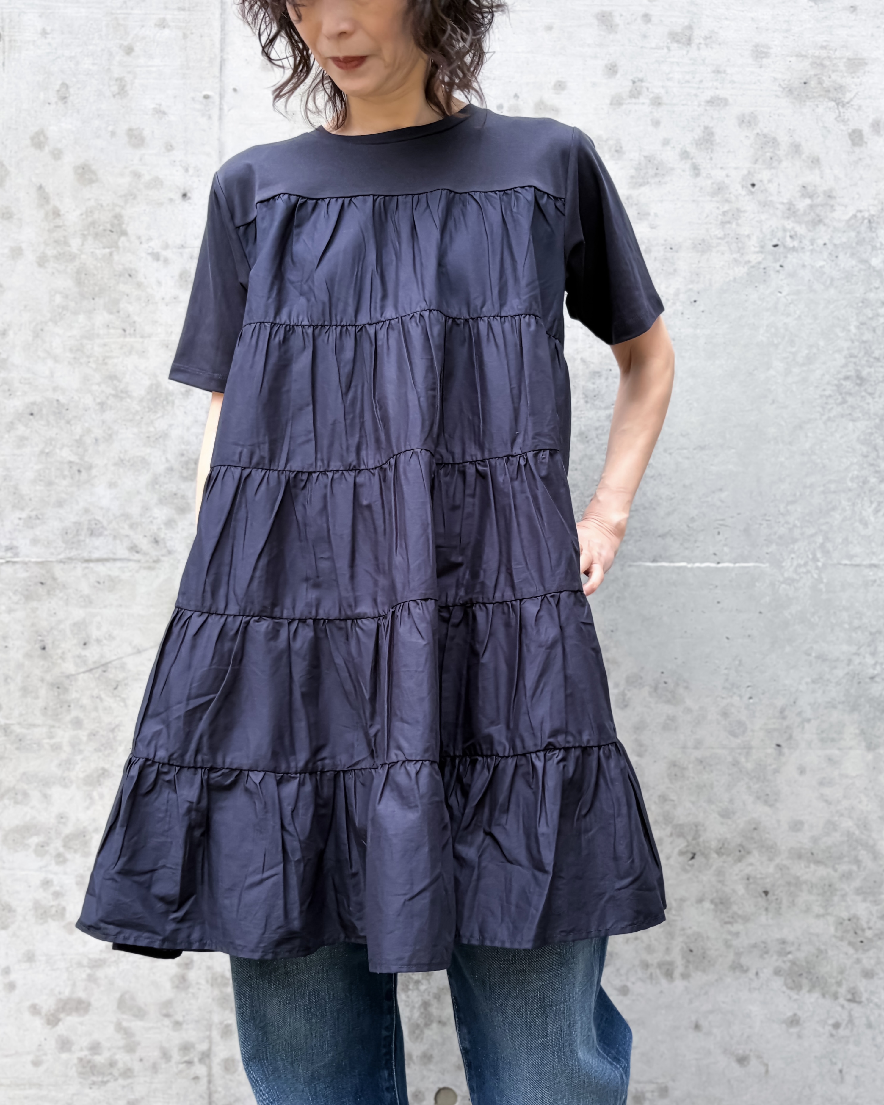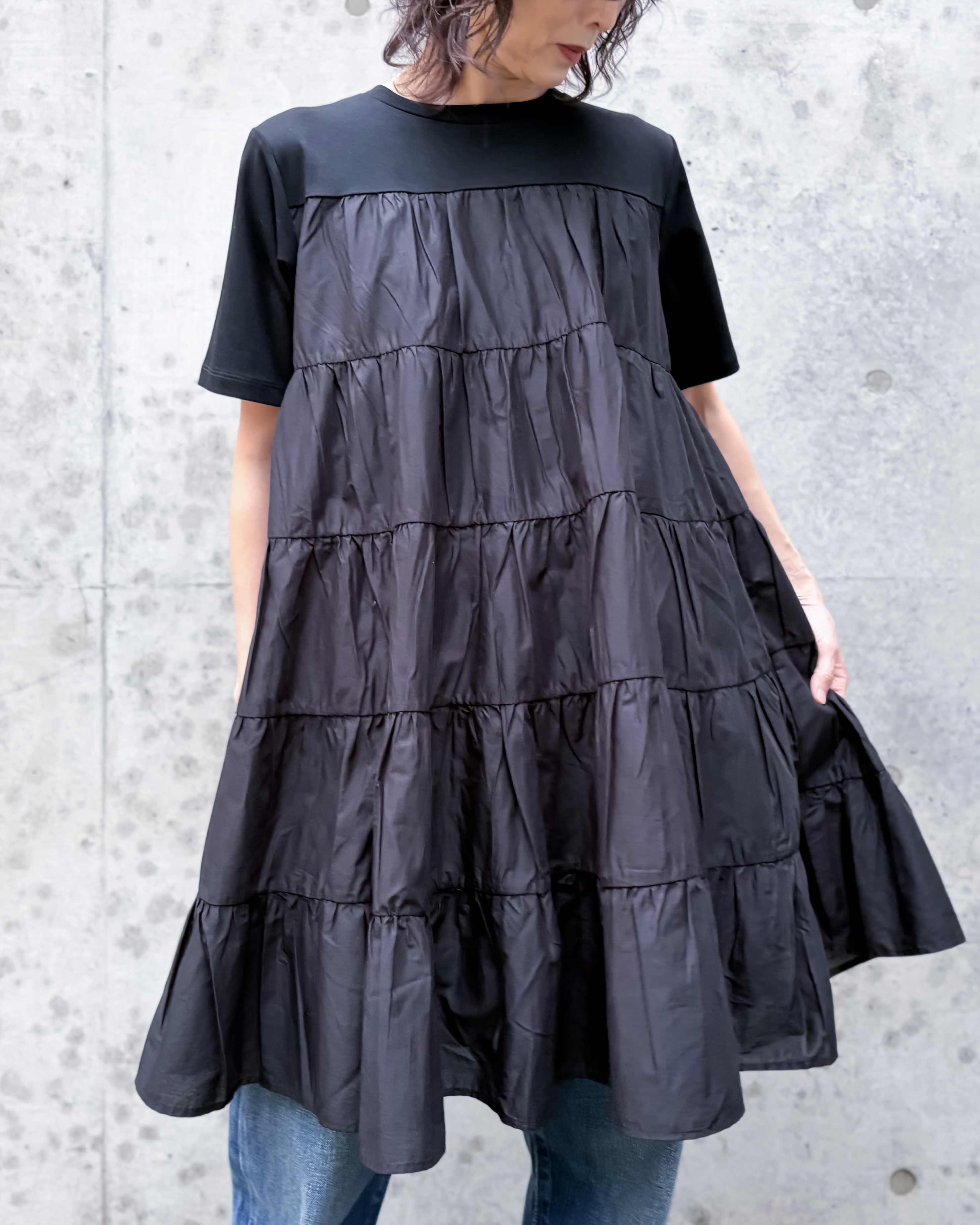 切り替えから下には、エアリーなコットン素材でティアードデザインを施し、動くたびに軽やかに揺れるシルエットが魅力です。