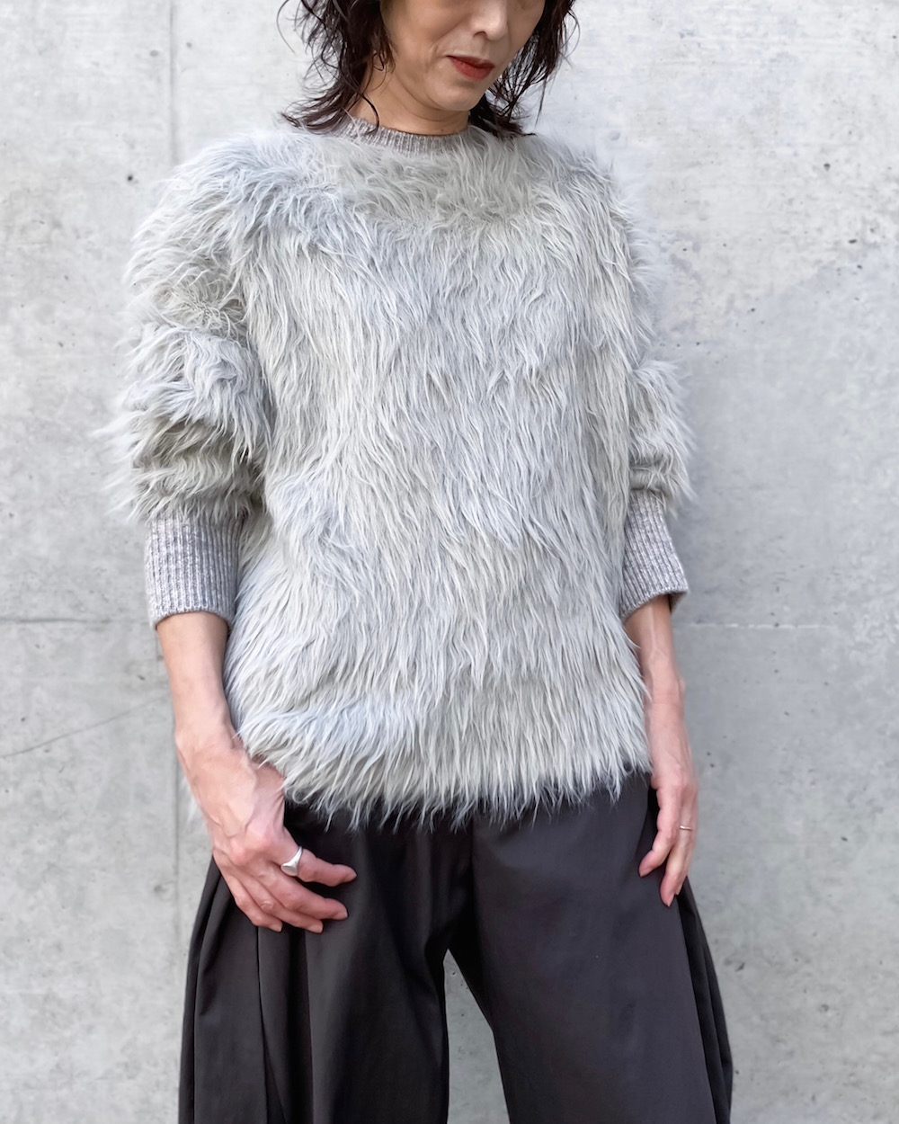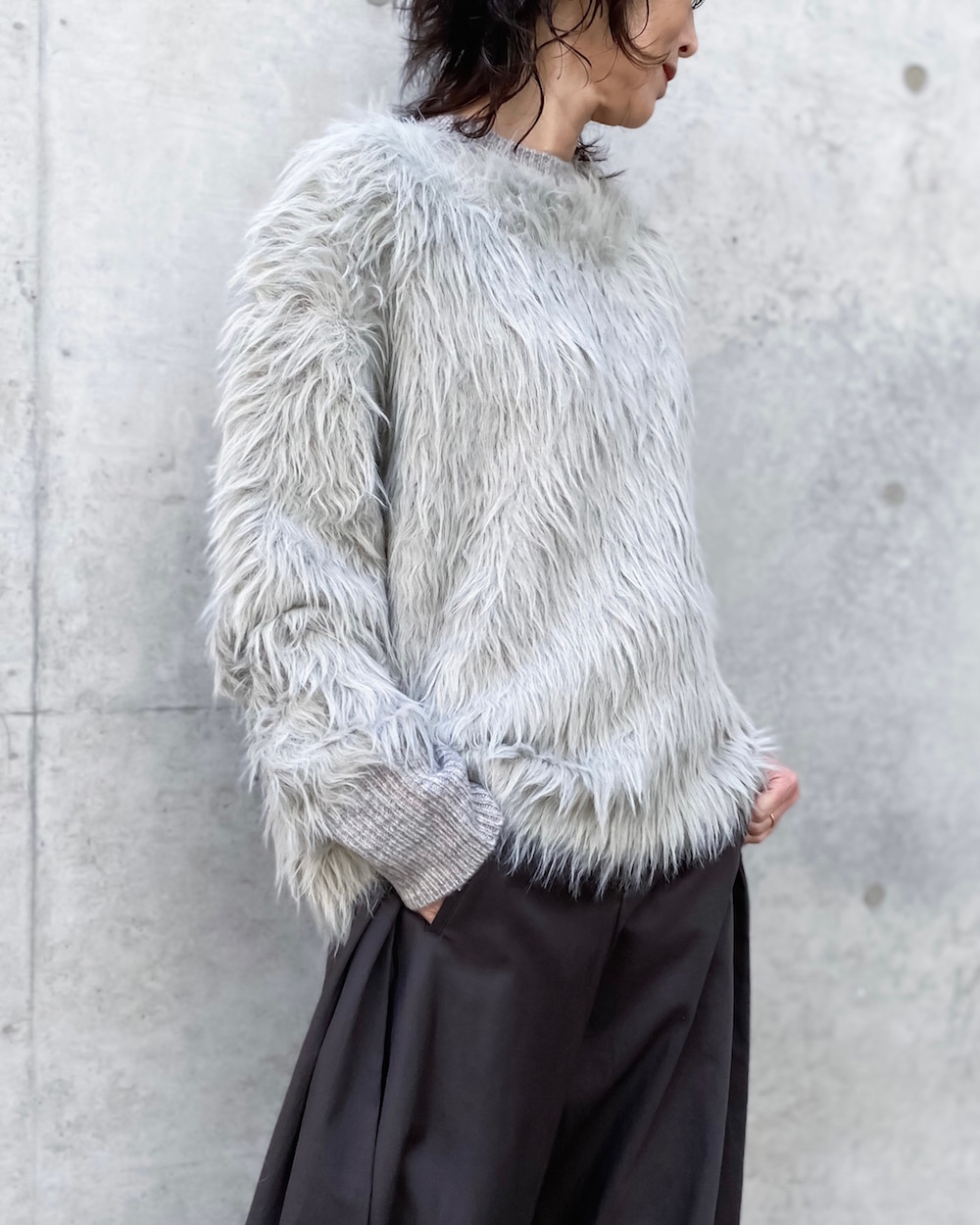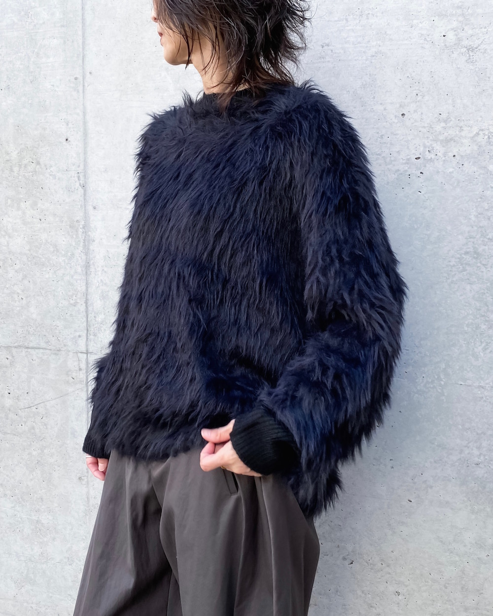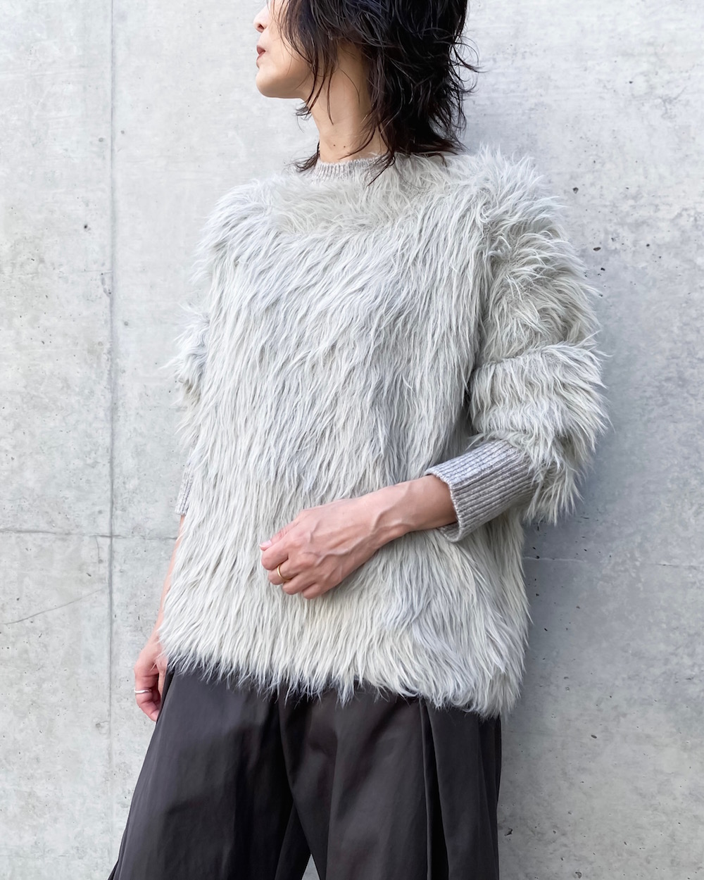 シャギーのへアリーな表情が目を引くボクシーシルエットのクルーネックニットです。リブはストレートヤーンですっきりとさせて、袖口リブにはサムホールを施し親指を出せるデザインです。