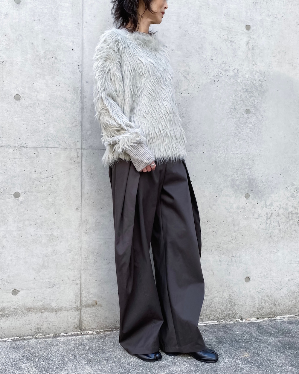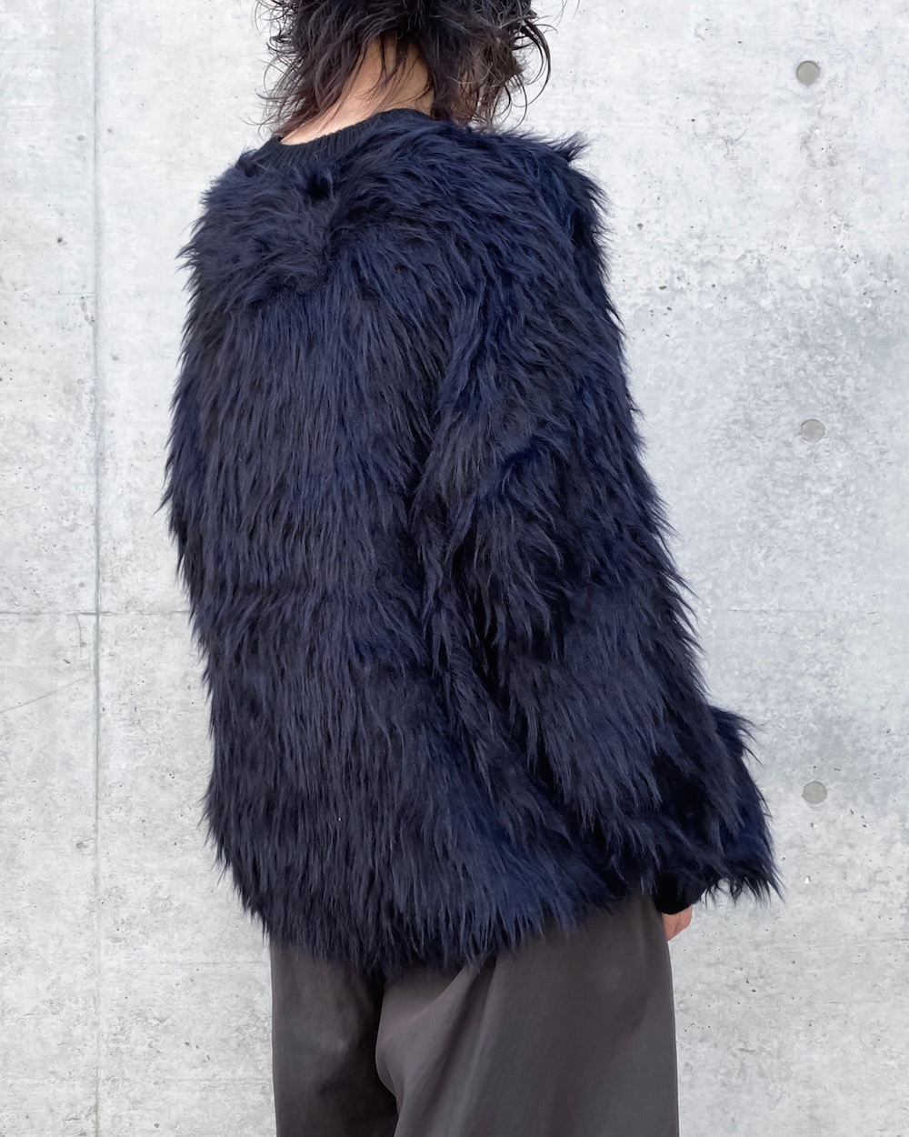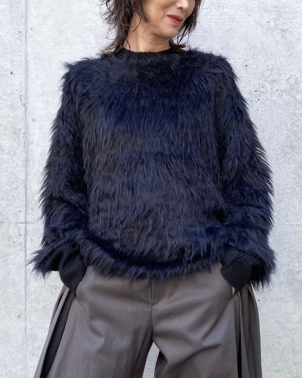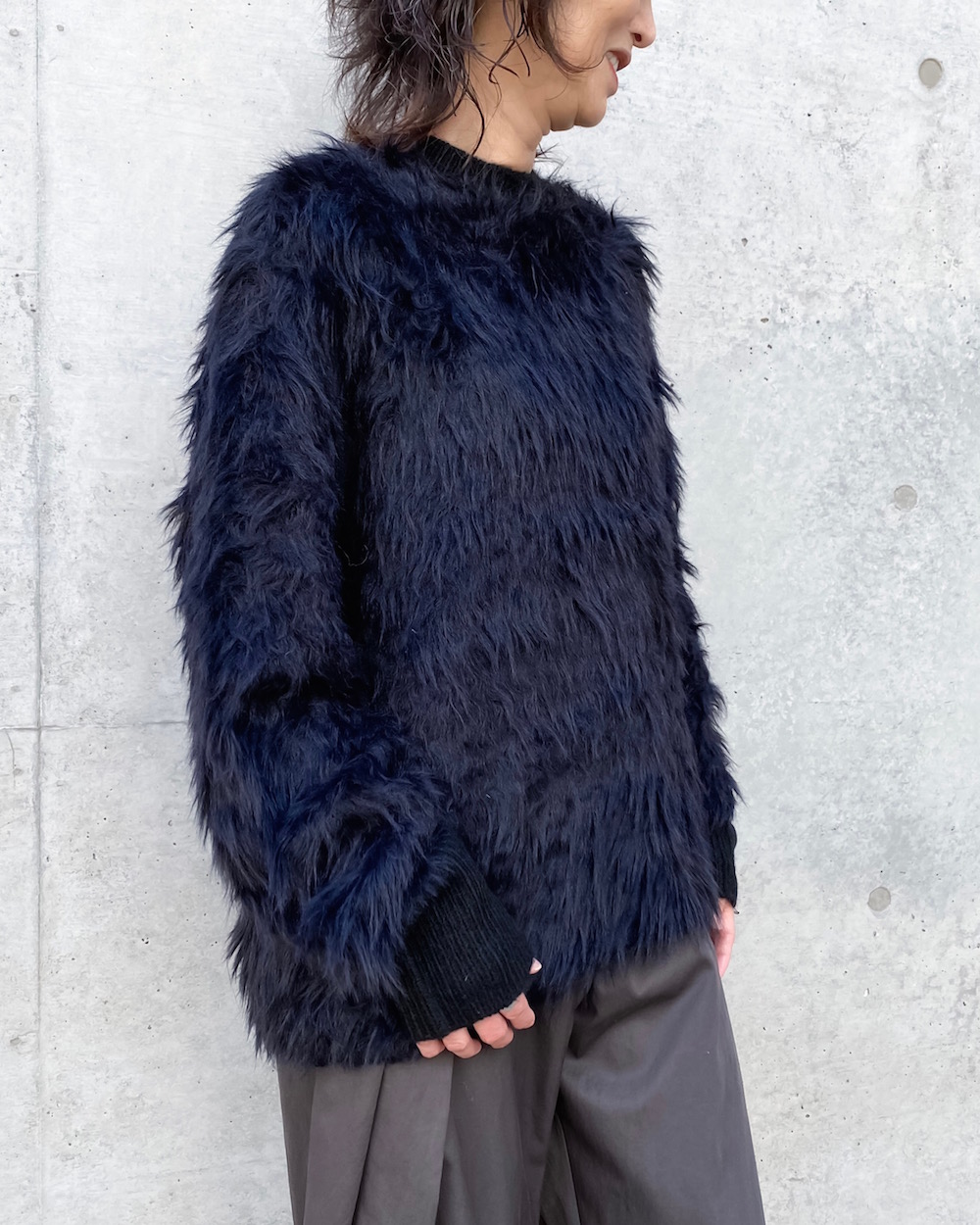 シャギーのへアリーな表情が目を引くボクシーシルエットのクルーネックニットです。リブはストレートヤーンですっきりとさせて、袖口リブにはサムホールを施し親指を出せるデザインです。