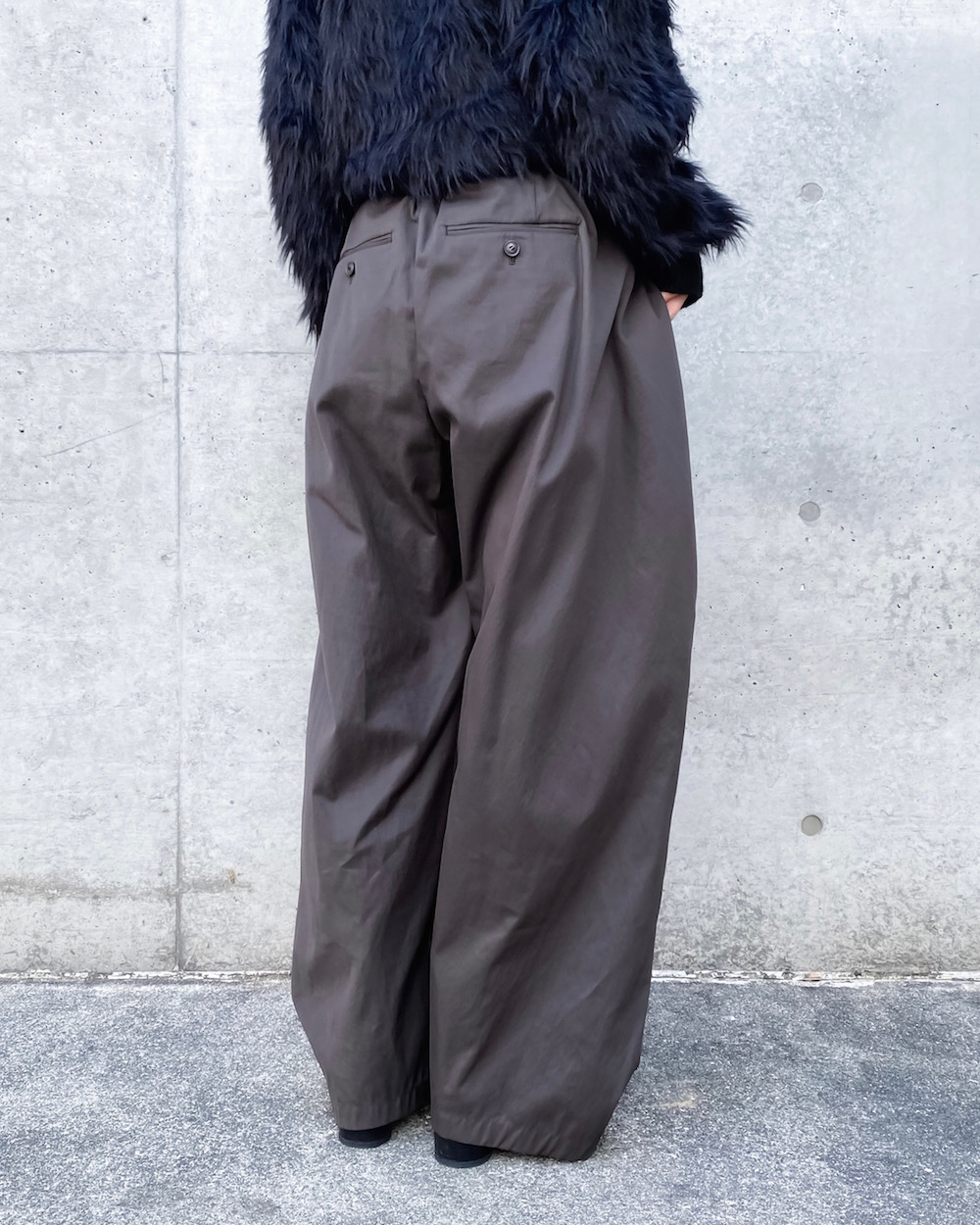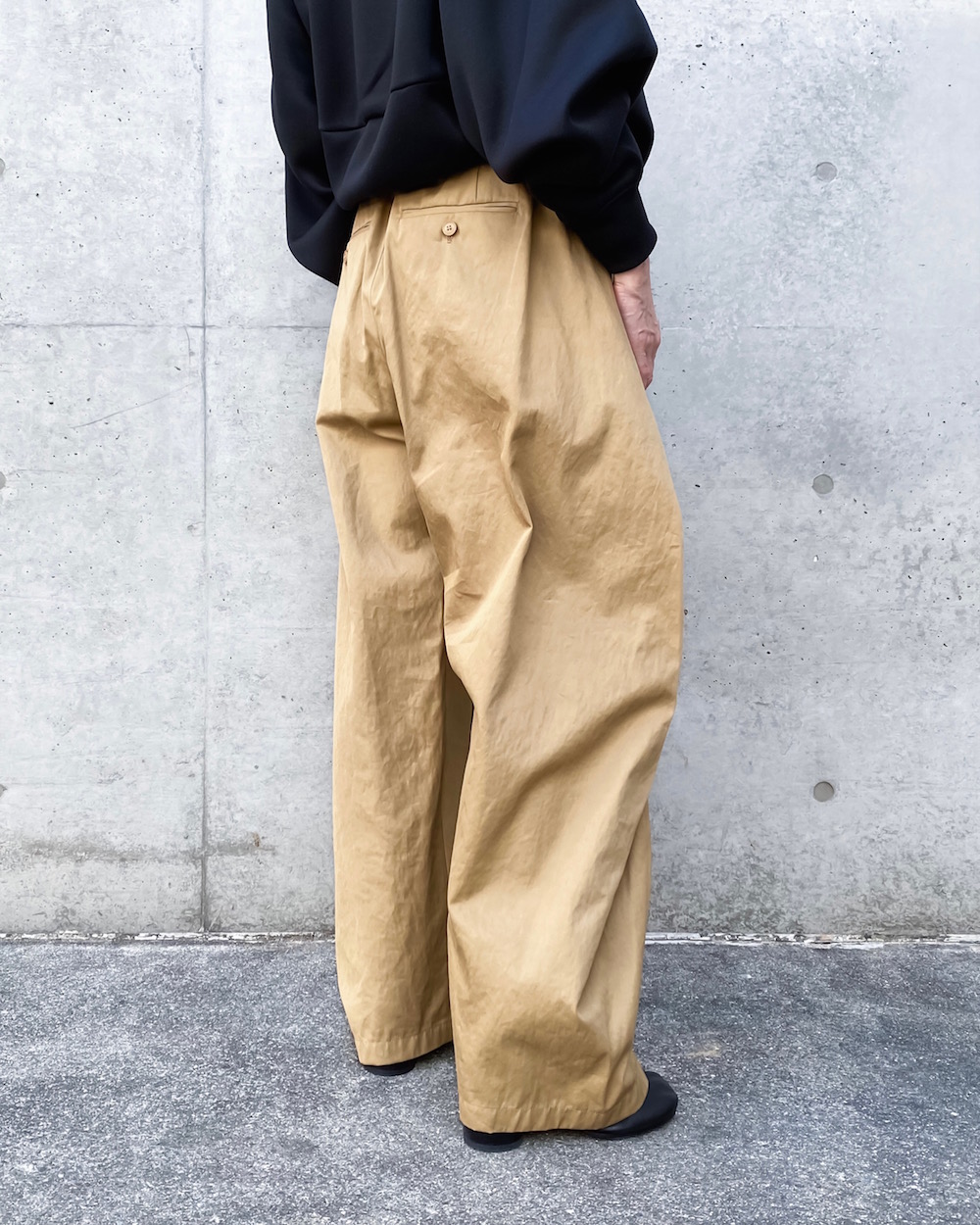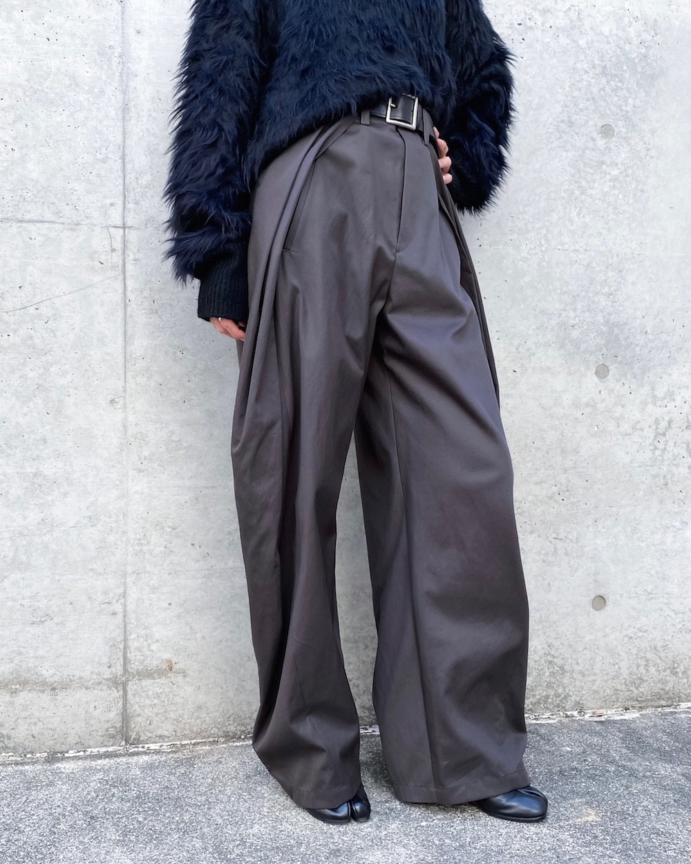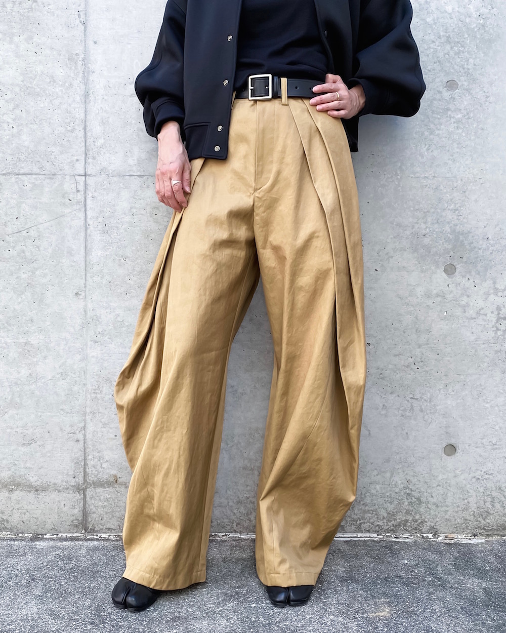 ウエストを畳んだように大きなタックを2本入れてシルエットをつくったデザインのパンツです。独特なタックのラインが引き立つデザインで裾にかけてテーパードしています。