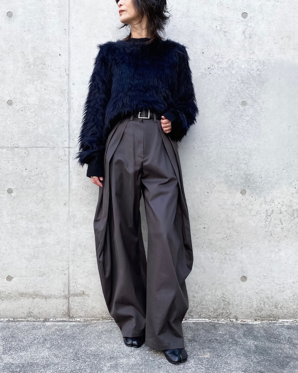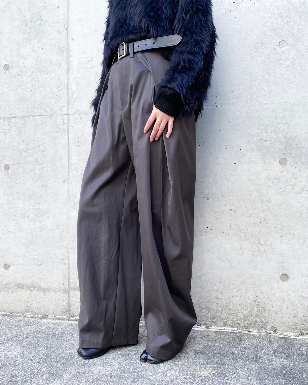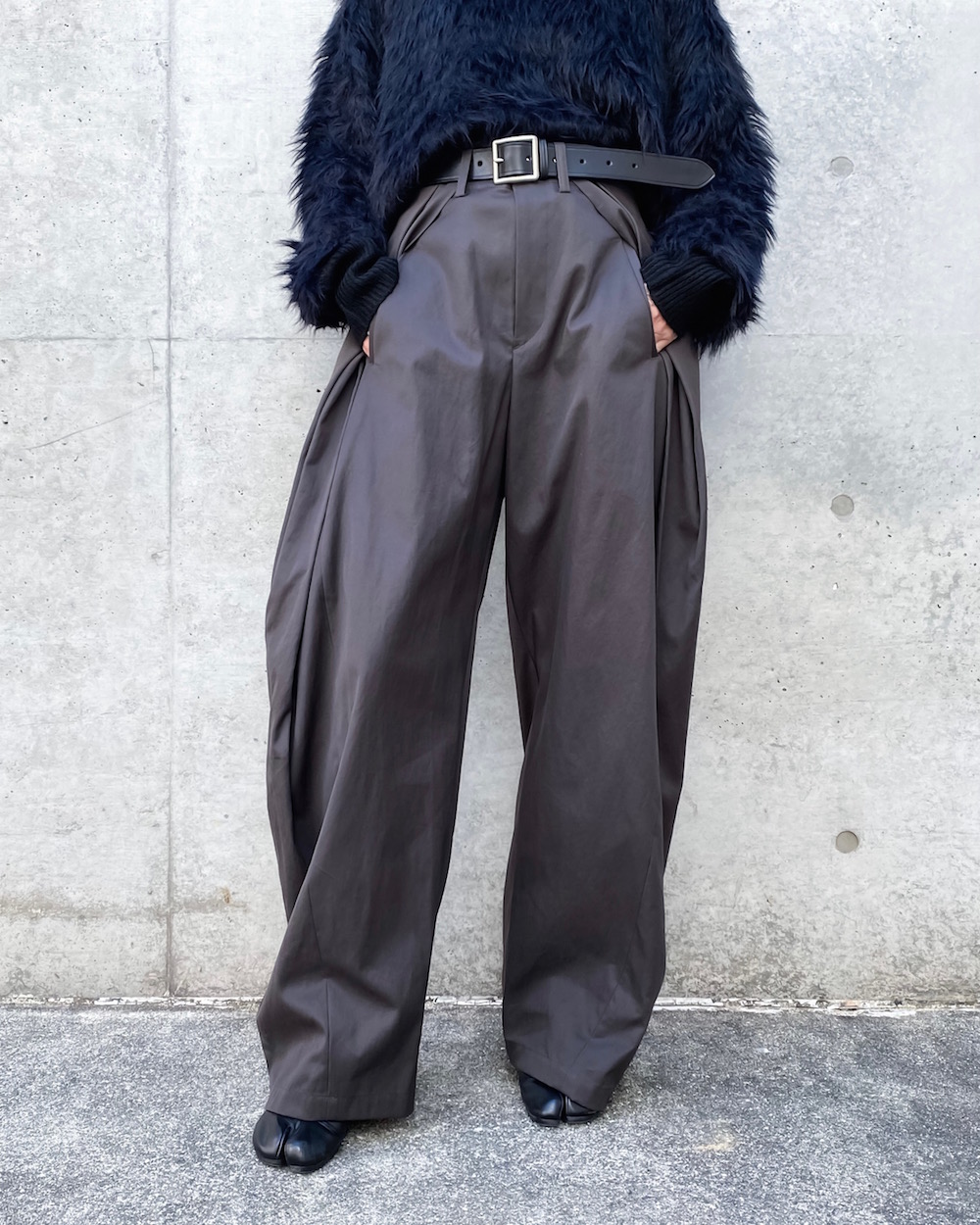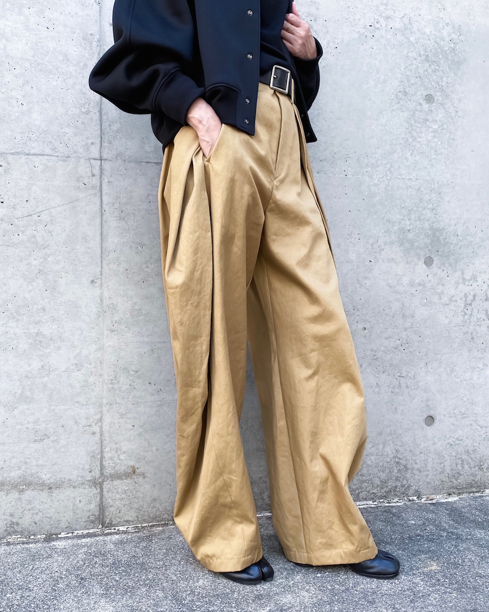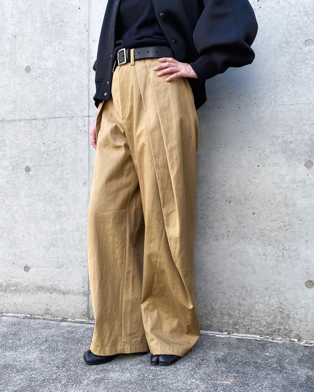 ウエストを畳んだように大きなタックを2本入れてシルエットをつくったデザインのパンツです。独特なタックのラインが引き立つデザインで裾にかけてテーパードしています。