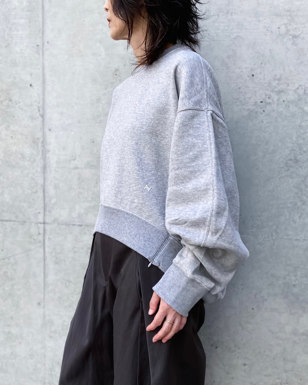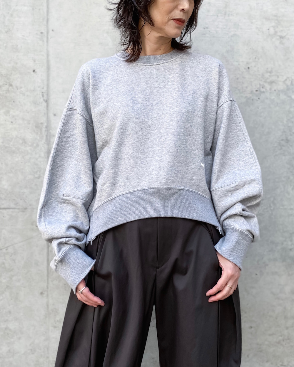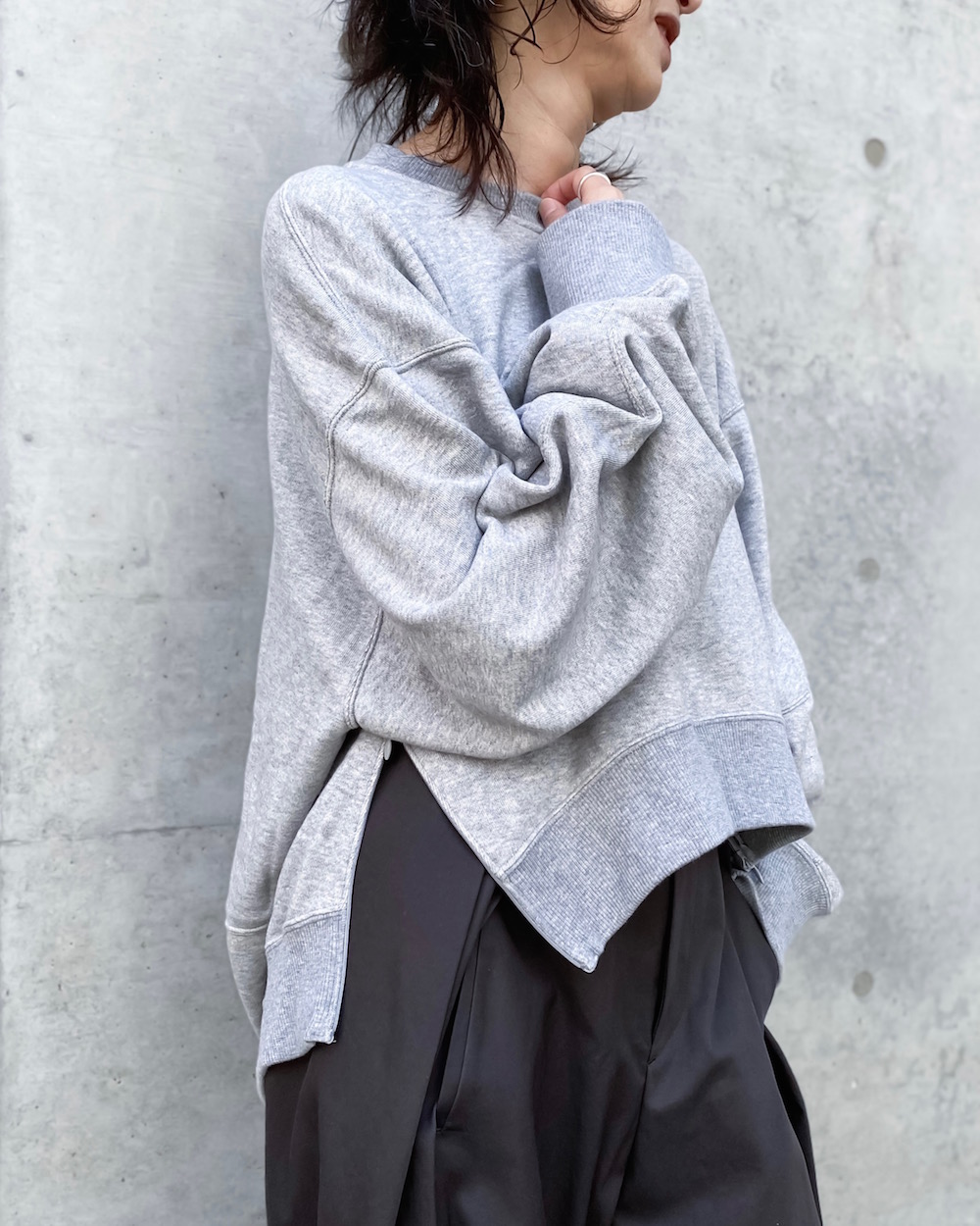 着丈の前後差を極端につけたゆったりシルエットのクルーネックスウェットです。サイドのファスナーを開けるとシルエットが強調されるデザインです。裾にあしらったオリジナルプレートや袖に施したダーツもさりげないこだわりポイントです。
