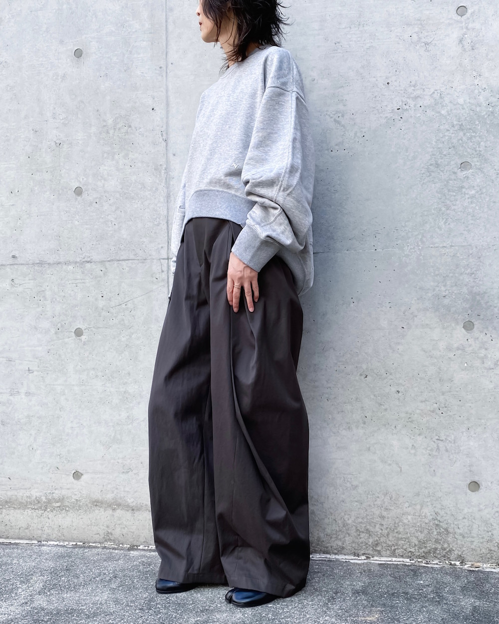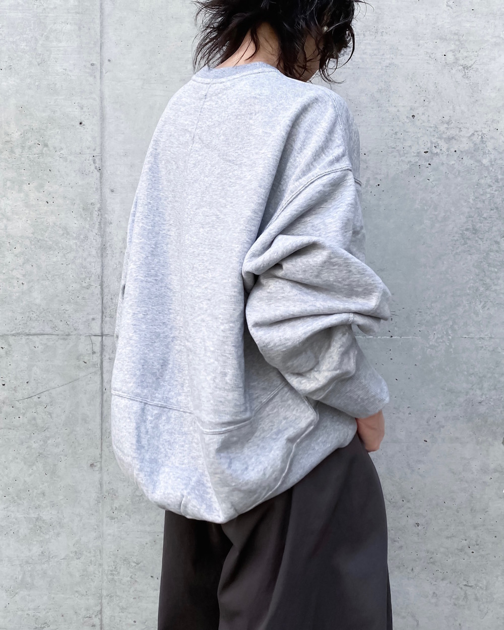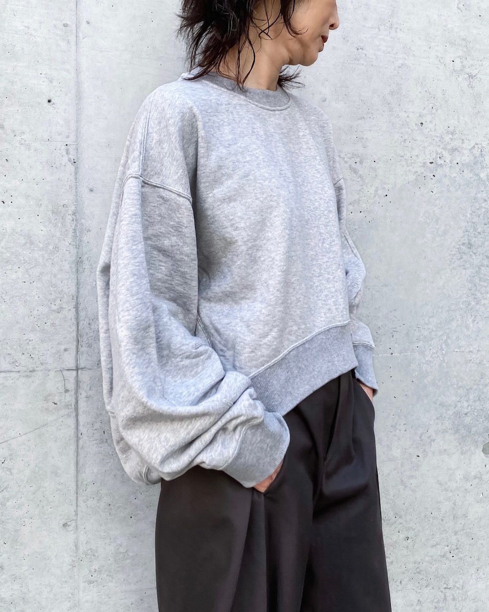 着丈の前後差を極端につけたゆったりシルエットのクルーネックスウェットです。サイドのファスナーを開けるとシルエットが強調されるデザインです。裾にあしらったオリジナルプレートや袖に施したダーツもさりげないこだわりポイントです。