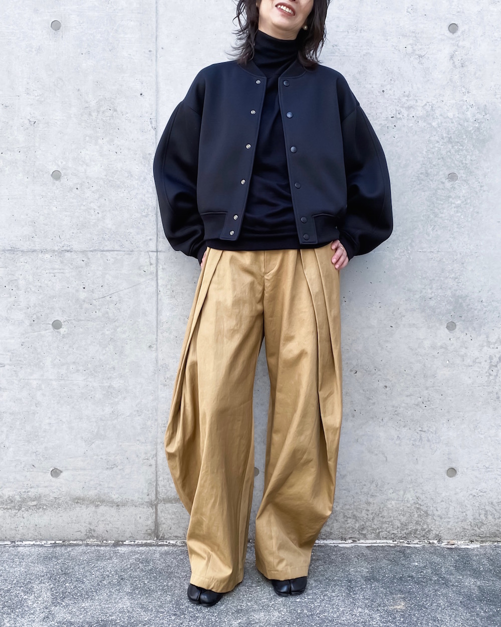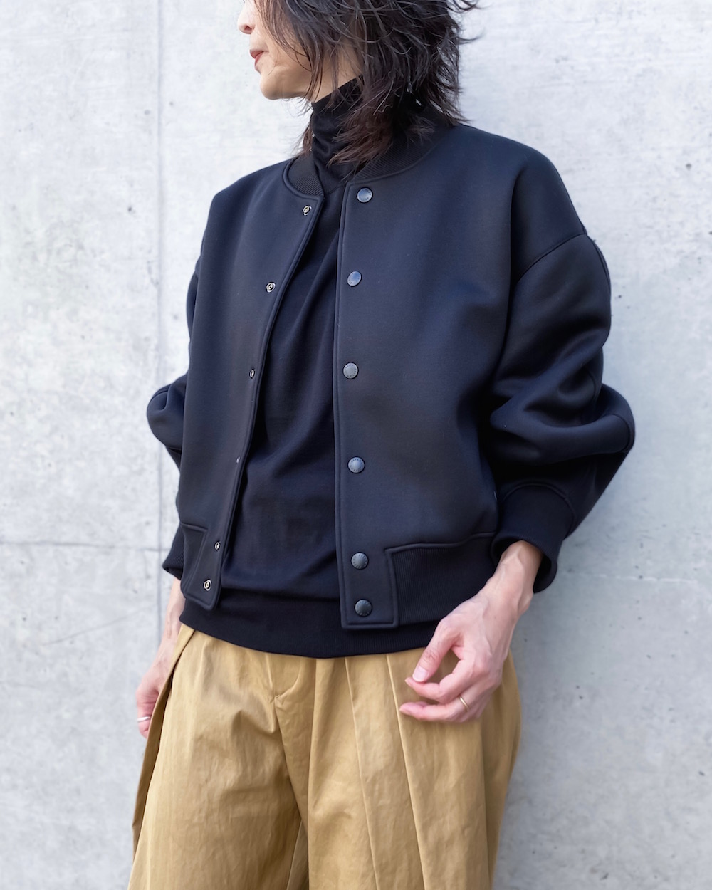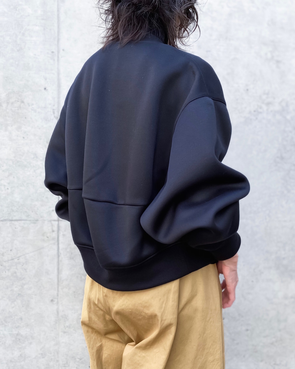 太めのアームホール、バックに切り替えを入れて丸みのあるシルエットに仕上げたボンバー風ブルゾンです。