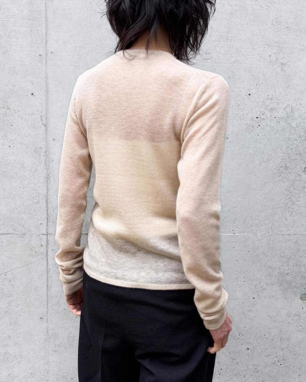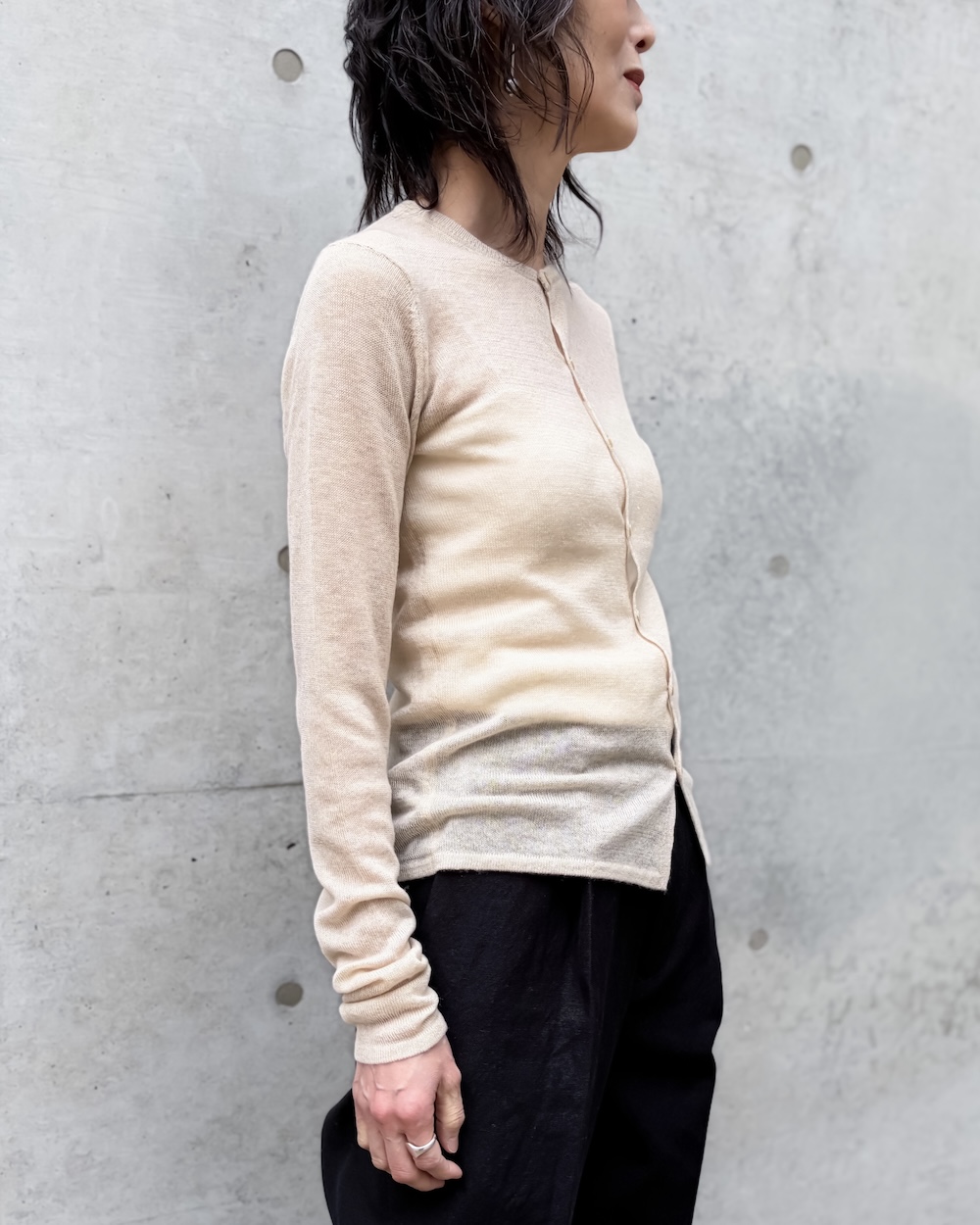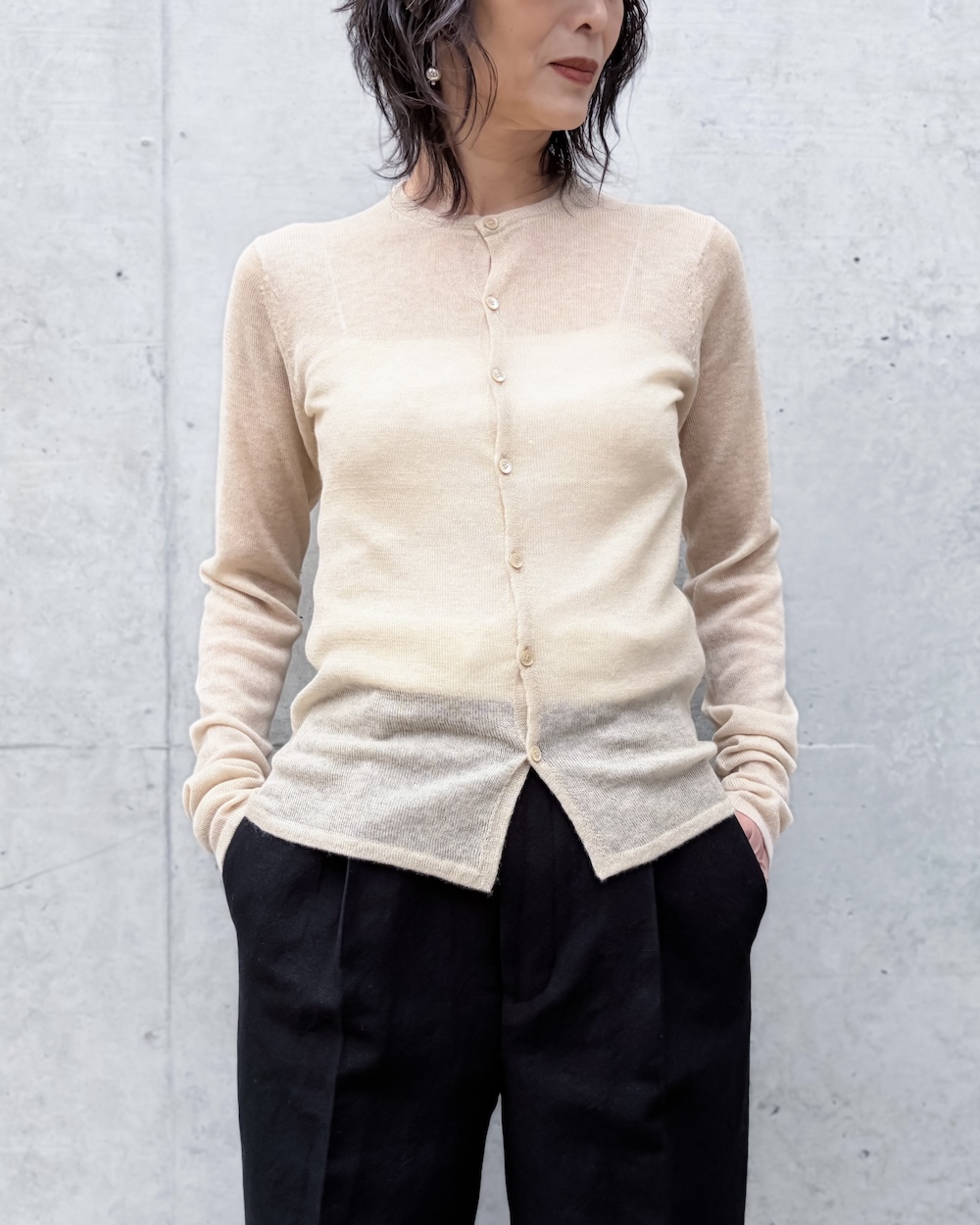 紡毛のような柔らかさを持ちながら、さらりとしたタッチと柔らかな透け感も兼ね備えており、通年で着用いただけるよう軽やかに仕上げています。