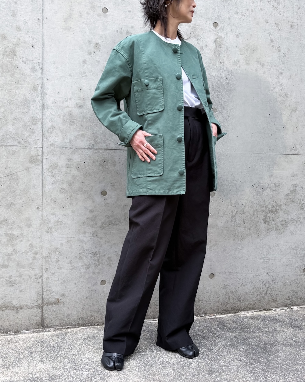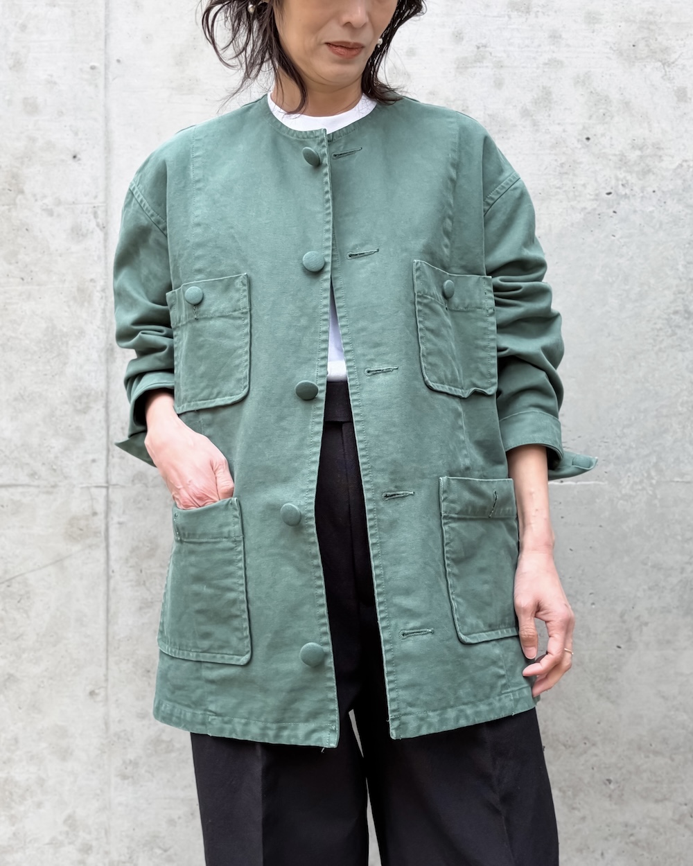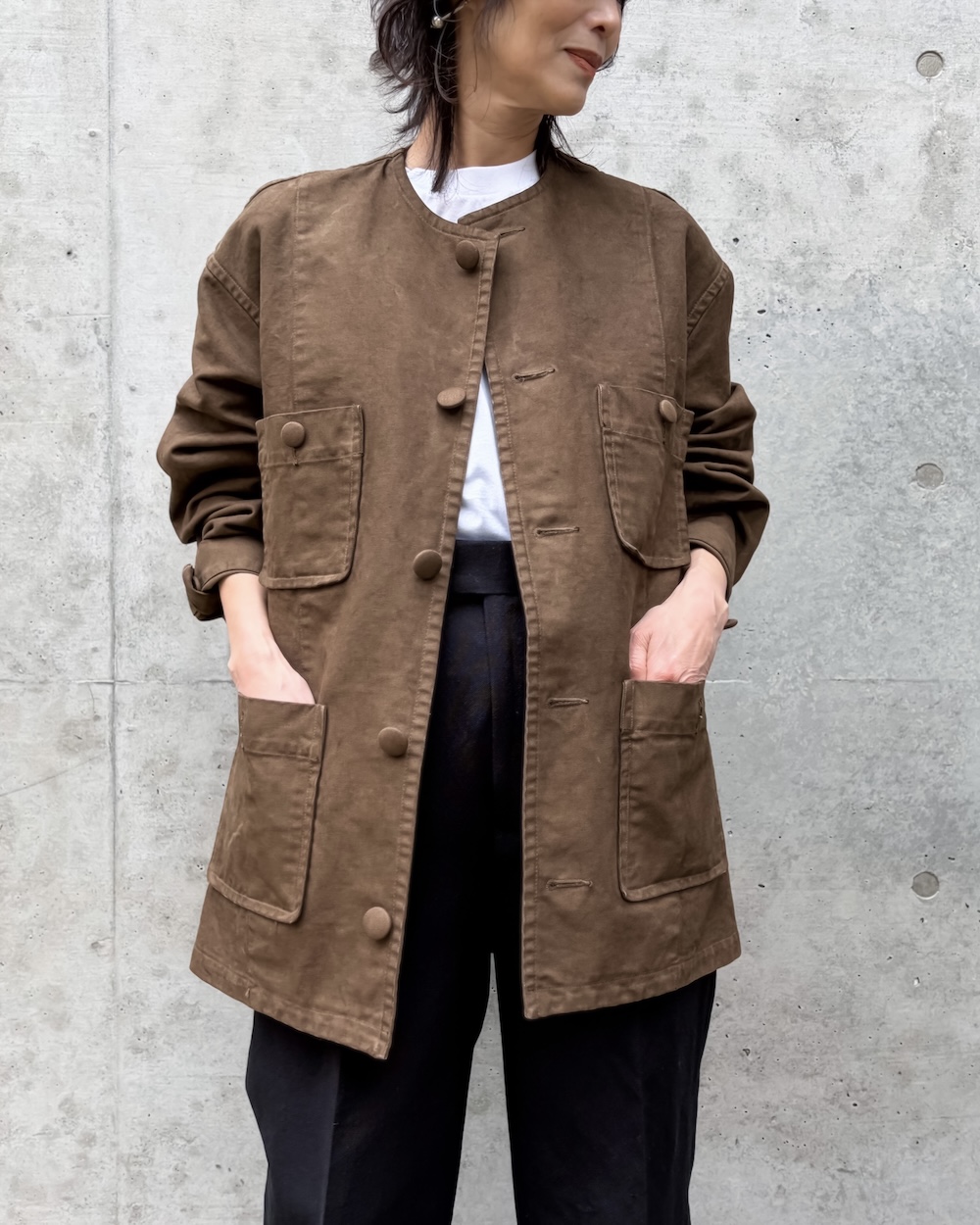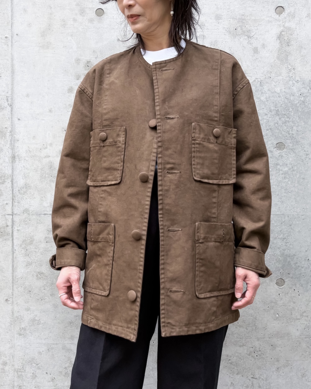 表面にはピーチ加工を施し、綿本来のナチュラルな風合いと程よい落ち感を引き立てています。