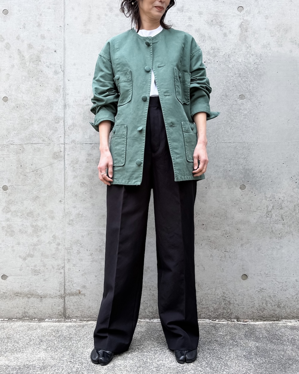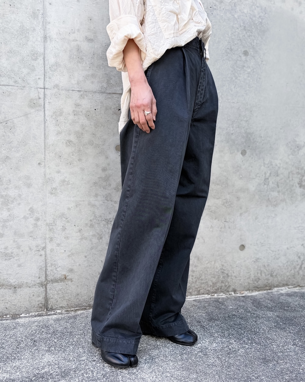 製品染めによって独特のムラ感と色の奥行きが生まれ、同時に張りのある質感を際立たせています。