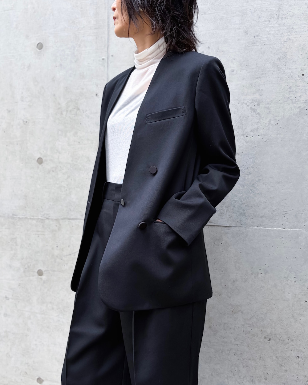 ミニマルな襟元によりシックな印象を与えるジャケットです。
