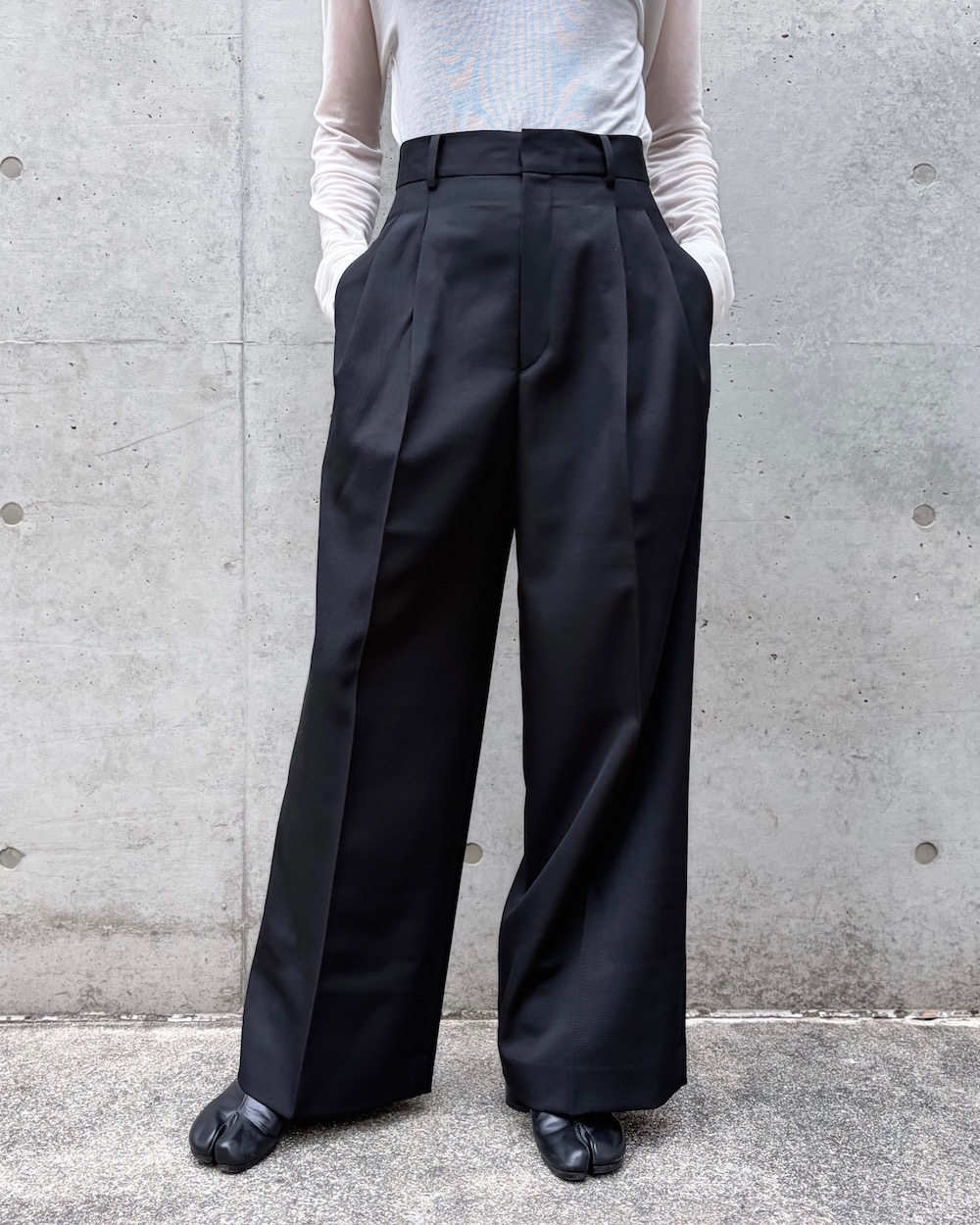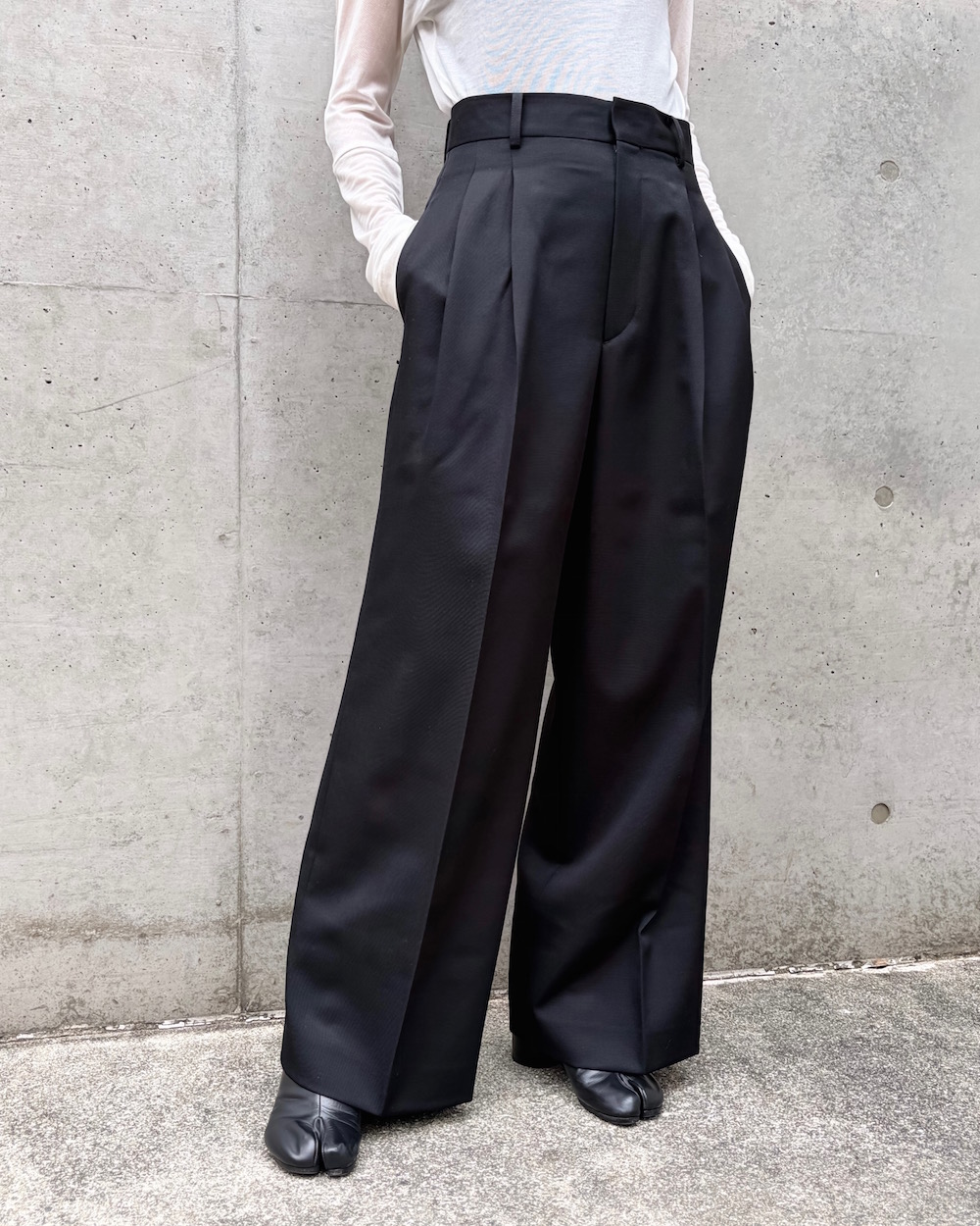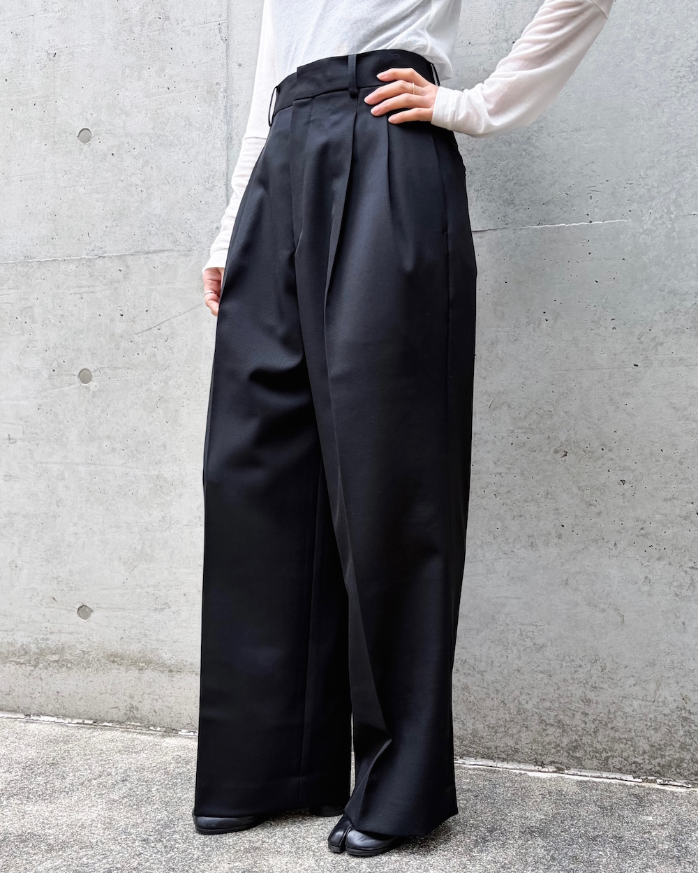 深いタックが生む立体感とドレープが印象的なワイドパンツです。