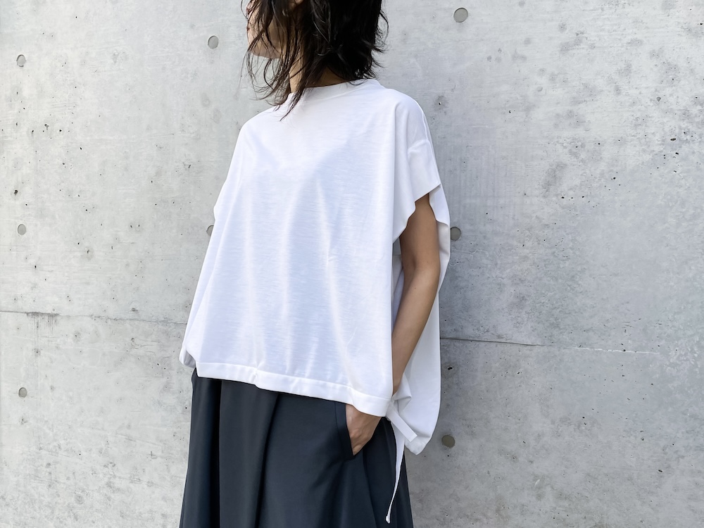 裾にはテープが通っていて、両脇で絞って着ることも、また、絞らずにスクエアシルエットのまま着用も可能です。