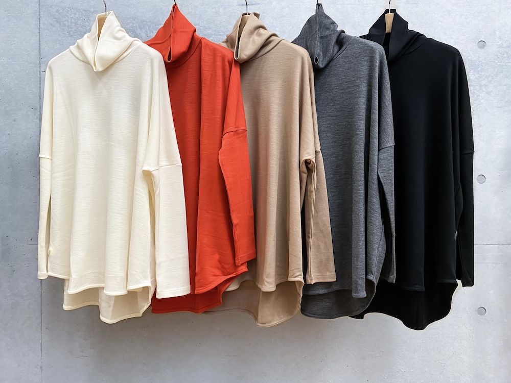 オーバーサイズの見頃に、ややタイトな袖が特徴のハイネックトップ。