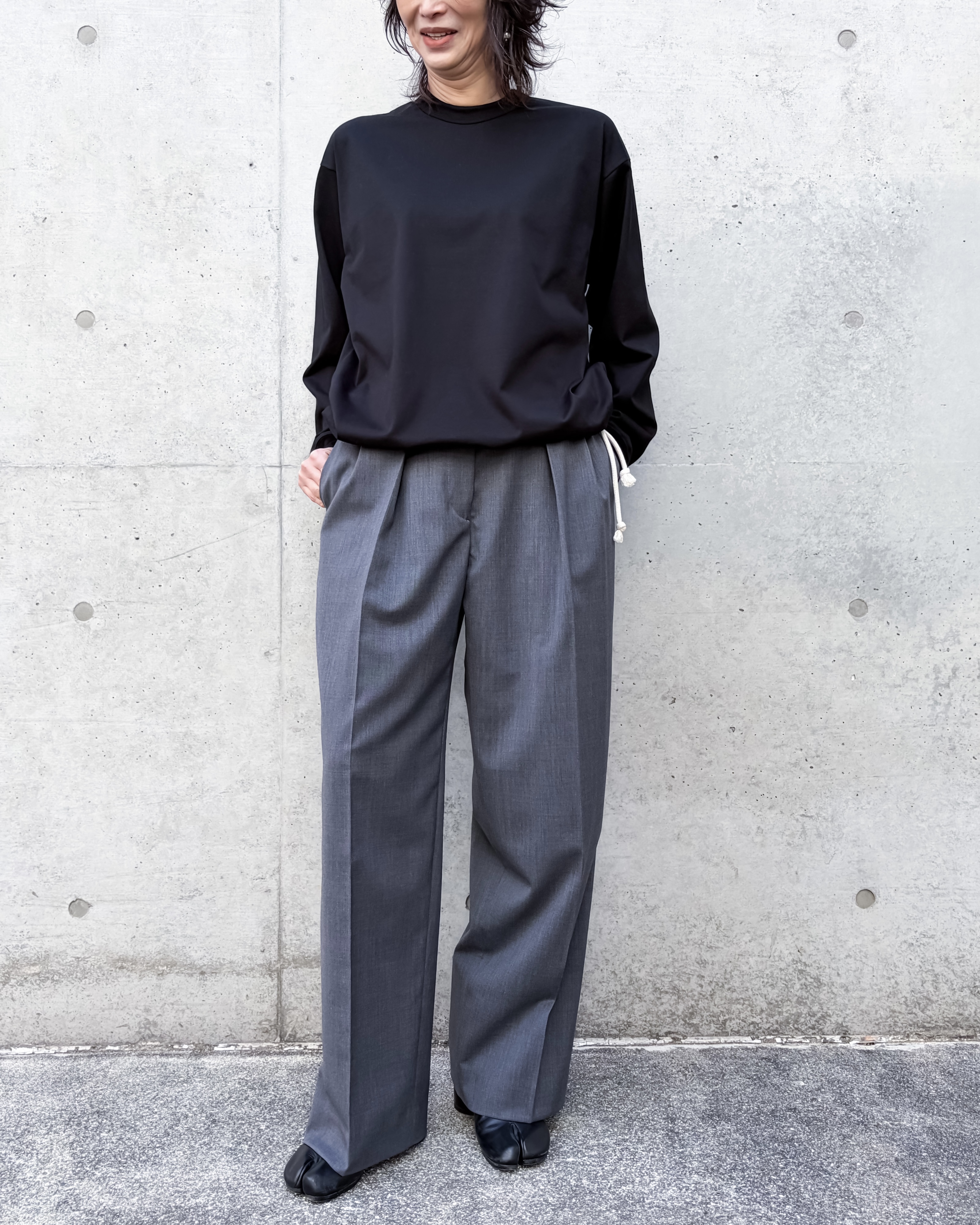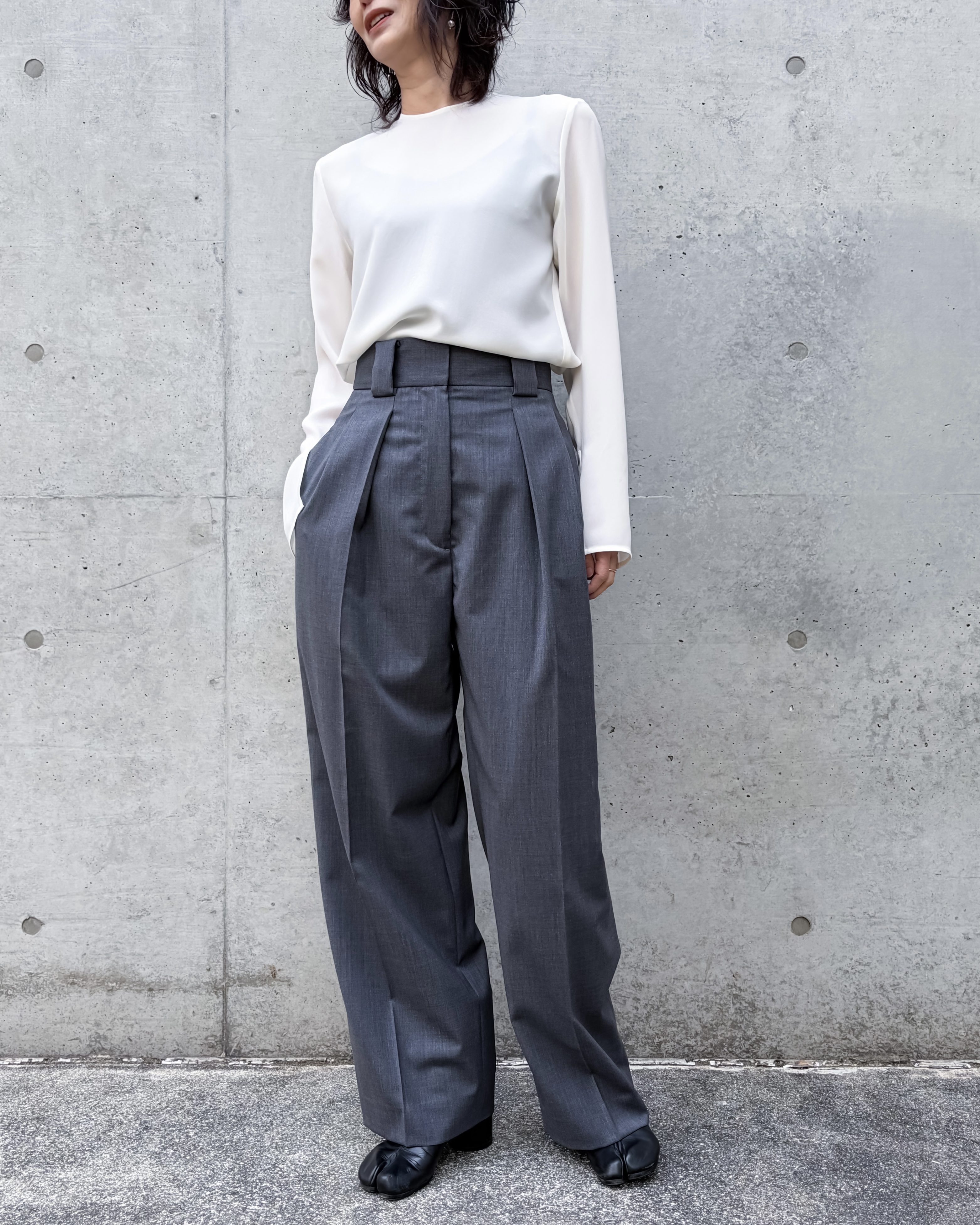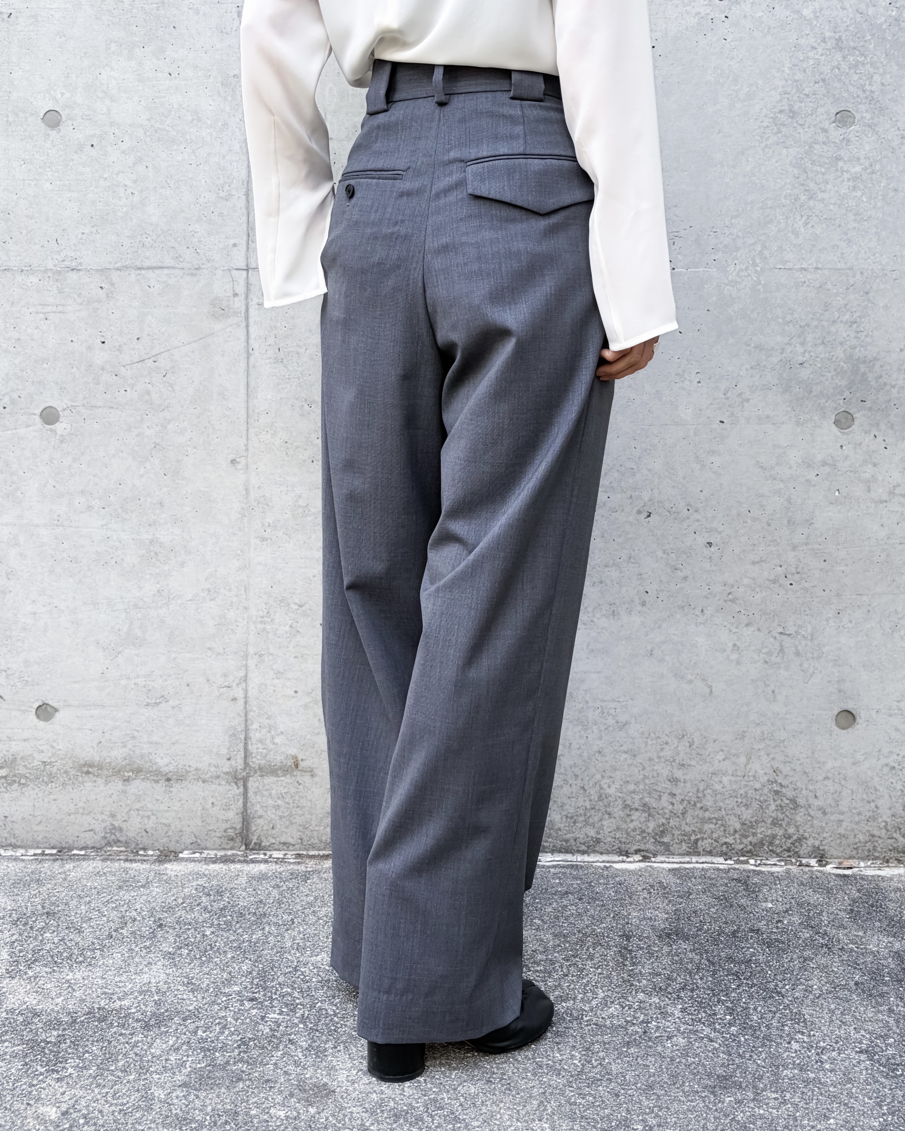 ハイウエスト設計で脚長効果を演出。ウエストに2本のタック入り(外側:脇方向/内側:センター方向)です。外側タックはヒップから太ももへの自然な広がりを生み、内側タックは縦ラインを強調し端正な印象に。対照的なタックの動きによって、陰影と奥行きのある立体的なシルエットを実現。ミニマルで構築的な美しさを引き立てる一本です。