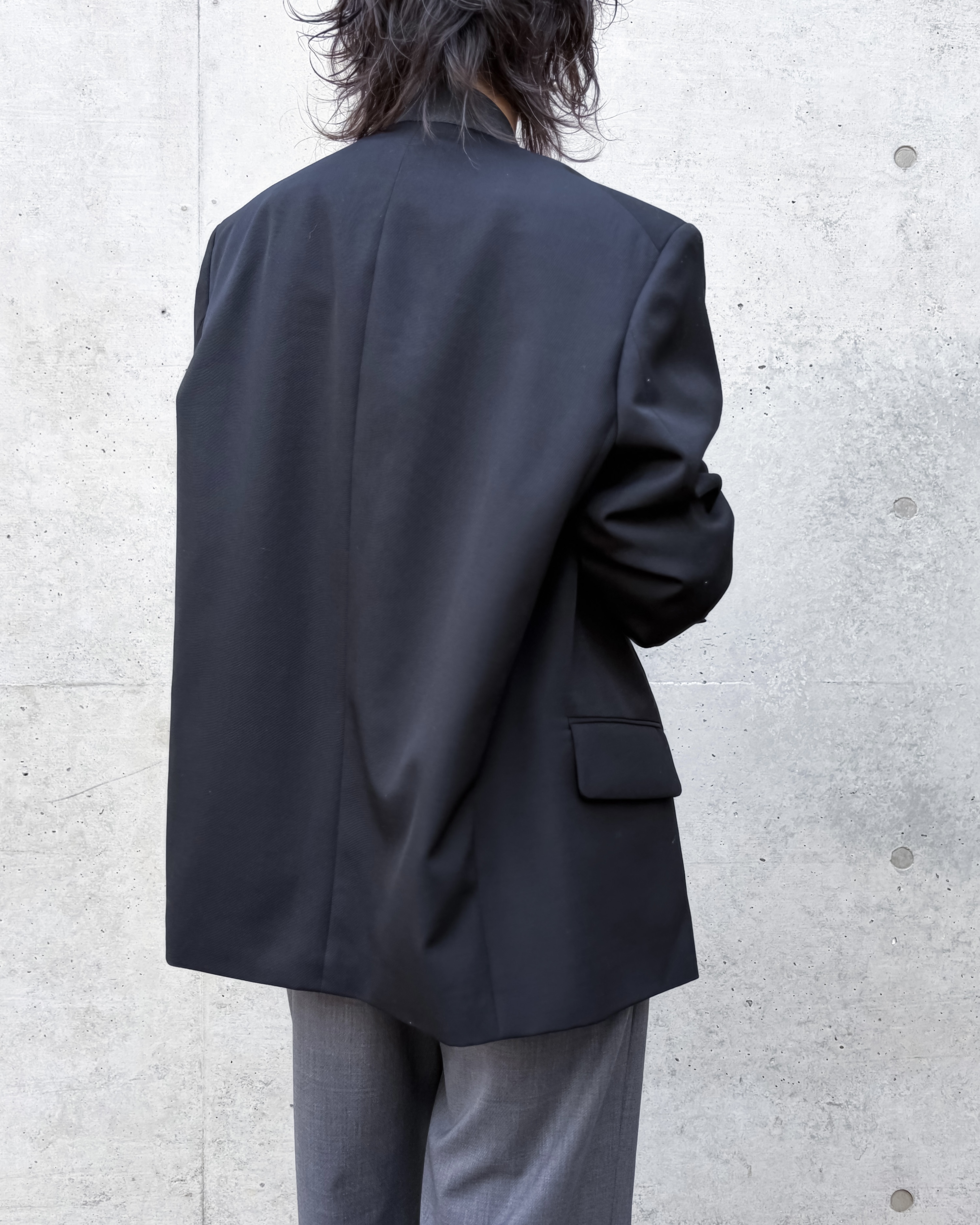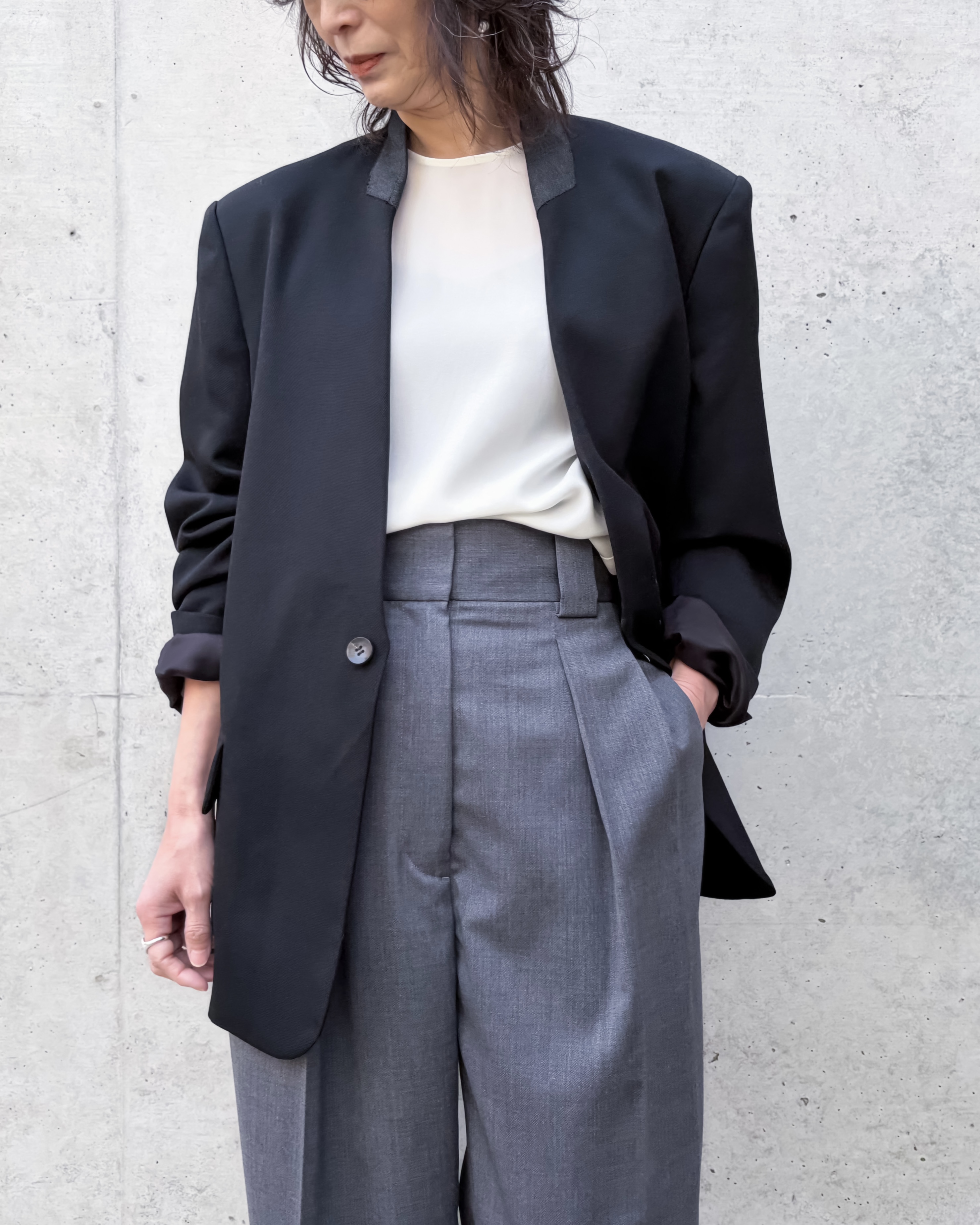 本来ジャケットに表情をつける襟とラペルを裏側に折り返し、身頃に厚みをもたせることで、通常のノーカラージャケットとは異なるミニマルな印象に仕上げたデザインです。