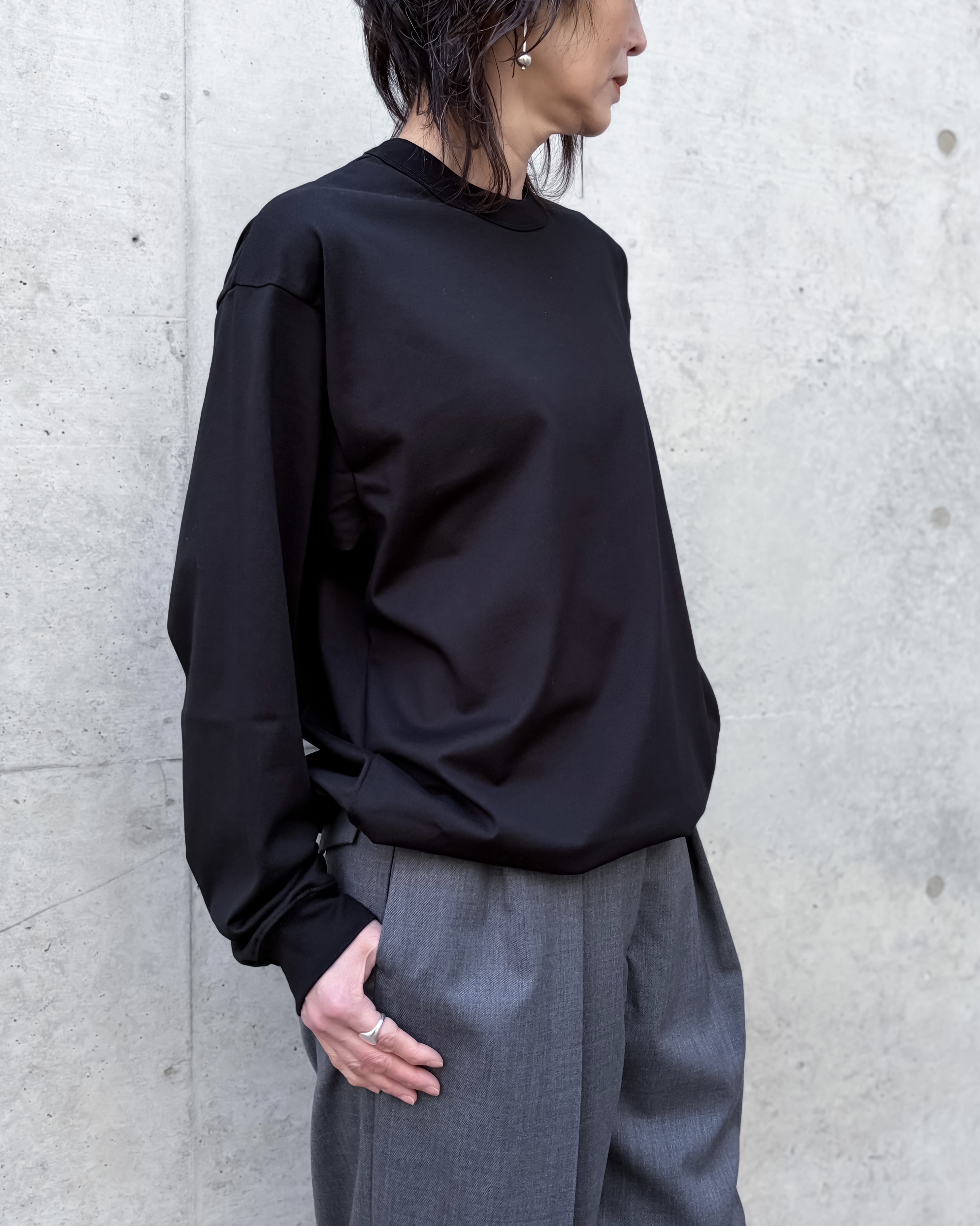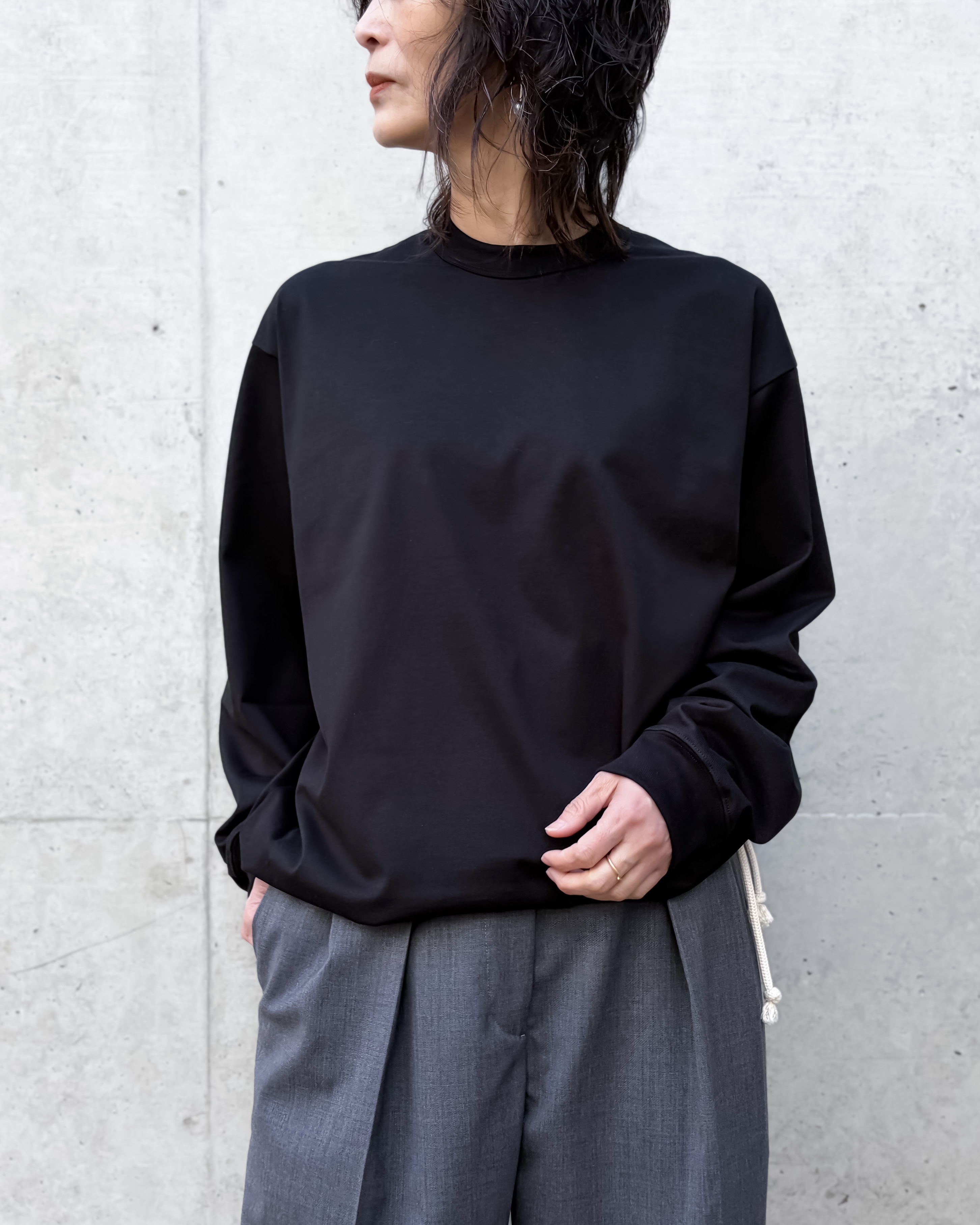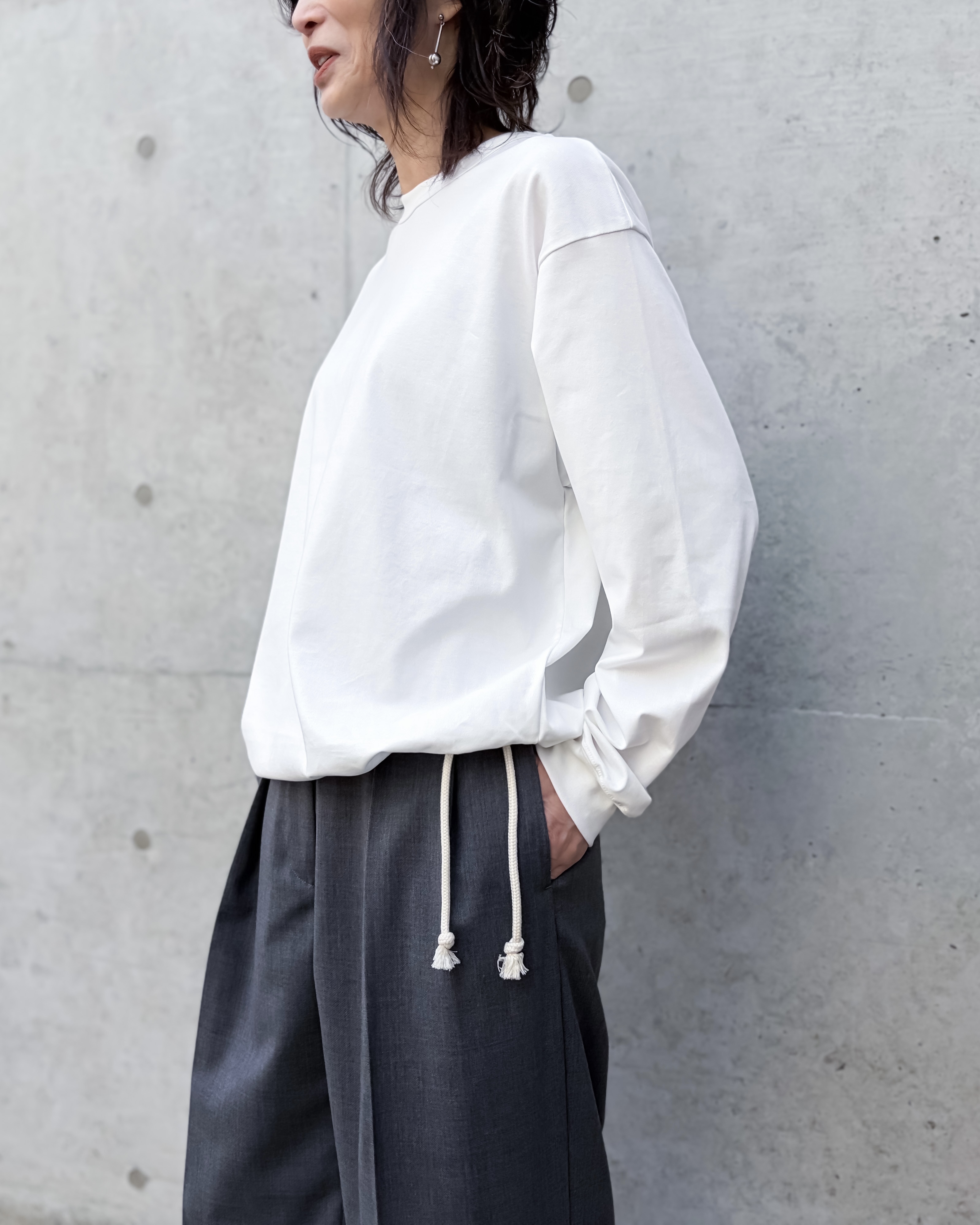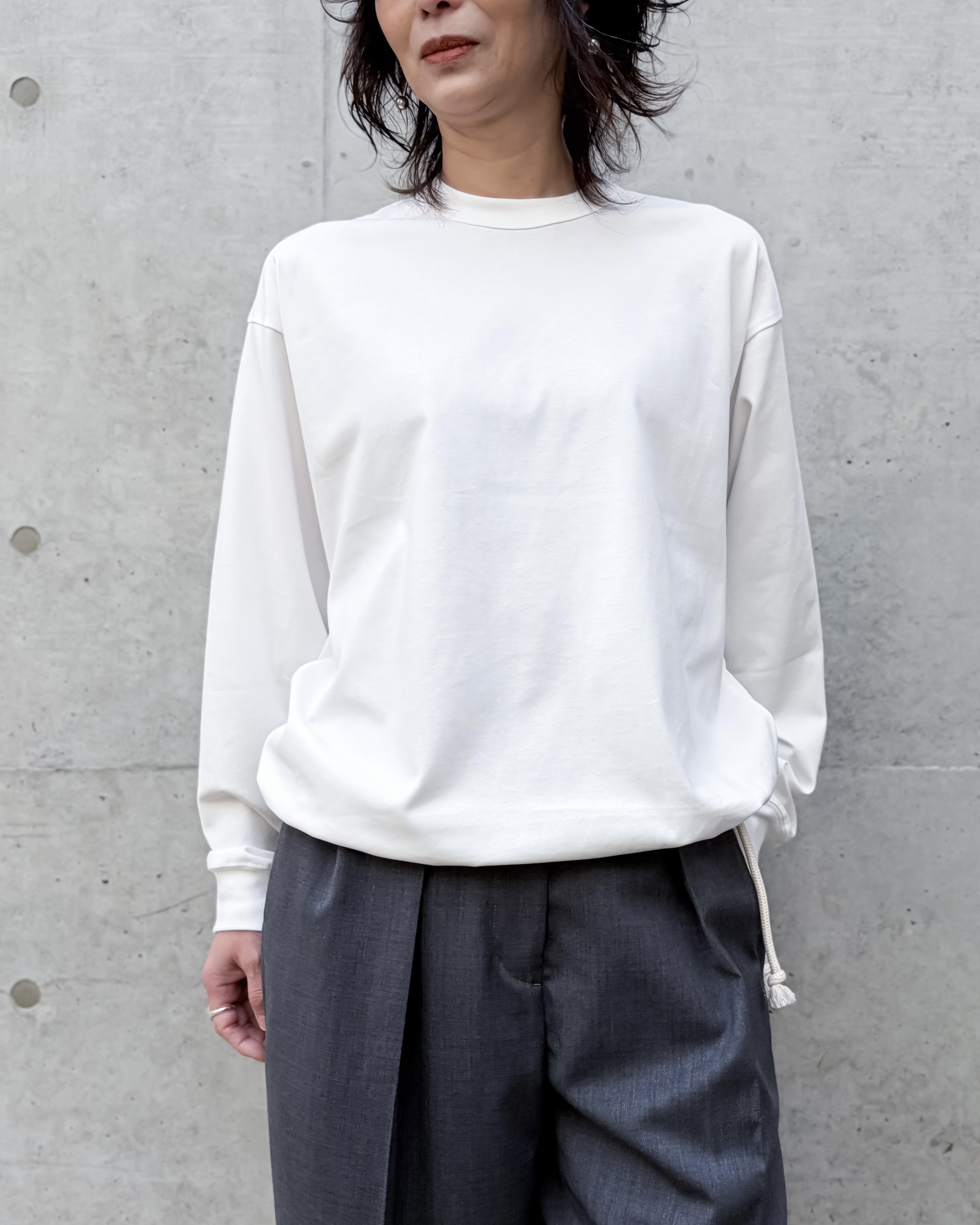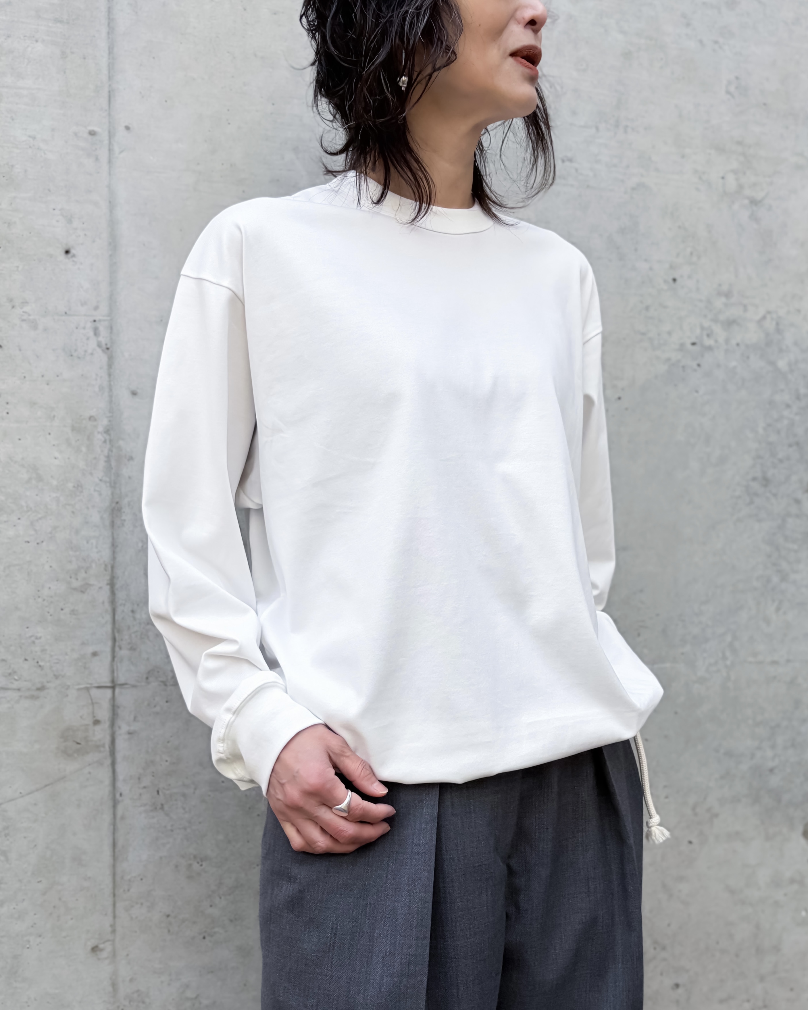裾にドローストリングを配したロングスリーブTシャツです。ゆとりのあるリラックスフィット。ドローストリングを調整することで、丈感やシルエットに変化をつけた着こなしが可能。ブラウジングのようなボリューム感を出し、表情豊かなレイヤードスタイルにも対応。