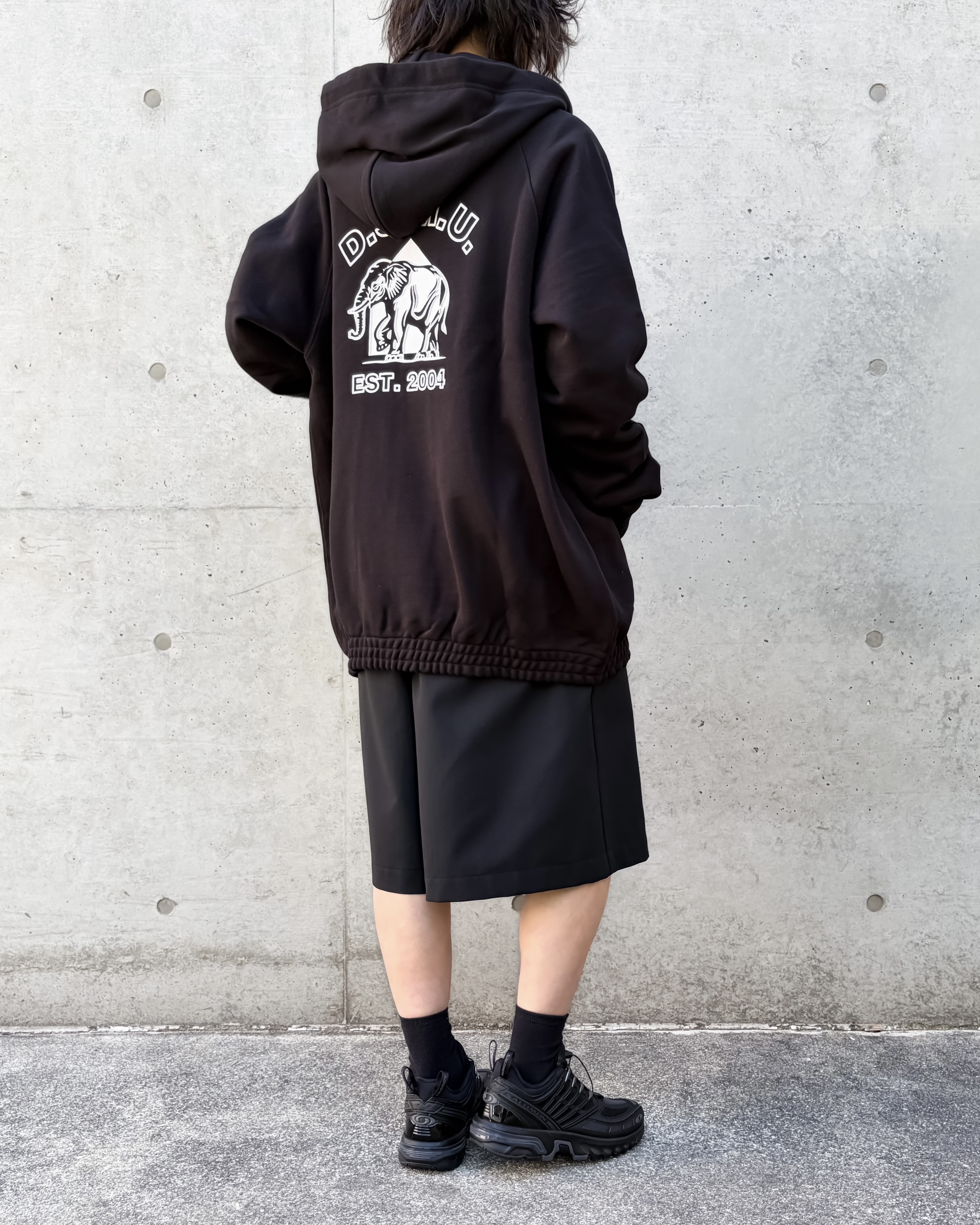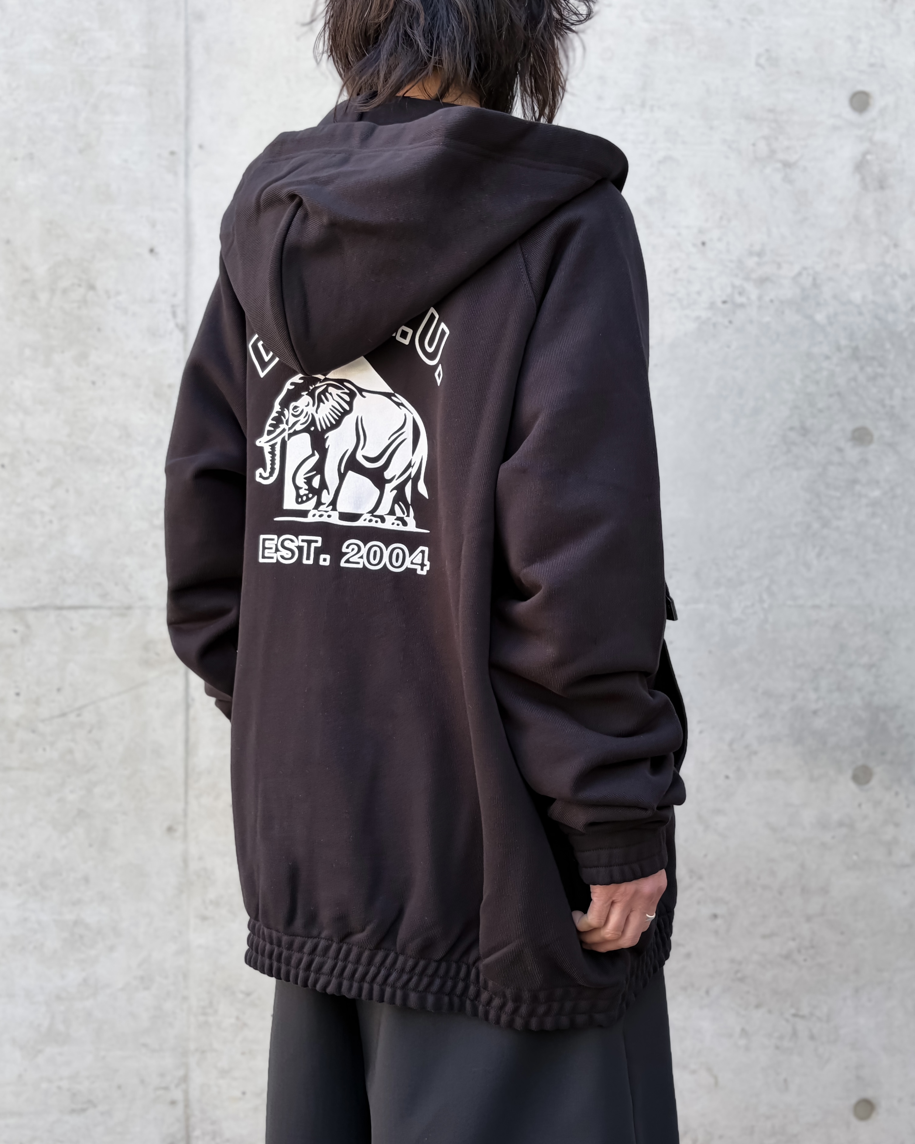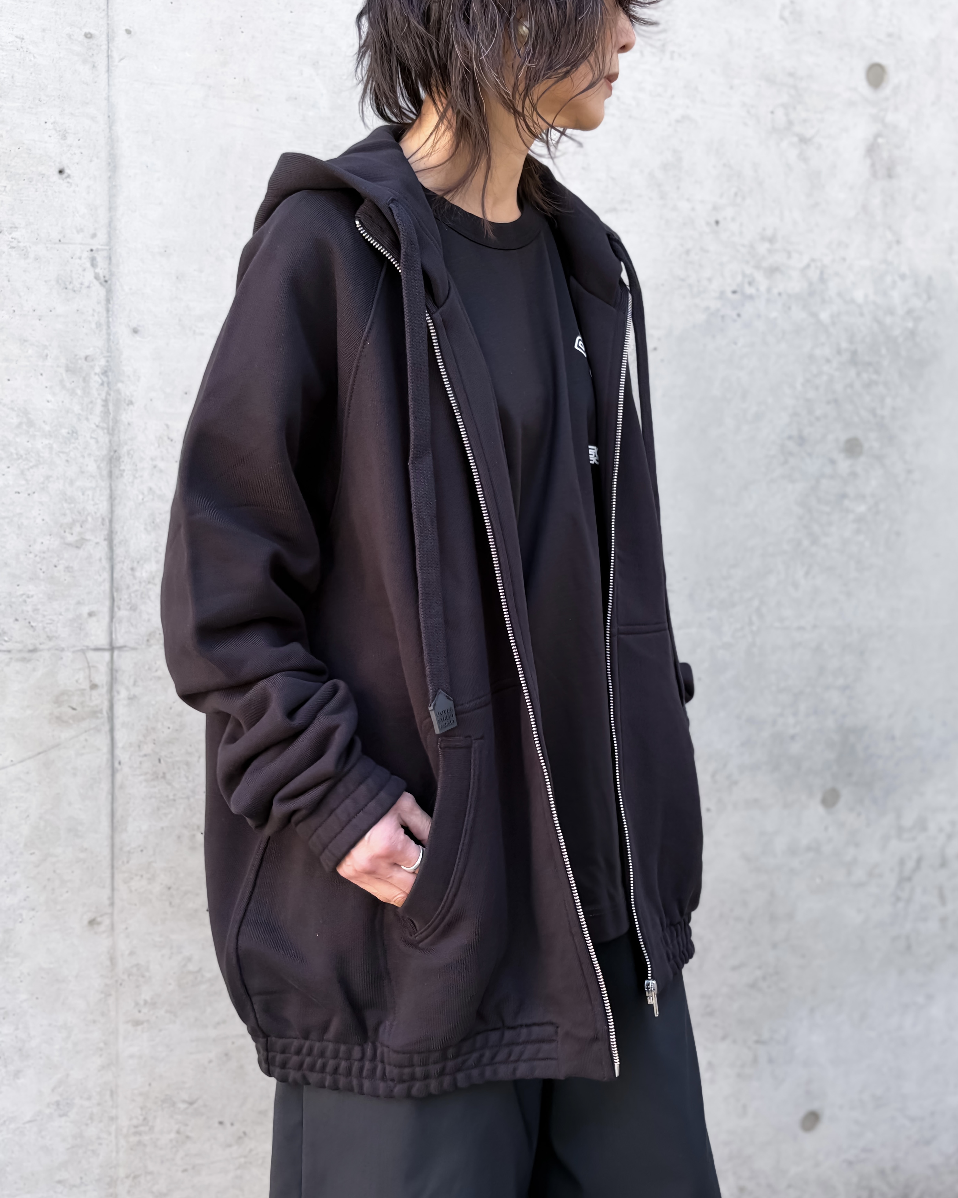 袖口と裾に配したゴムが特徴的で、通常のスウェットパーカーとは違った見え方を演出しています。