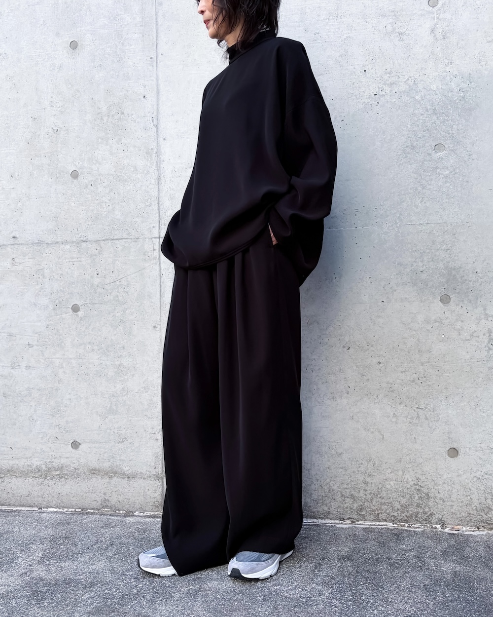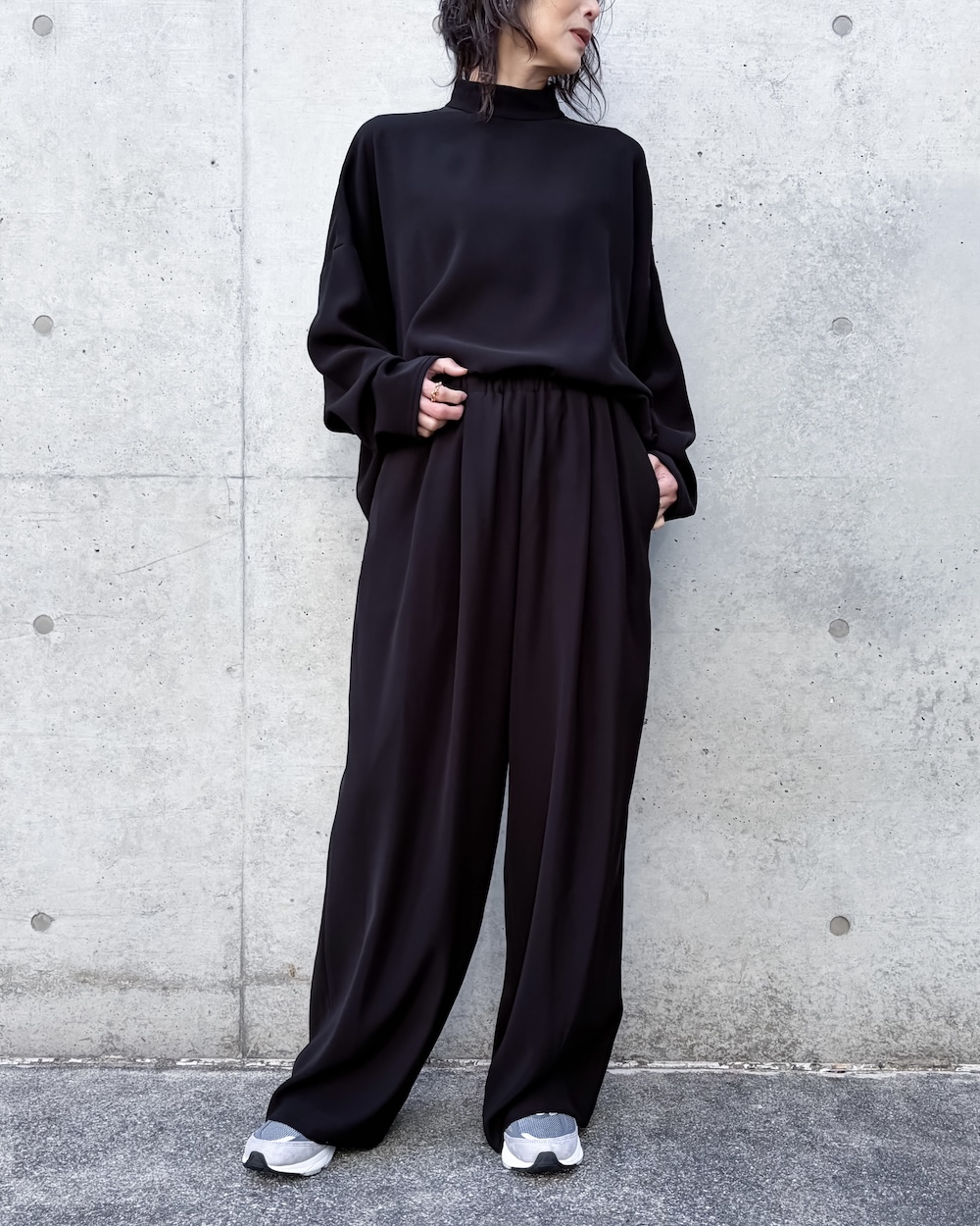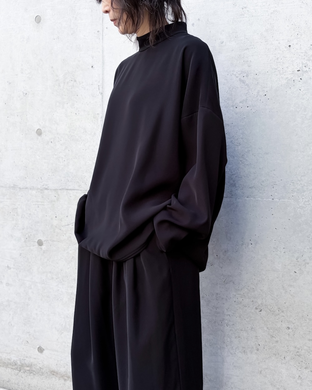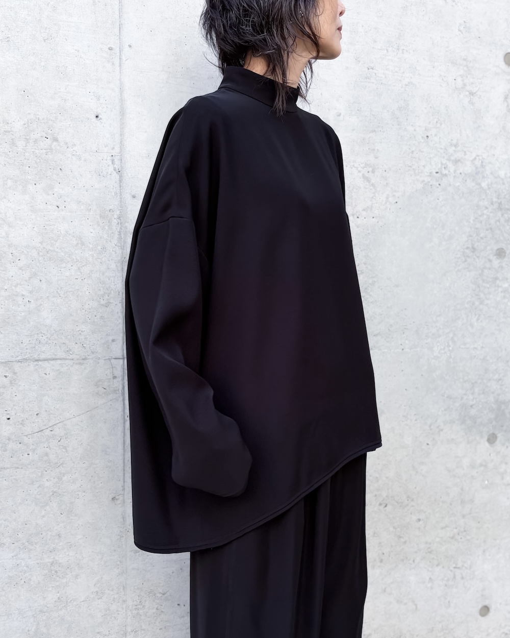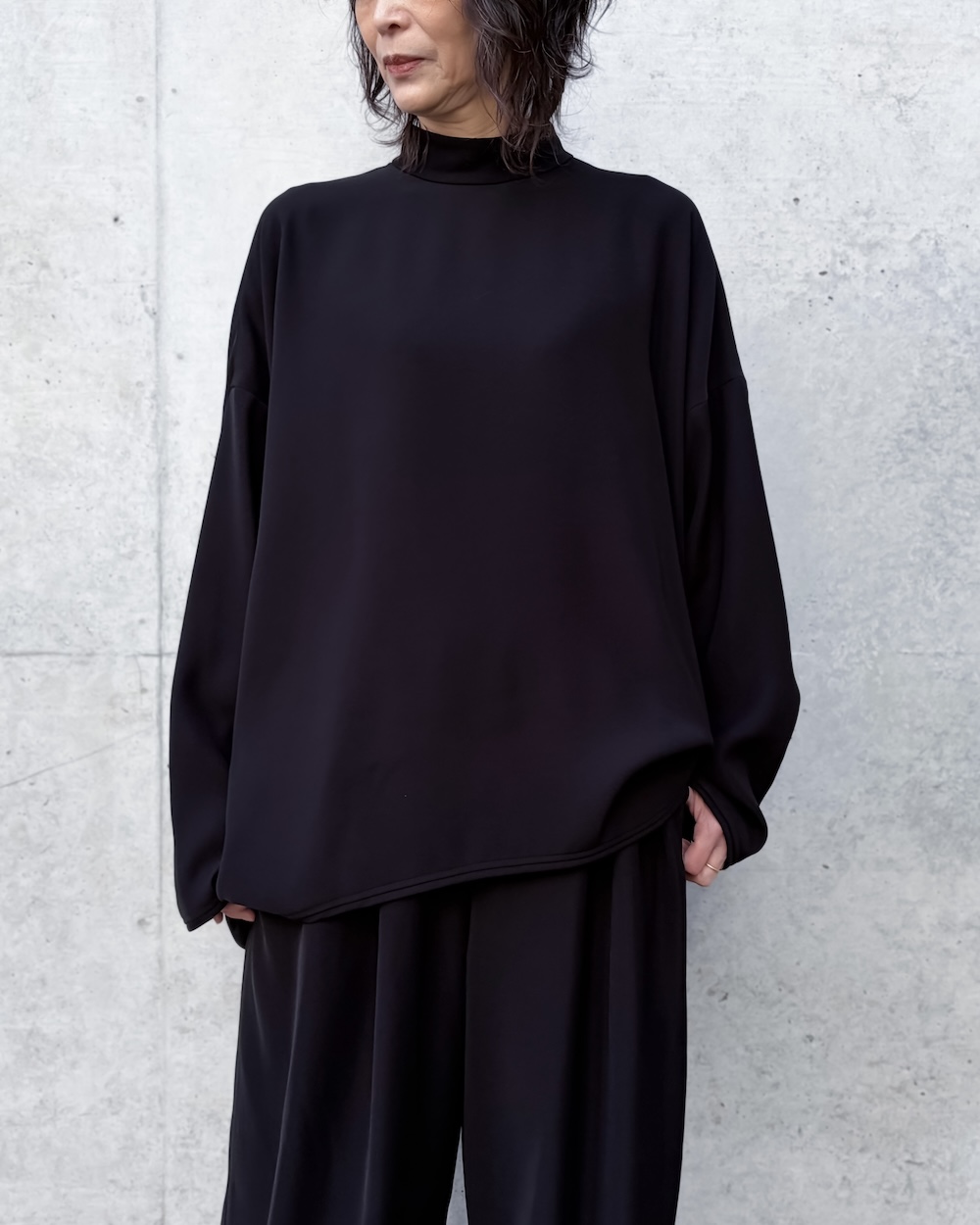 大人っぽく上手に首元を隠したい方にオススメです。ENFÖLDのニットのように着心地が良いワイドな身巾とスタイルバランスが取りやすいフロント短めのカーブヘムがコンサバにならずに合わせやすいポイントです。