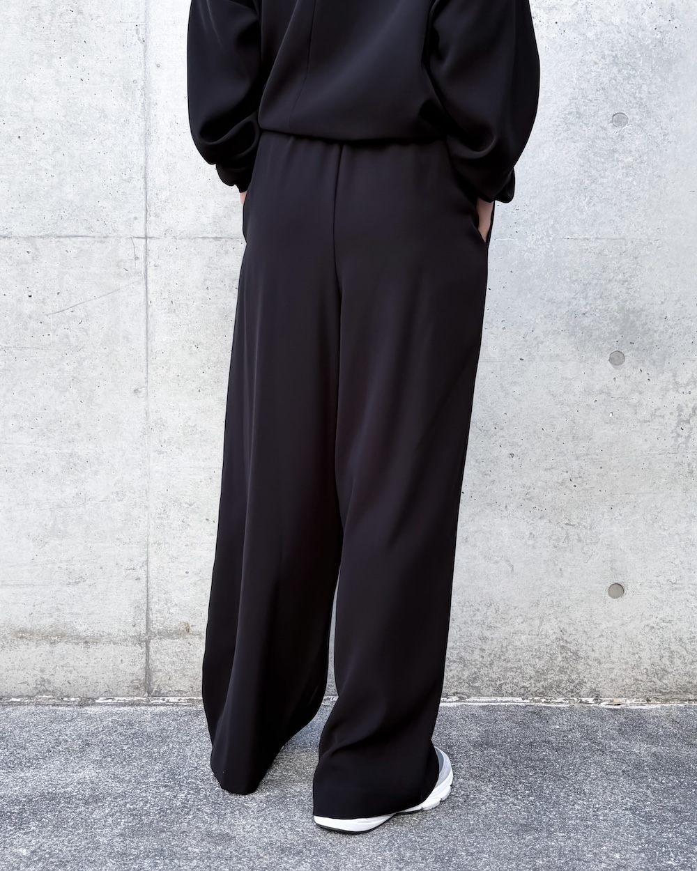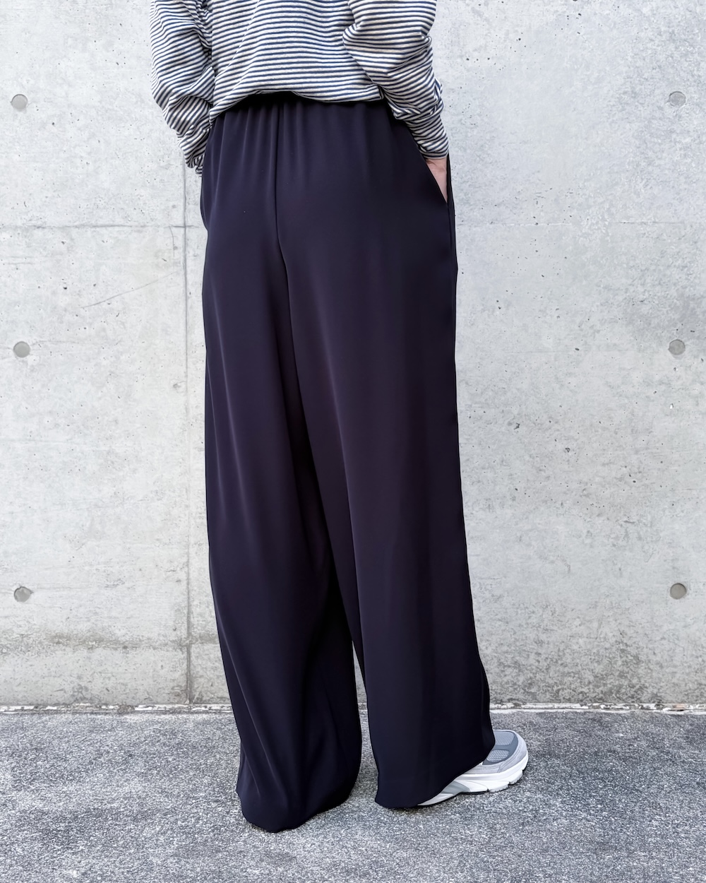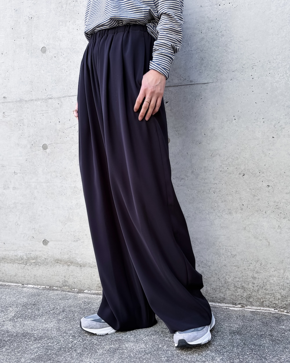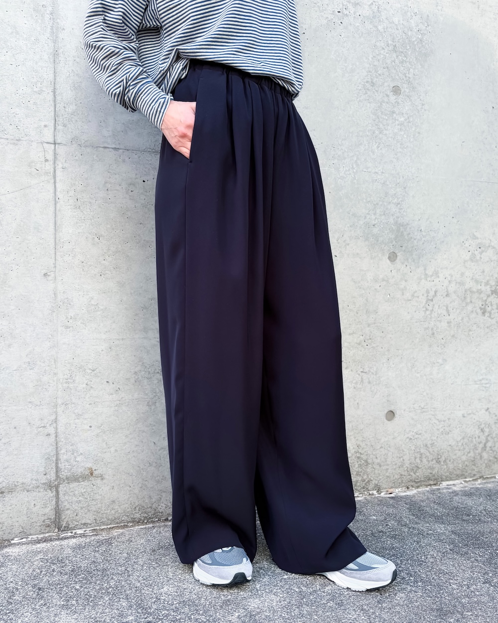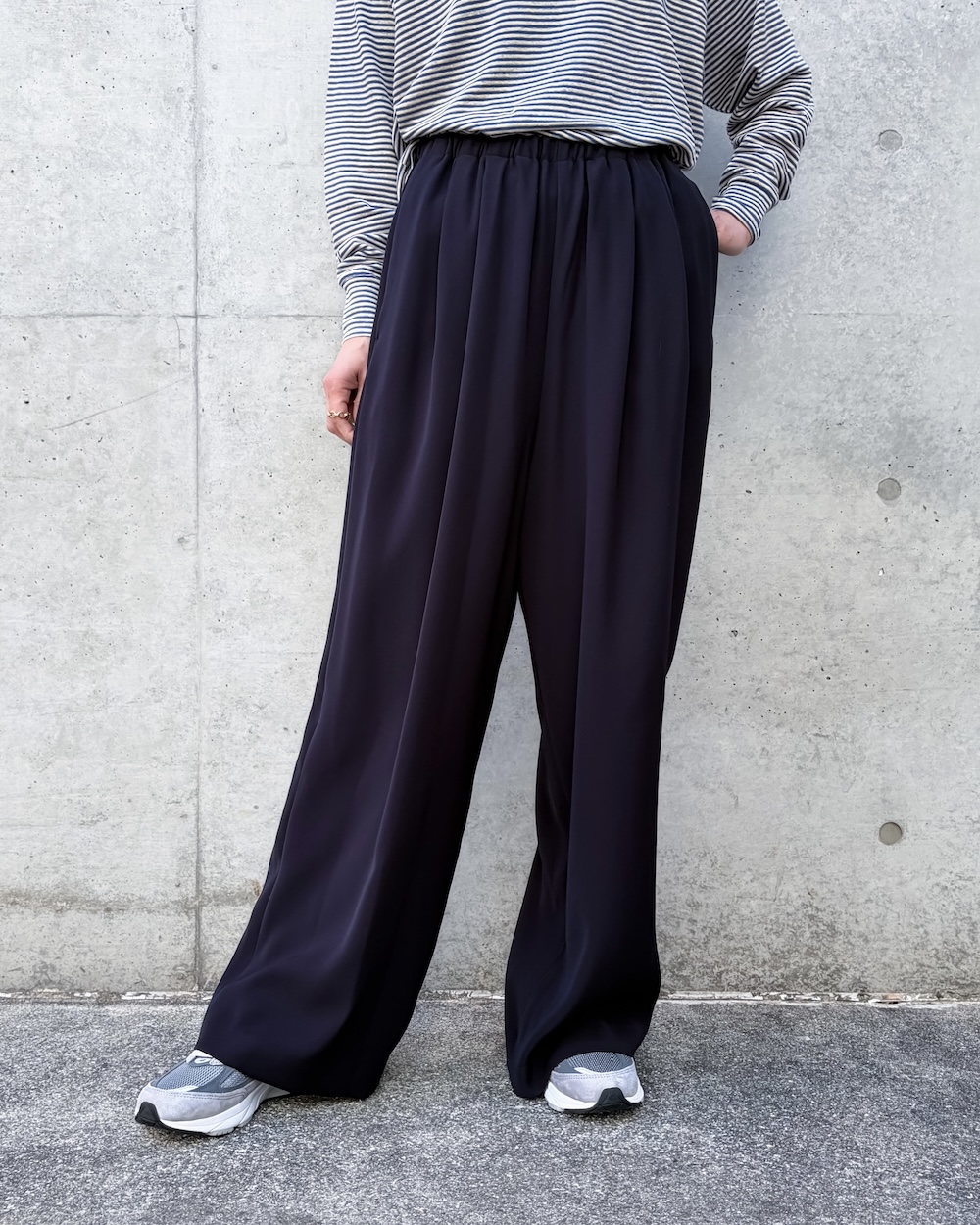 ワイドパンツの合わせやすさを持ち合わせ、少しだけテーパードしたシルエットは大人っぽく足が長くみえるように工夫しています。