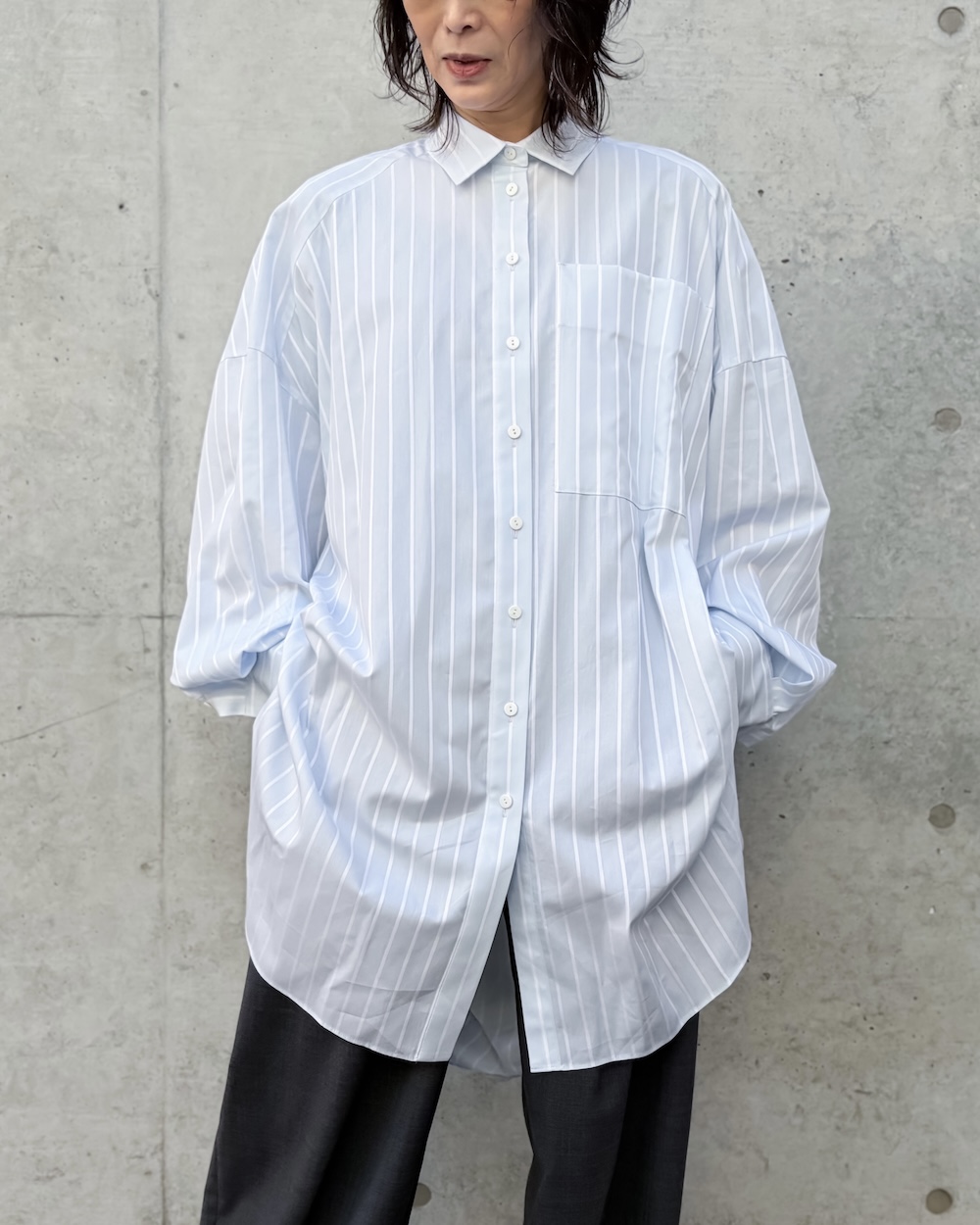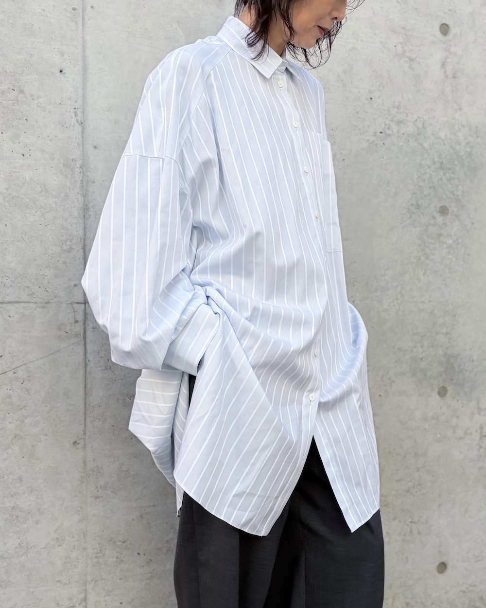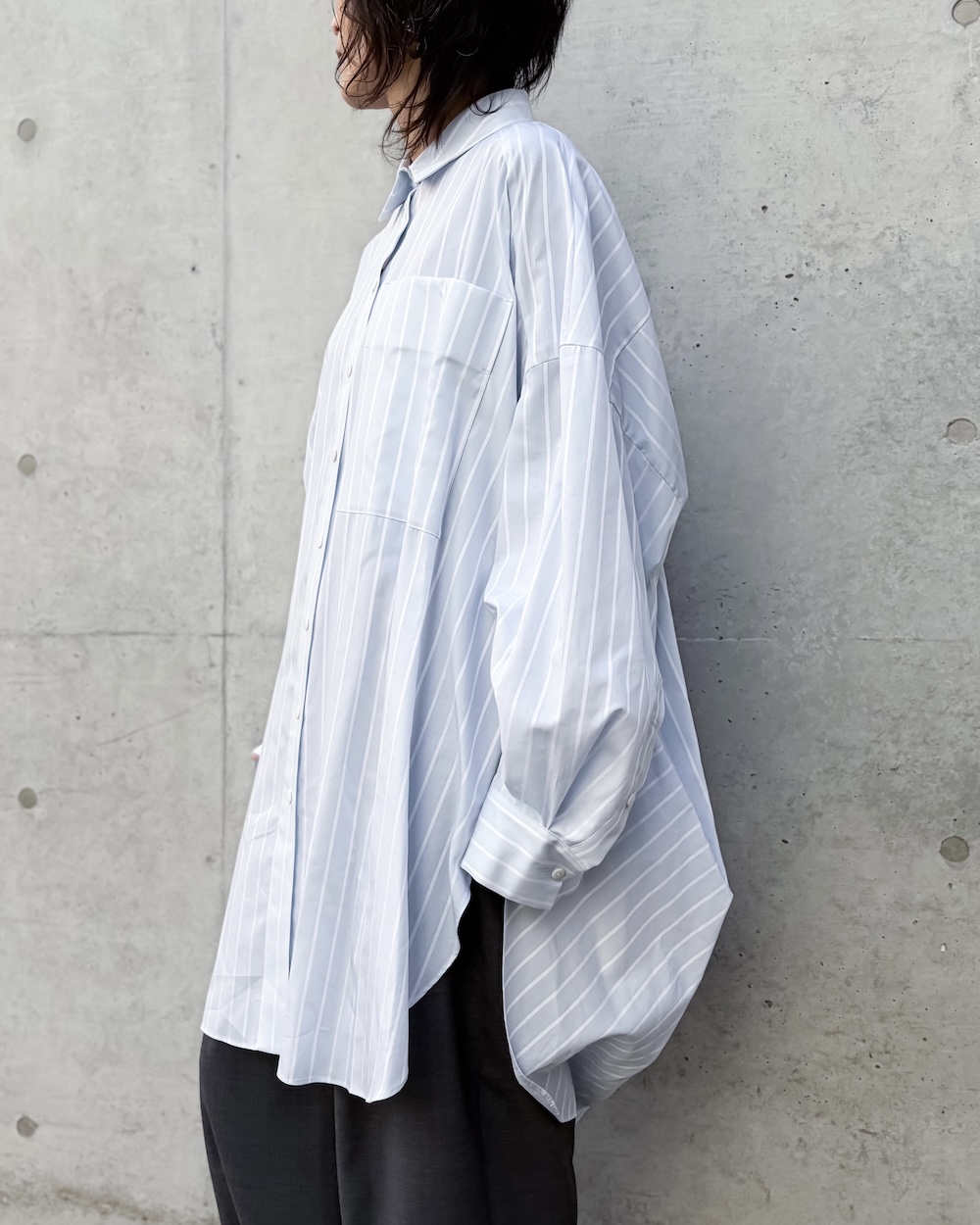 ベーシックなディティールながらも後ろにドレープ分量が溜まる立体的なパターンで、ヒップがすっぽり隠れるチュニック丈のシャツです。