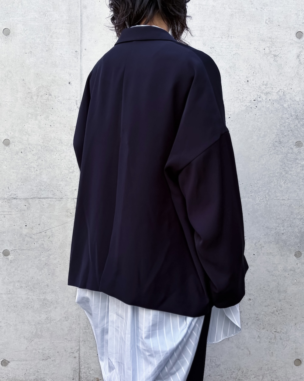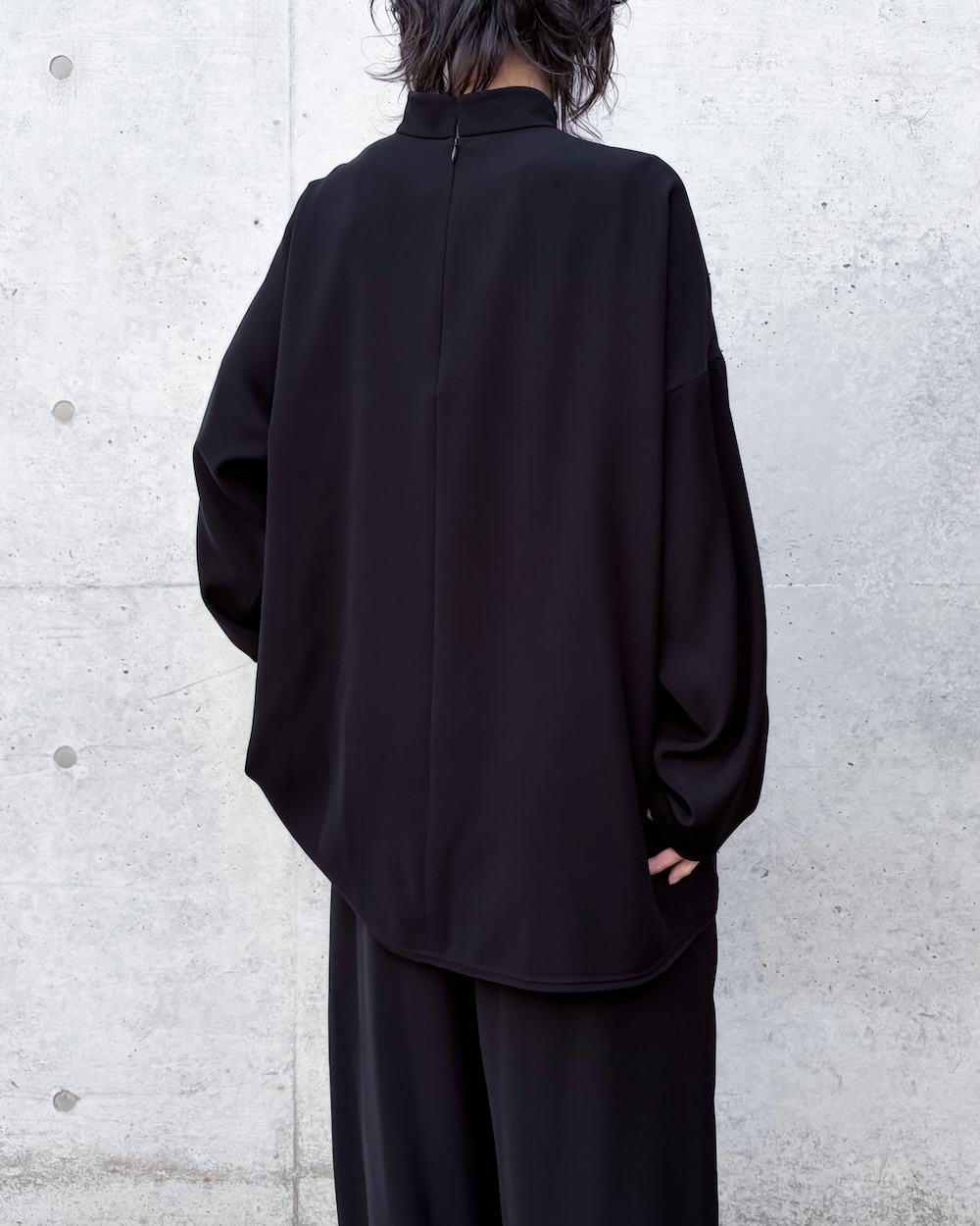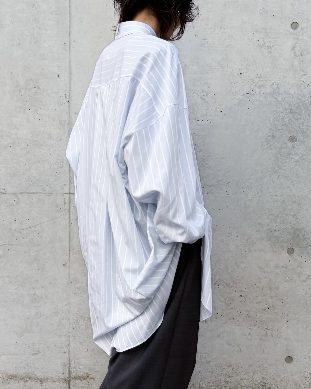 ベーシックなディティールながらも後ろにドレープ分量が溜まる立体的なパターンで、ヒップがすっぽり隠れるチュニック丈のシャツです。