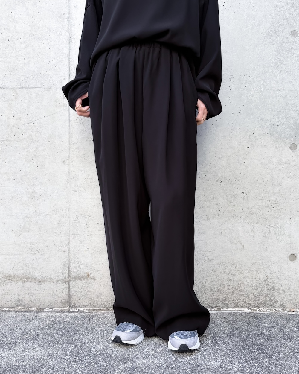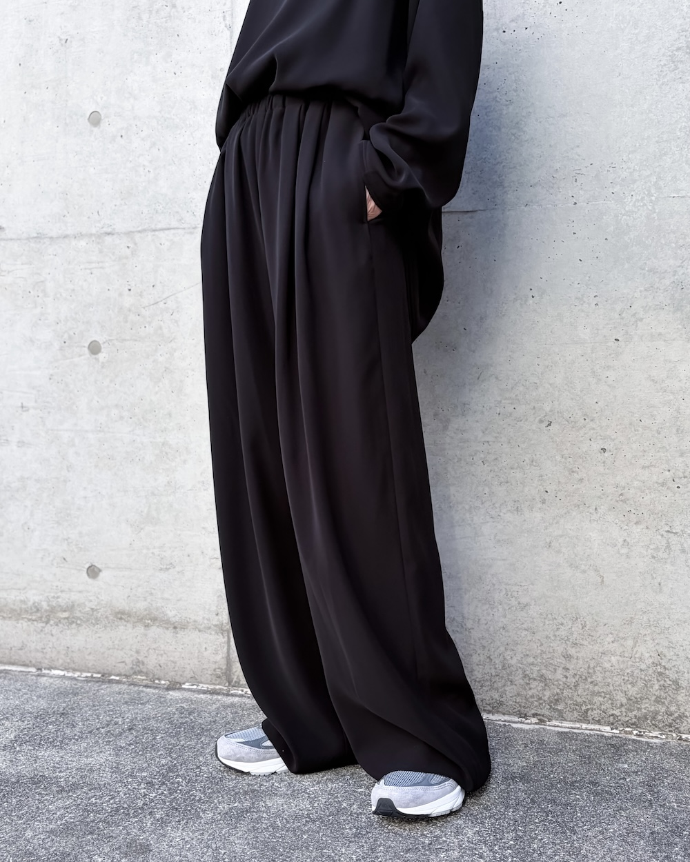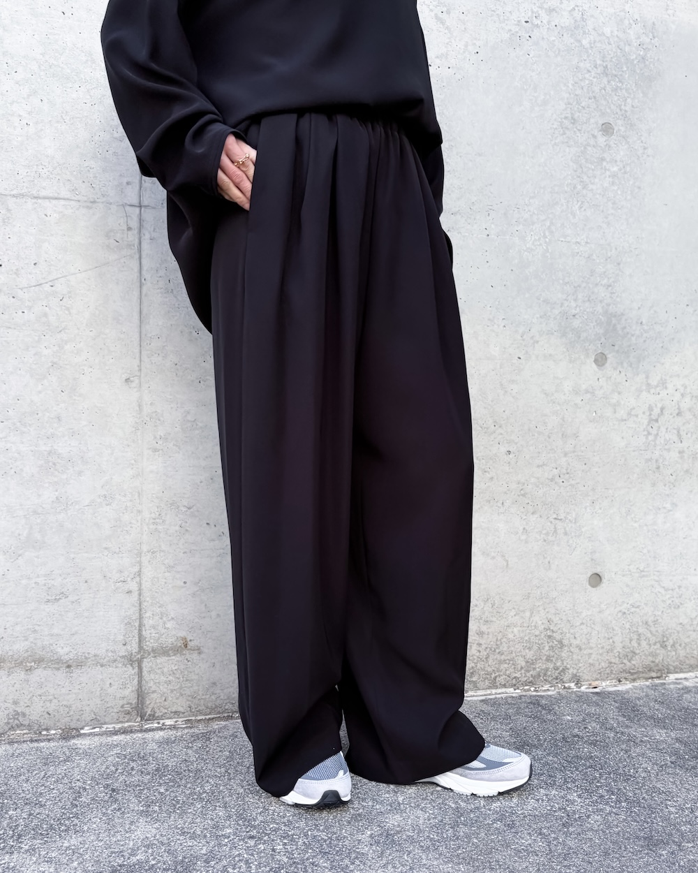ENFÖLD定番のRelaxゴムワイドPTをベースに裾巾が少し入ったテーパードコクーンワイドパンツが新登場。