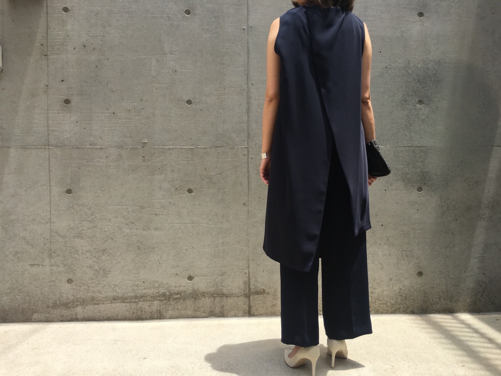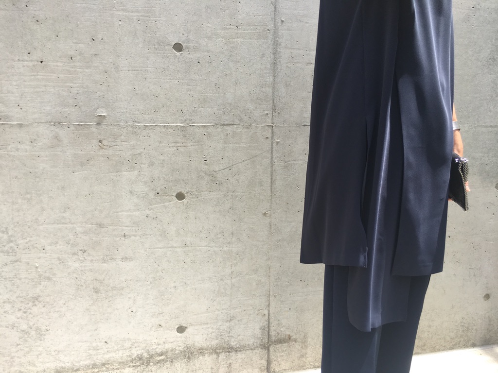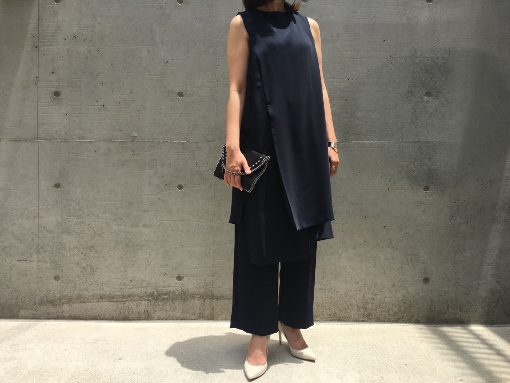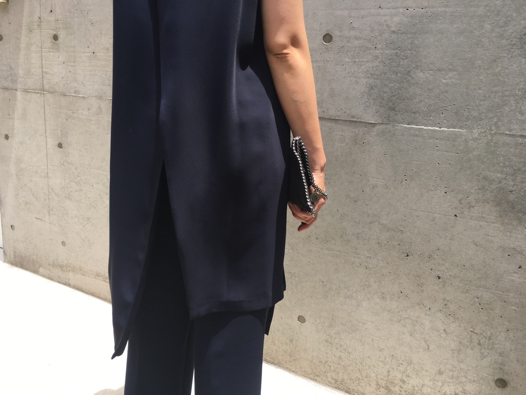 今回はトップスと近い素材と色をボトムに合わせて、よりエレガントさをプラスしたスタイリングになっています。