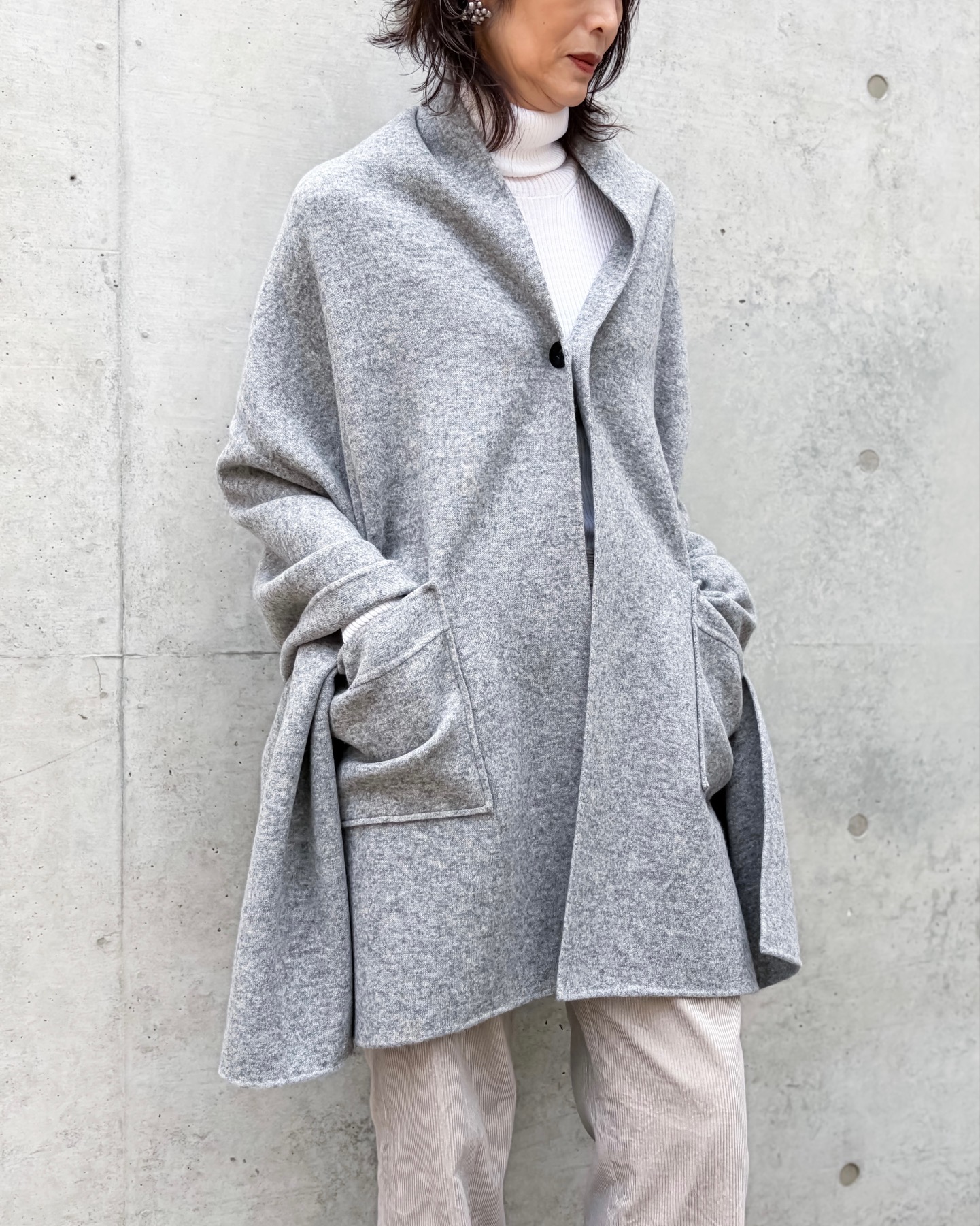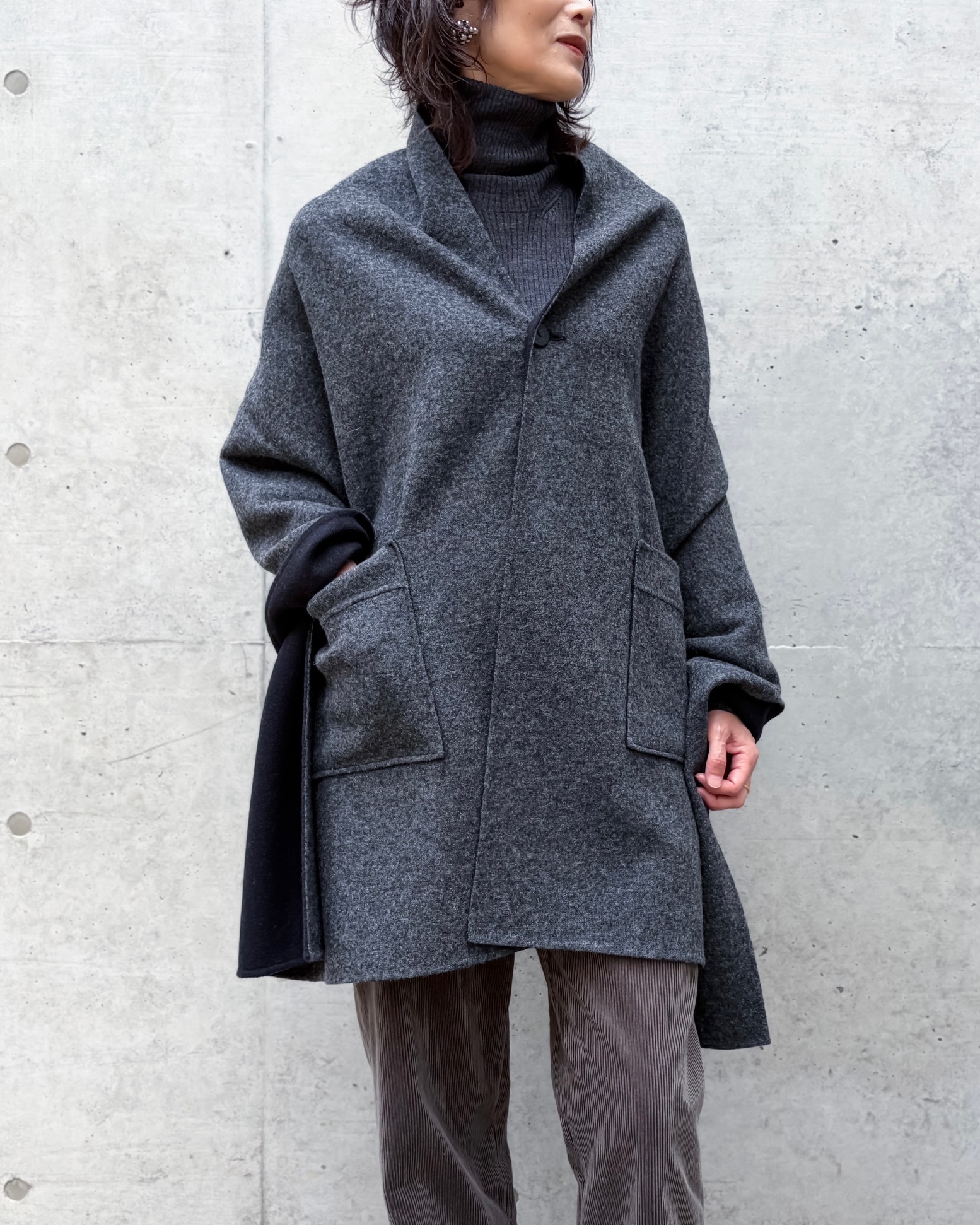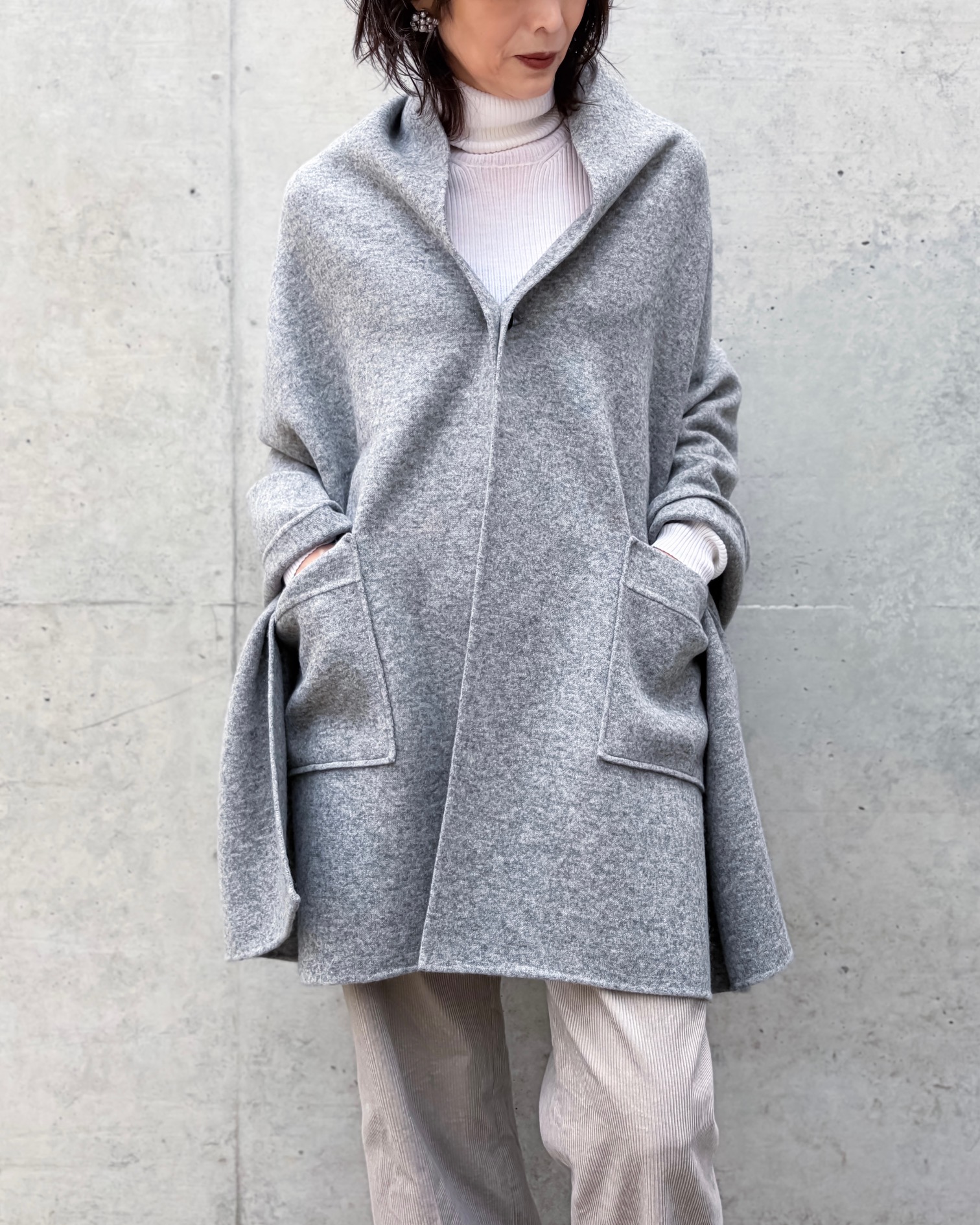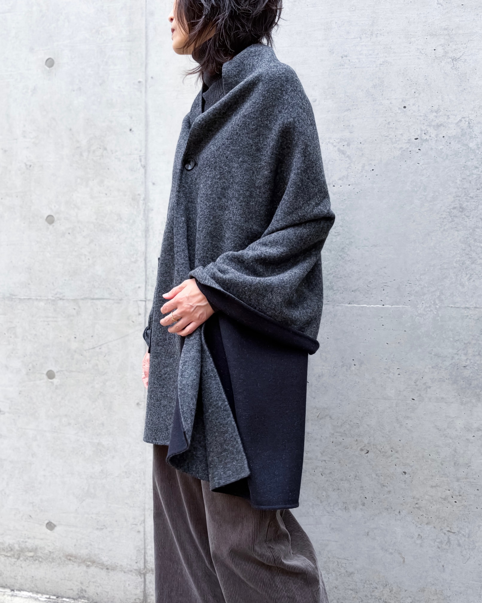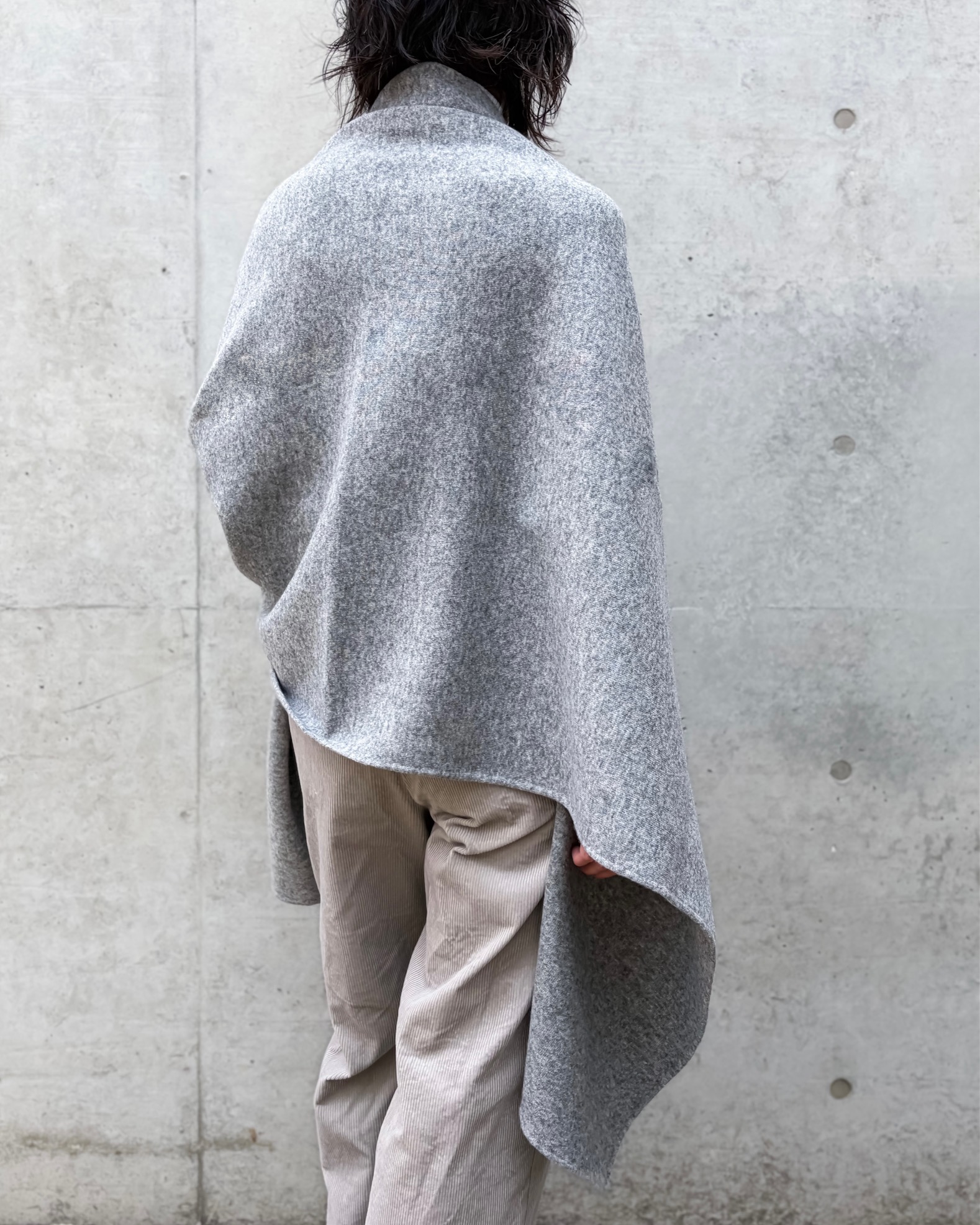 ダブル編みのジャージー素材をリバー縫製で仕立てたストールアウター。