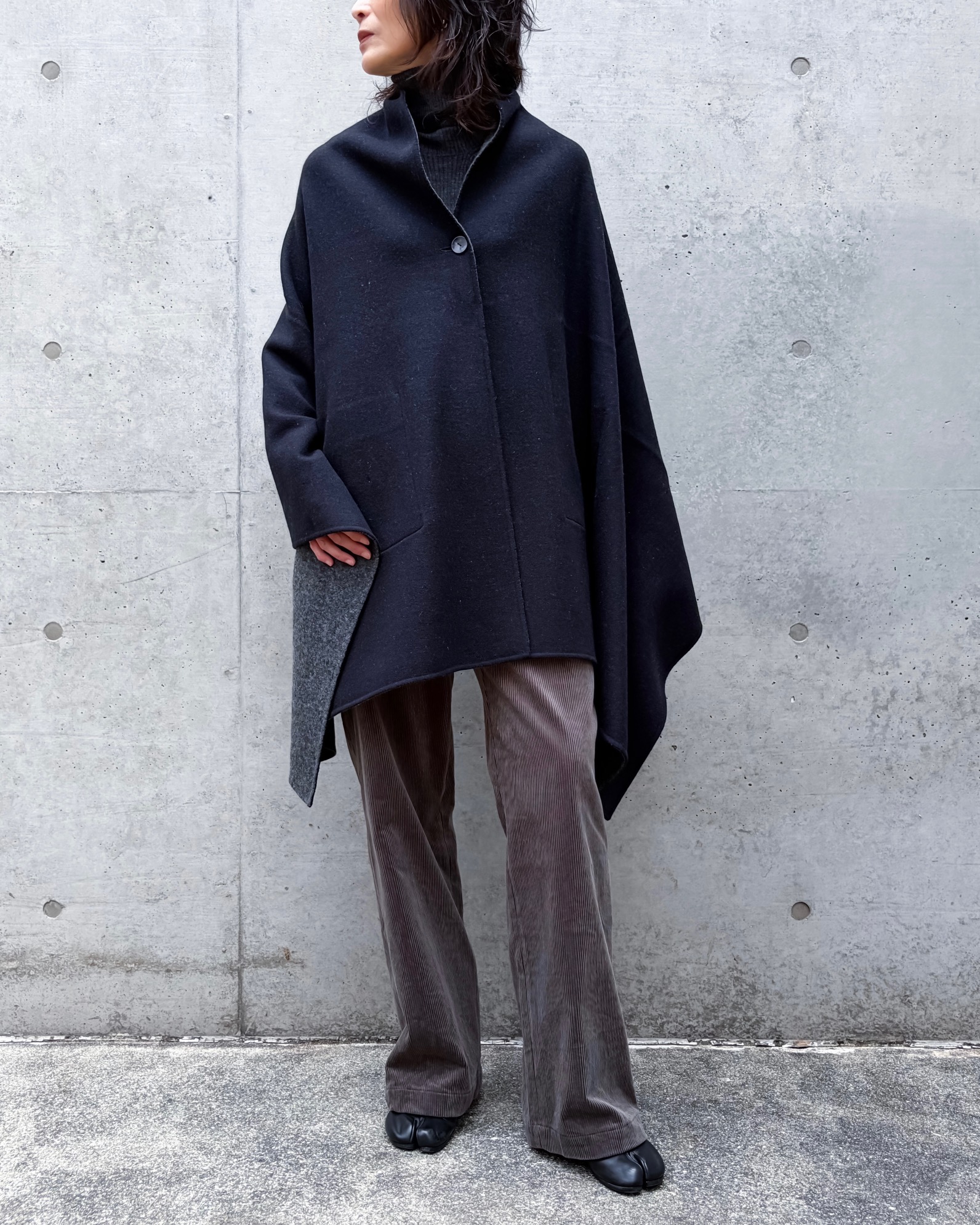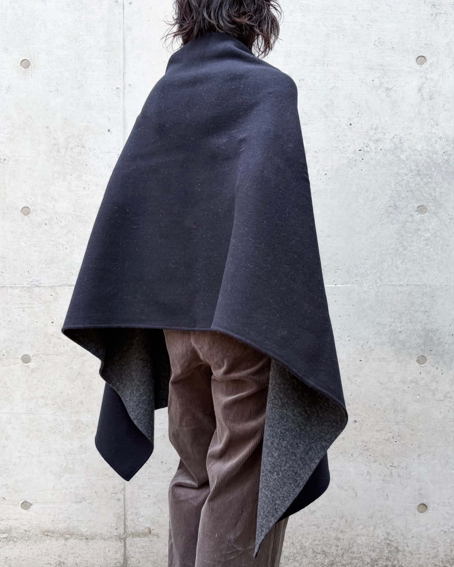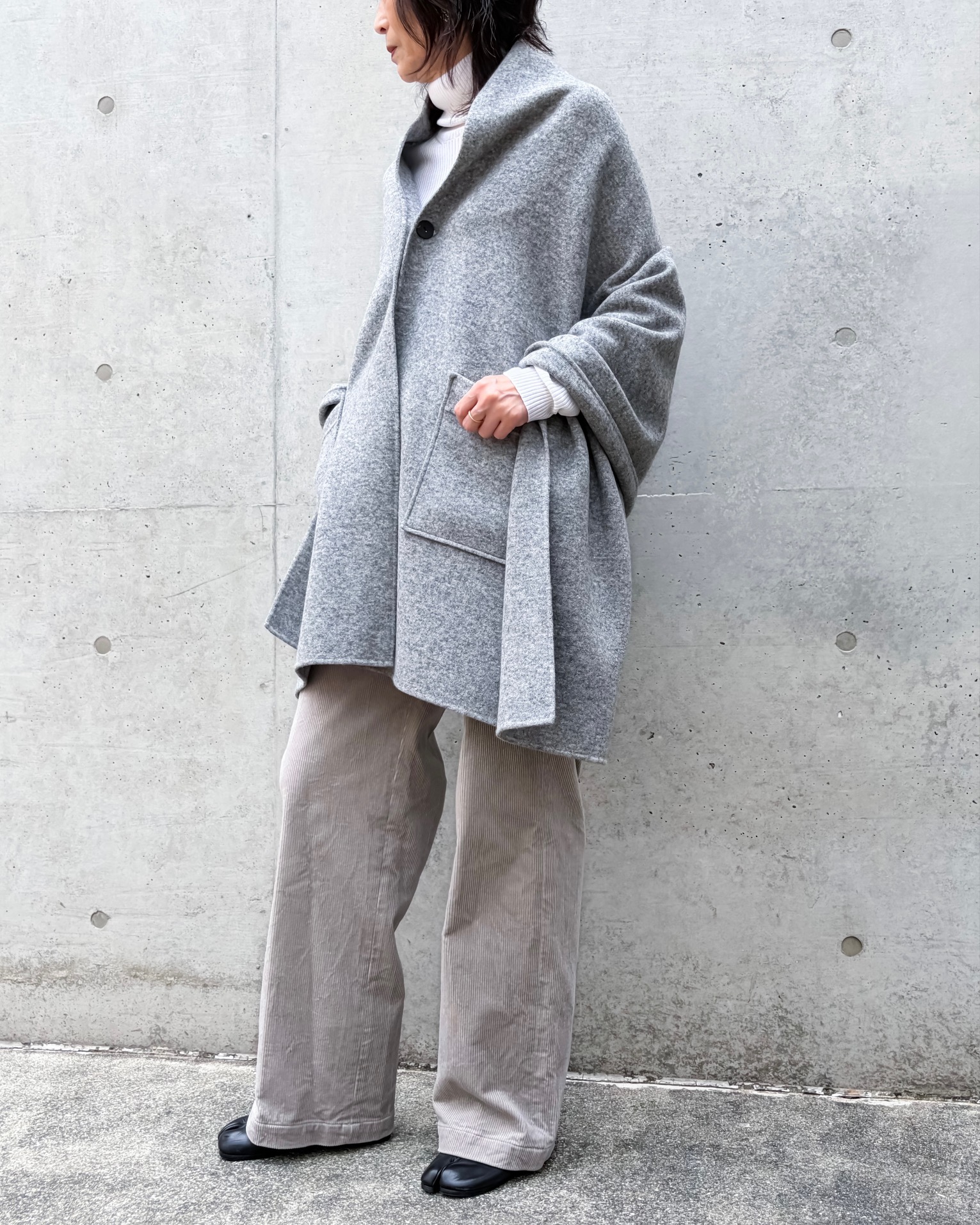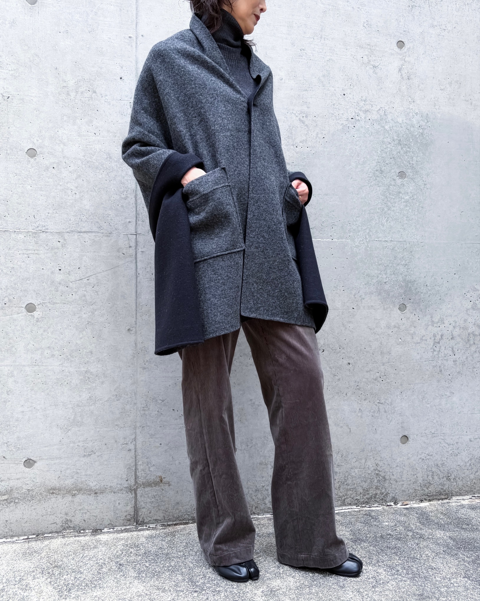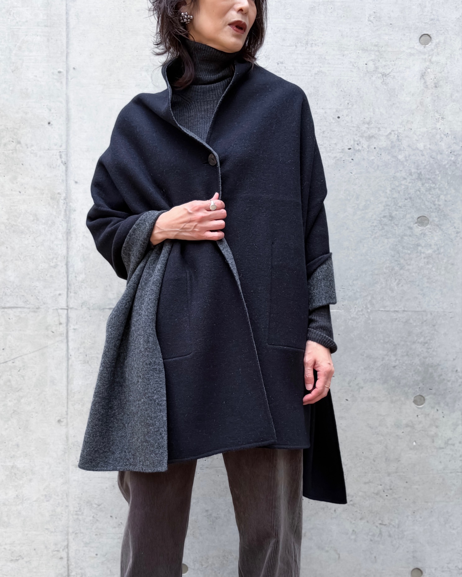 ダブル編みのジャージー素材をリバー縫製で仕立てたストールアウター。
