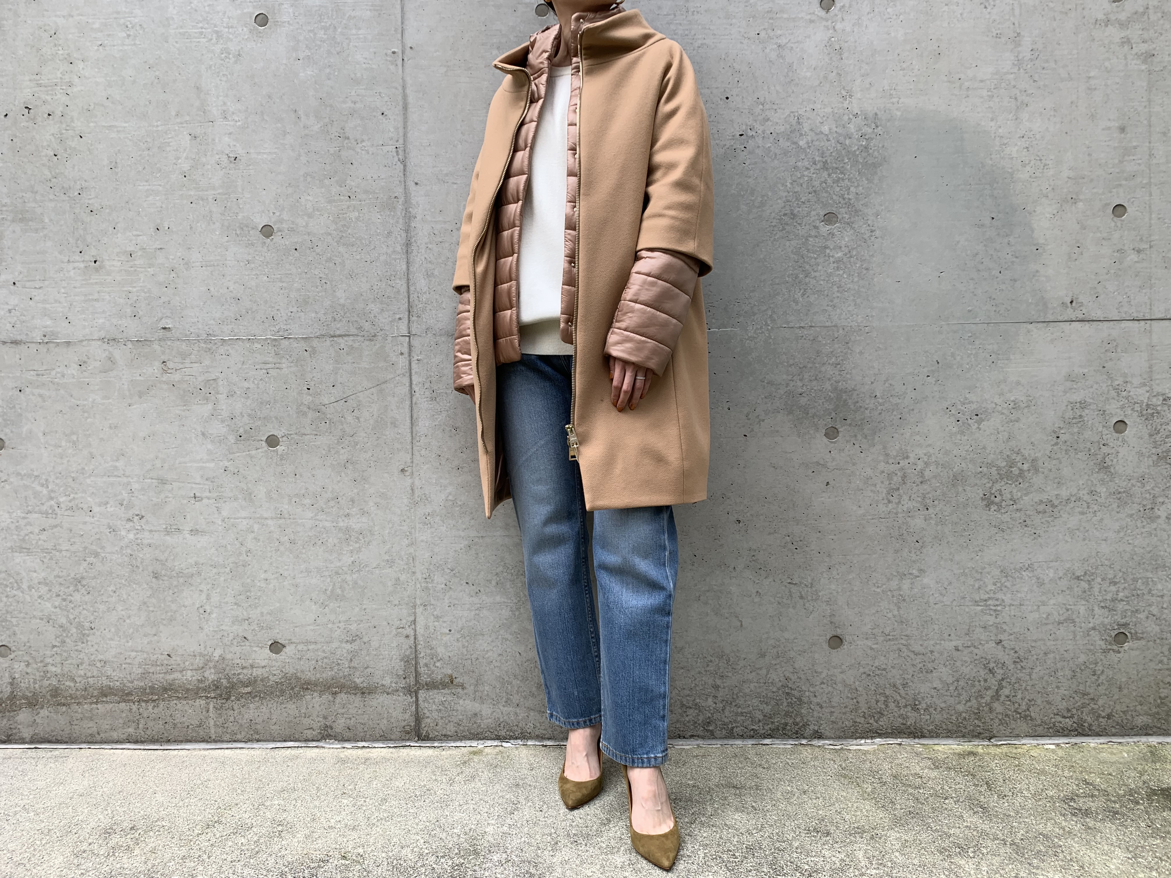 ウールのコートの下にダウンを重ね着したデザインが特徴のスタンドカラーダウンコート。