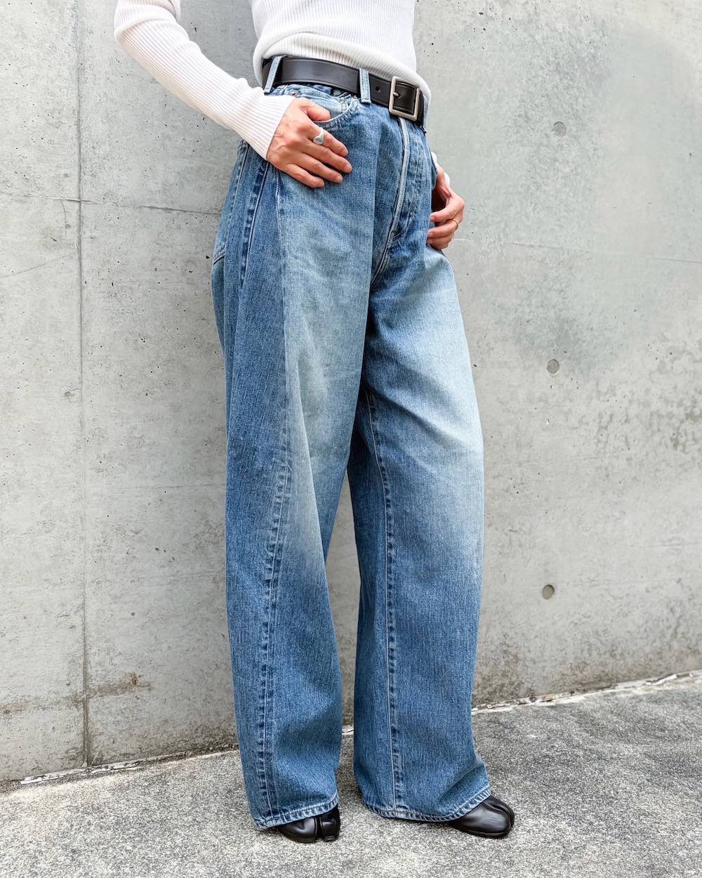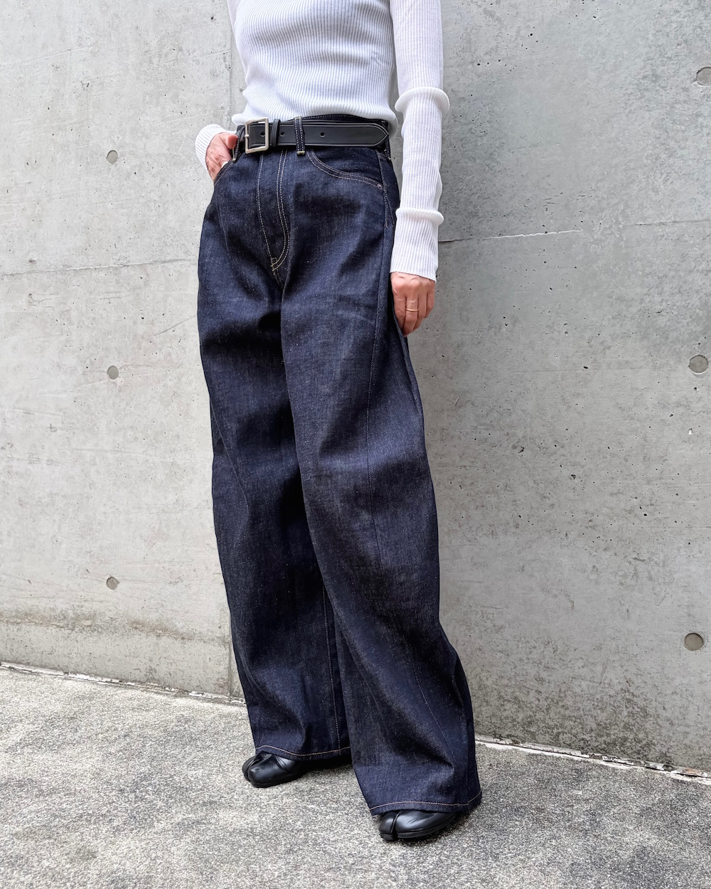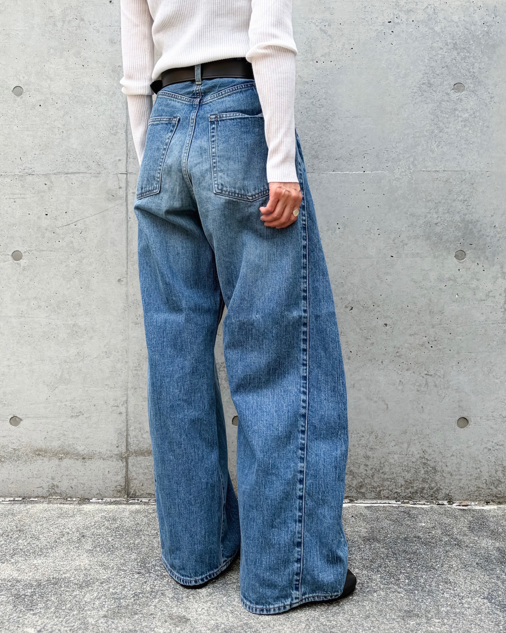 フロントはクラシカルなボタンフライ仕様。すっきりとしたトップスと合わせて、メリハリを利かせるのも素敵です。
