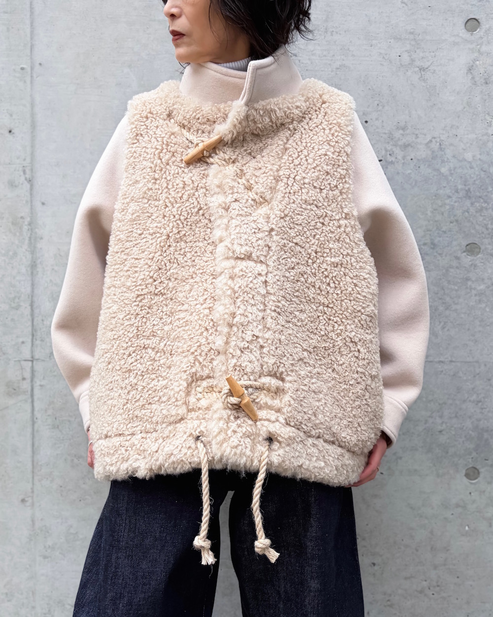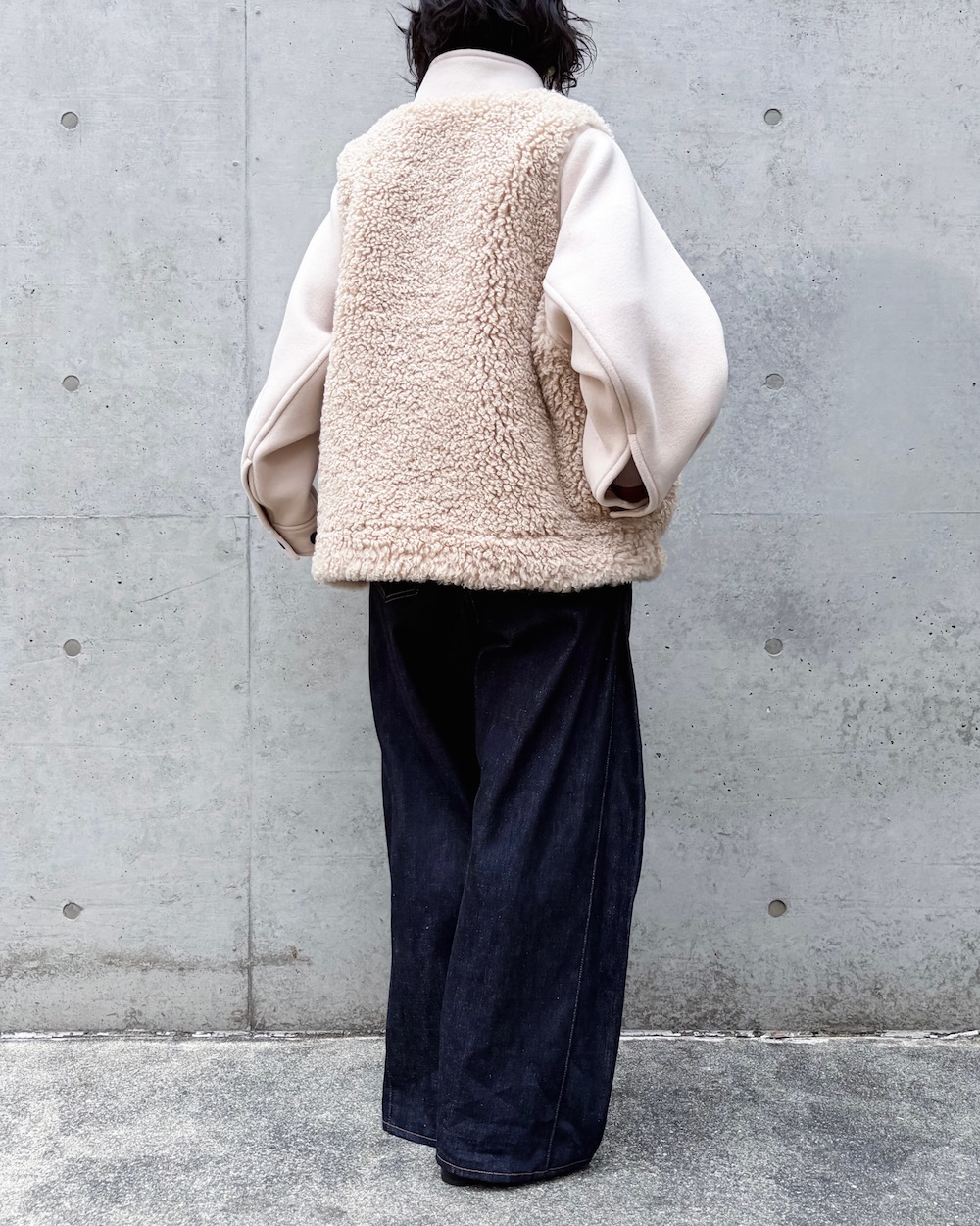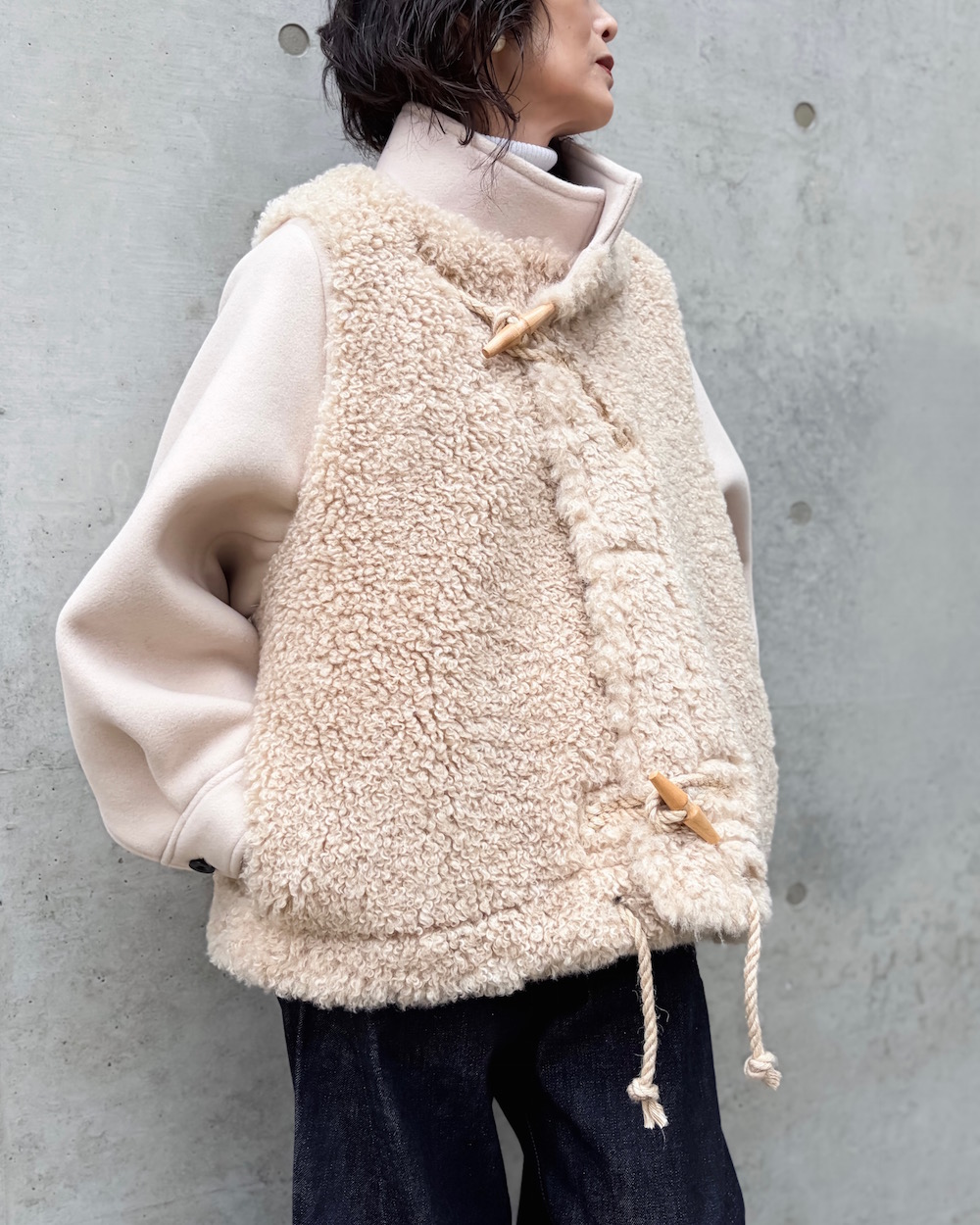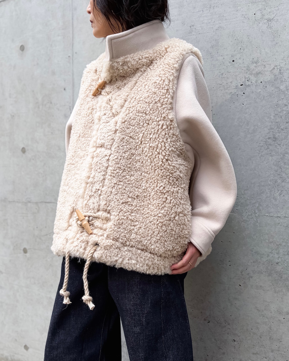 あえてスリーブは異素材で仕上げ、メリハリをつけているのもポイントです。厚みのあるスタンドネック仕様で首元もしっかりとカバーし、肌寒い季節にも重宝するアイテムです。