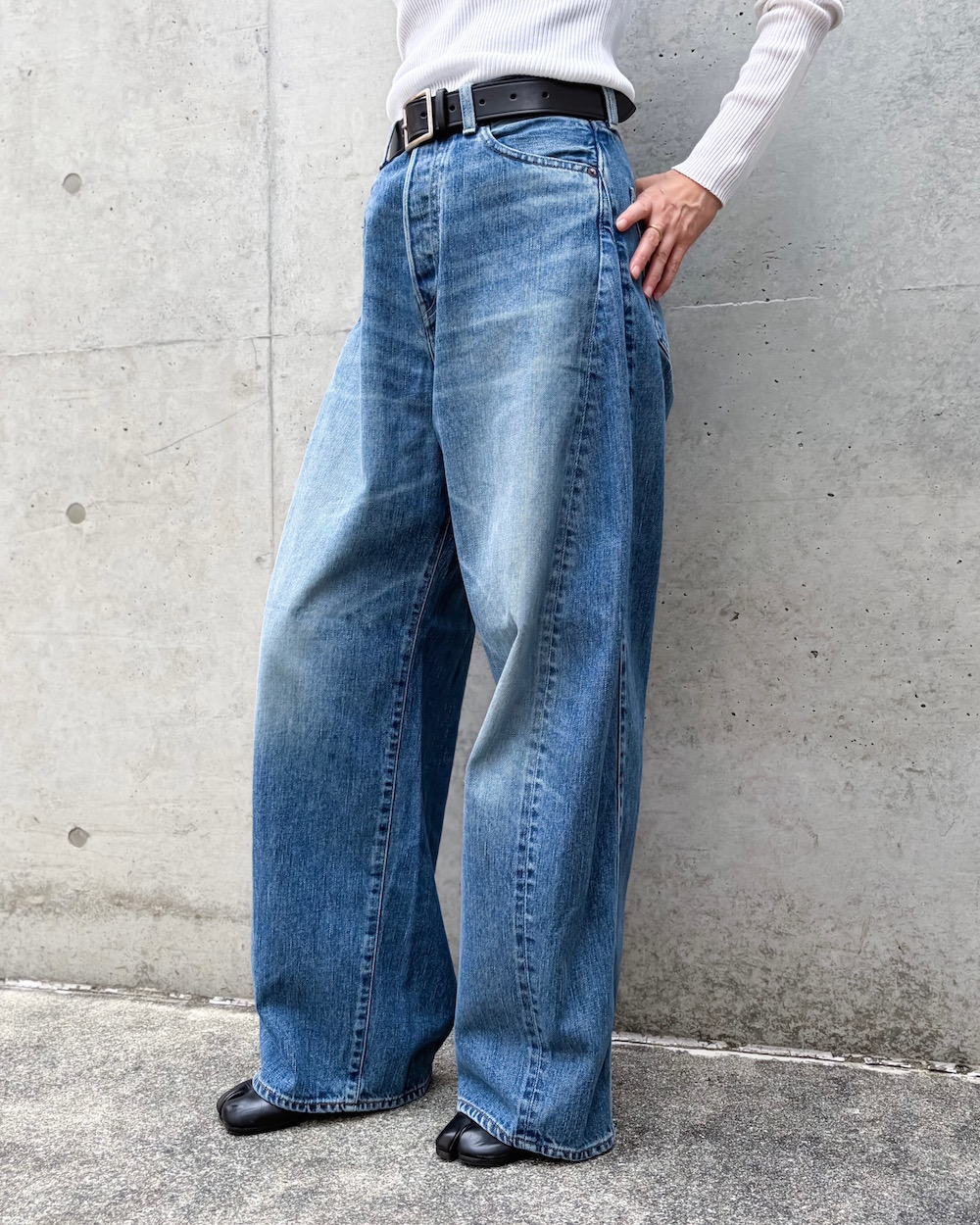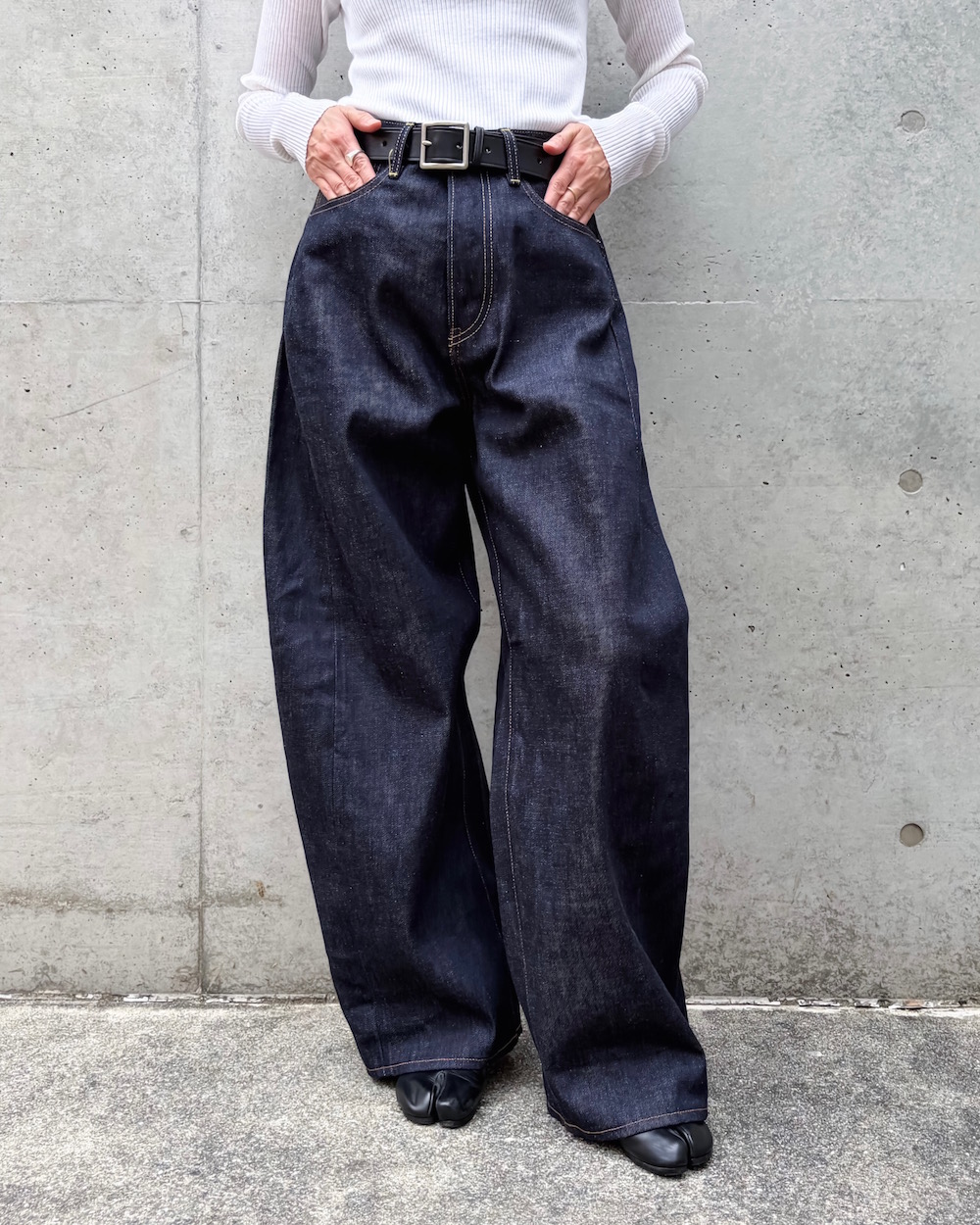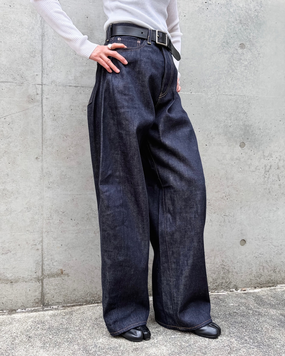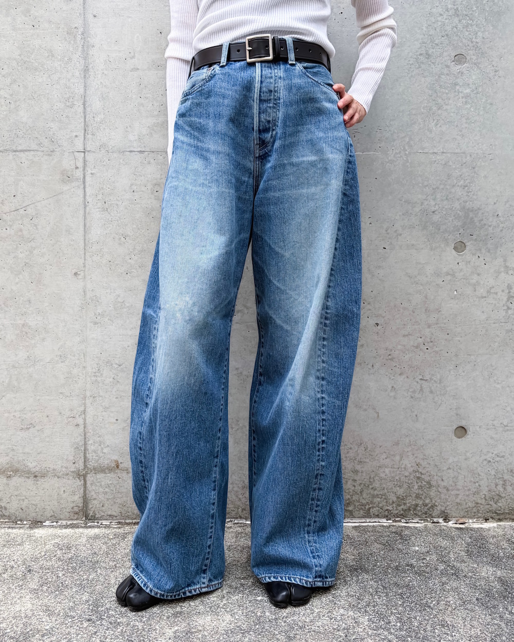 フロントはクラシカルなボタンフライ仕様。レッグのサイド部分に三角マチを加えた、立体感のあるワイドなバレルシルエットがリラクシーなはき心地を叶えます。