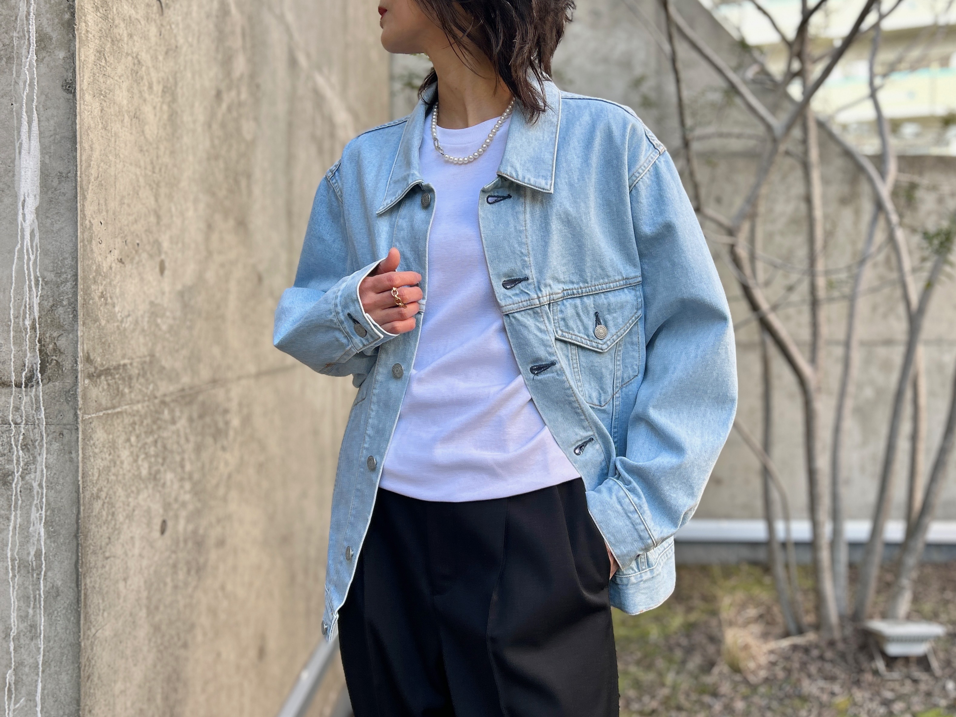 柔らかなオーガニックコットン素材を使用した、オーバーシルエットのデニムジャケット。裾のアジャストボタンを調整し、ブラウジングすればシルエットの変化も楽しめます。