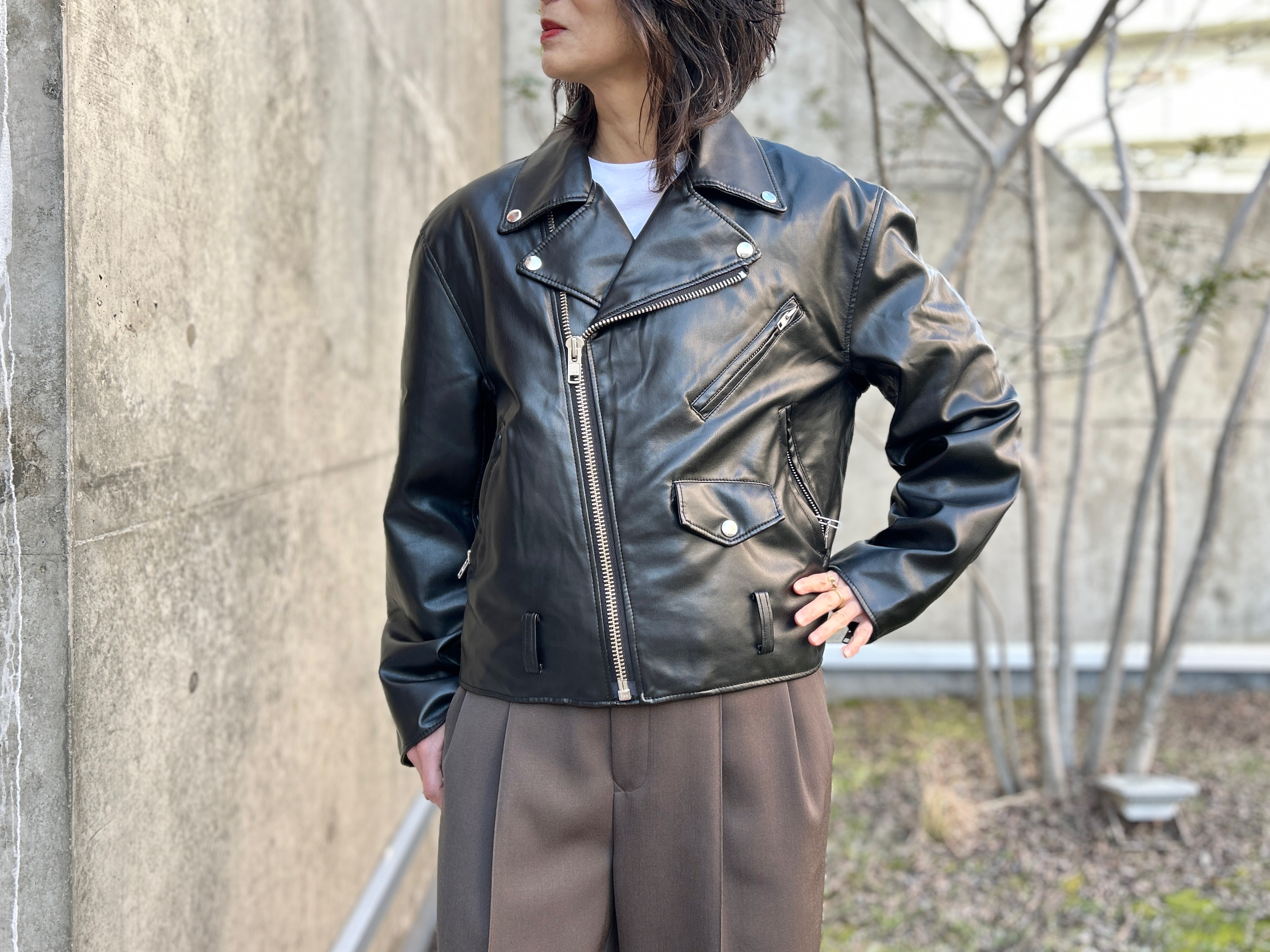 ビーガンレザーを使い、程よいオーバーサイズシルエットに仕上げたライダースジャケットです。