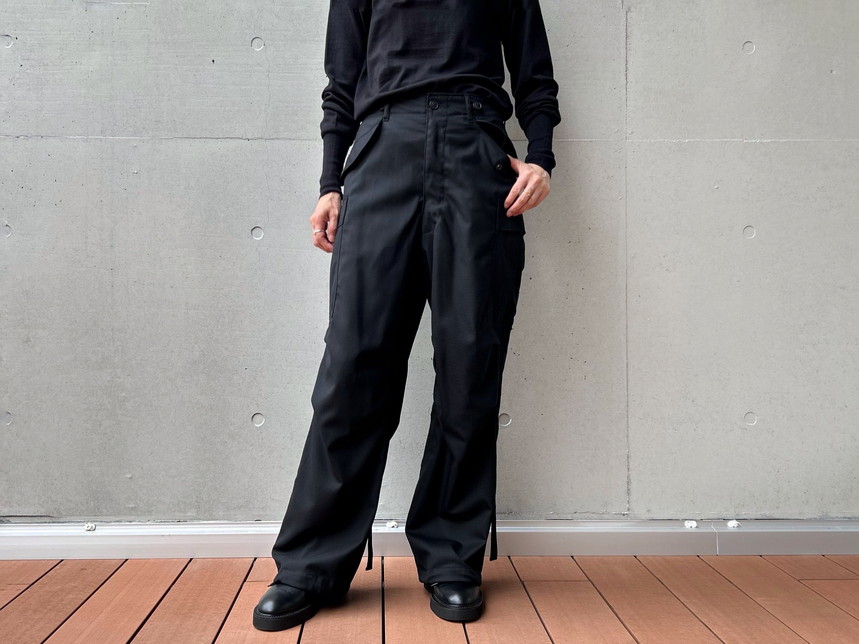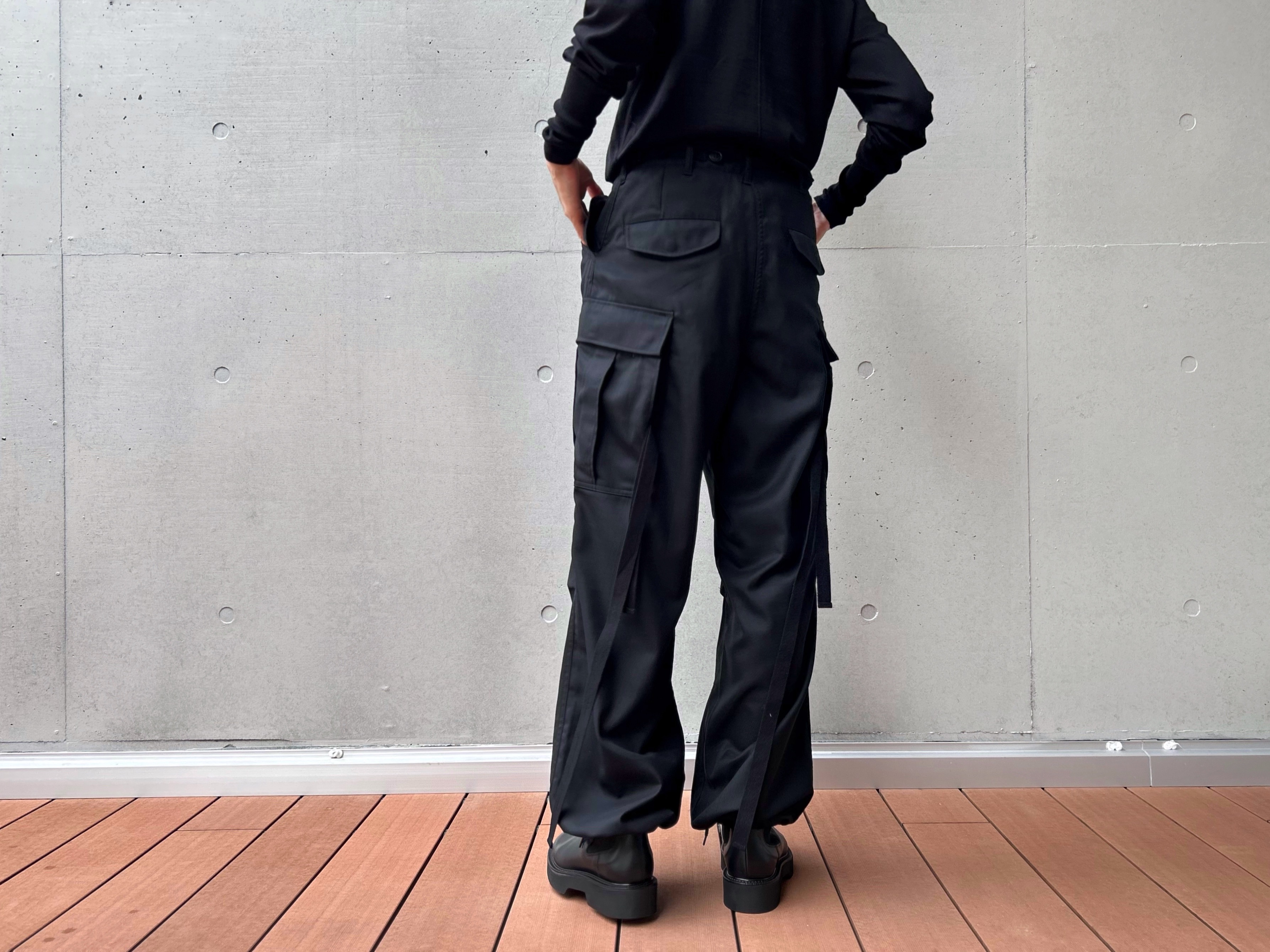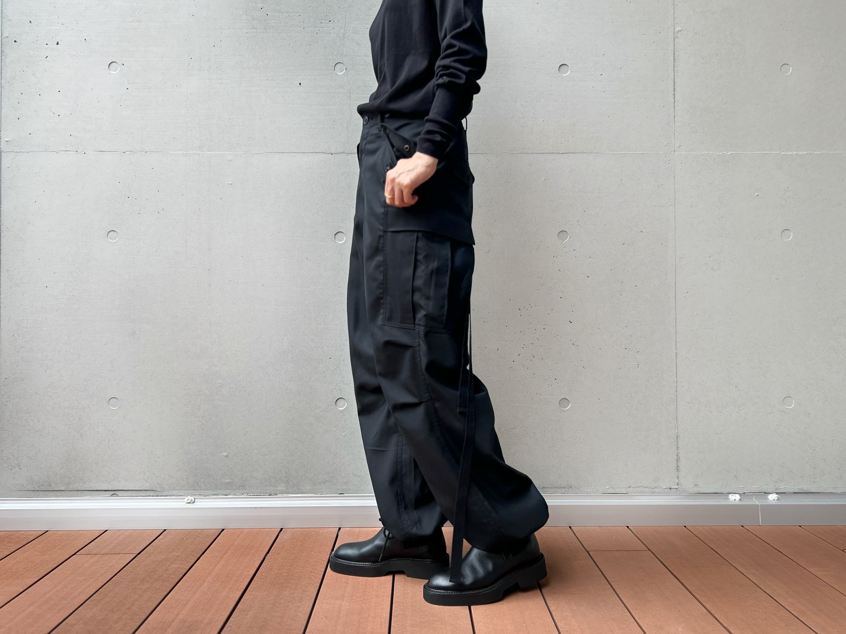 カーゴパンツを解体して作ったシルエットが秀逸です。カーゴパンツのサイドポケット内の紐をそのまま残したデザインも特長的です。