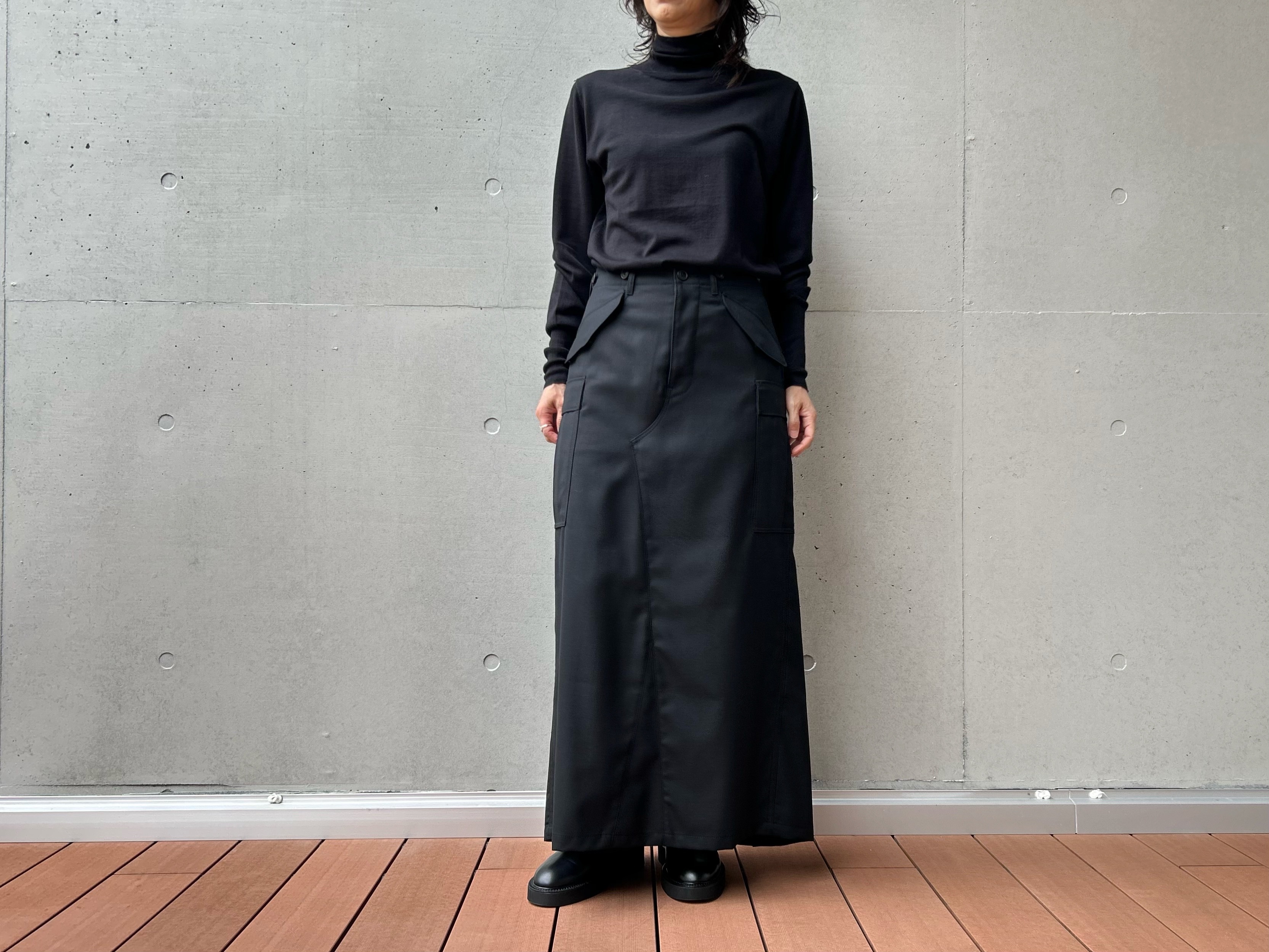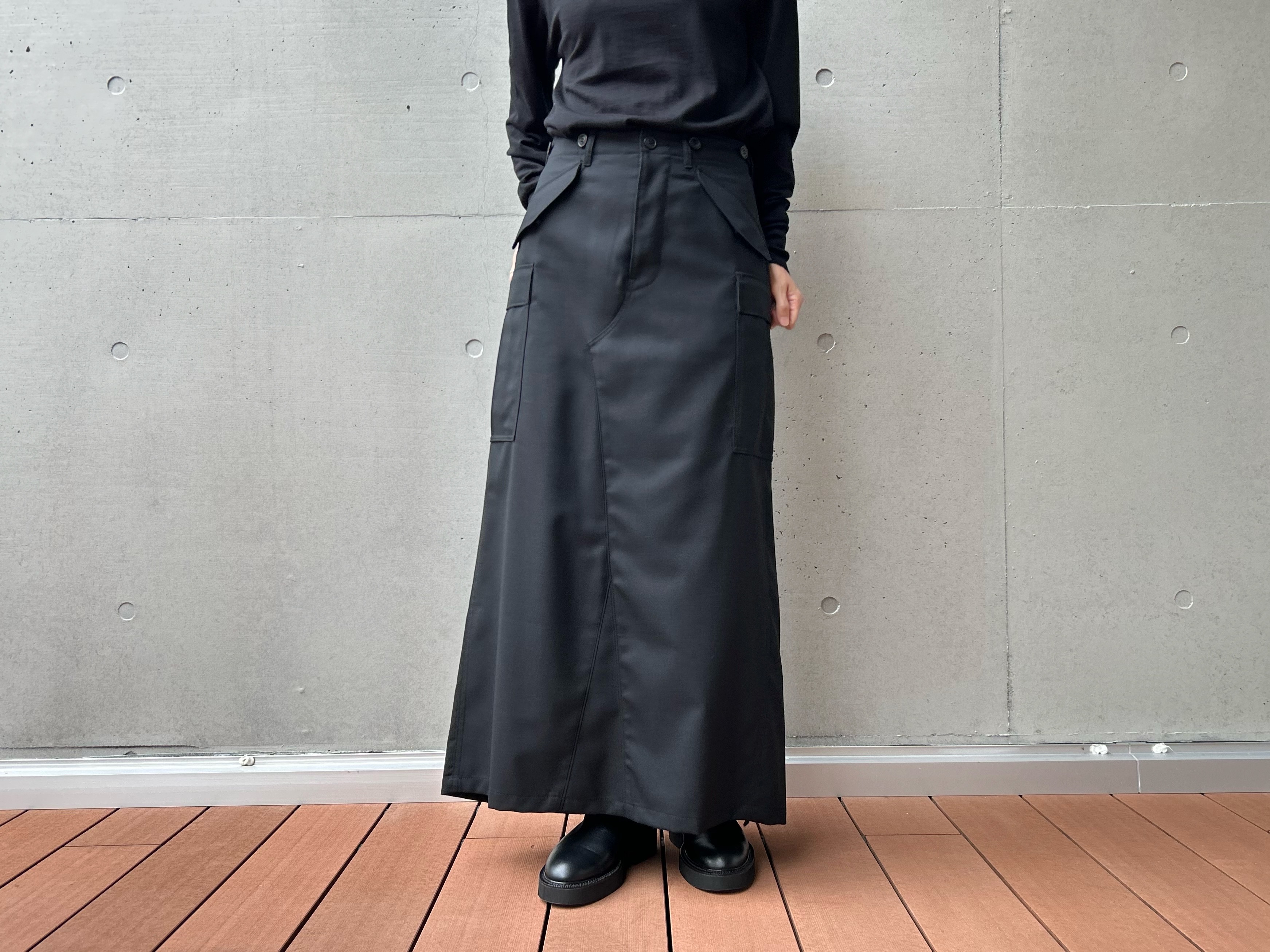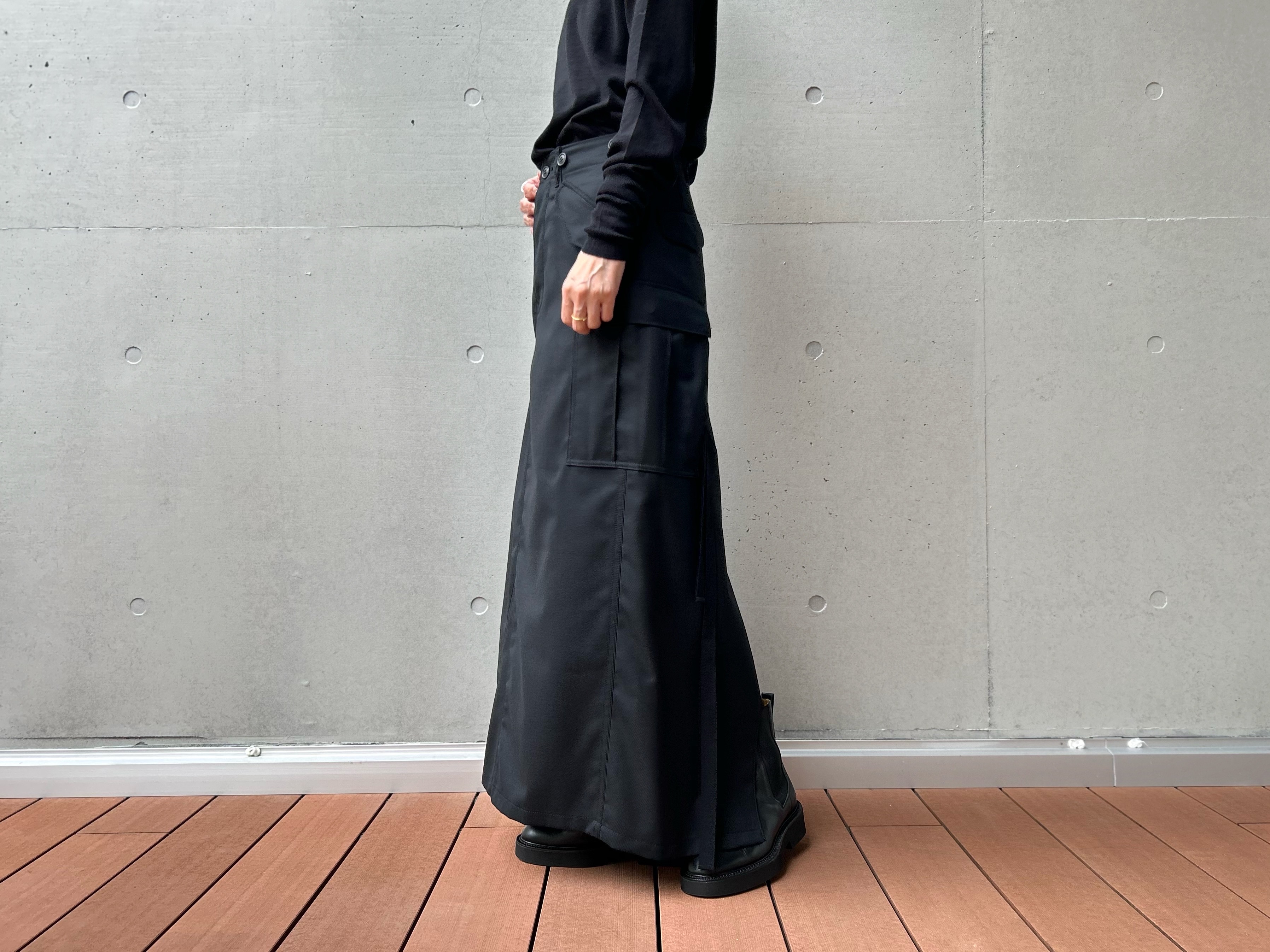 上のスカートと同じウールエステルサージの生地を使用したカーゴパンツです。
