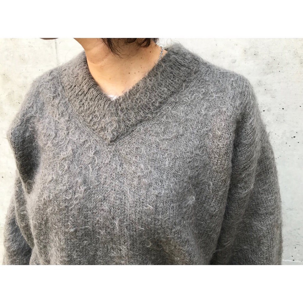 南アフリカ産の特に柔らかなスーパーキッドモヘヤを甘撚りに紡績し、芯糸にウールを使用した糸にて編み上げ、起毛加工を施したローゲージニットです。