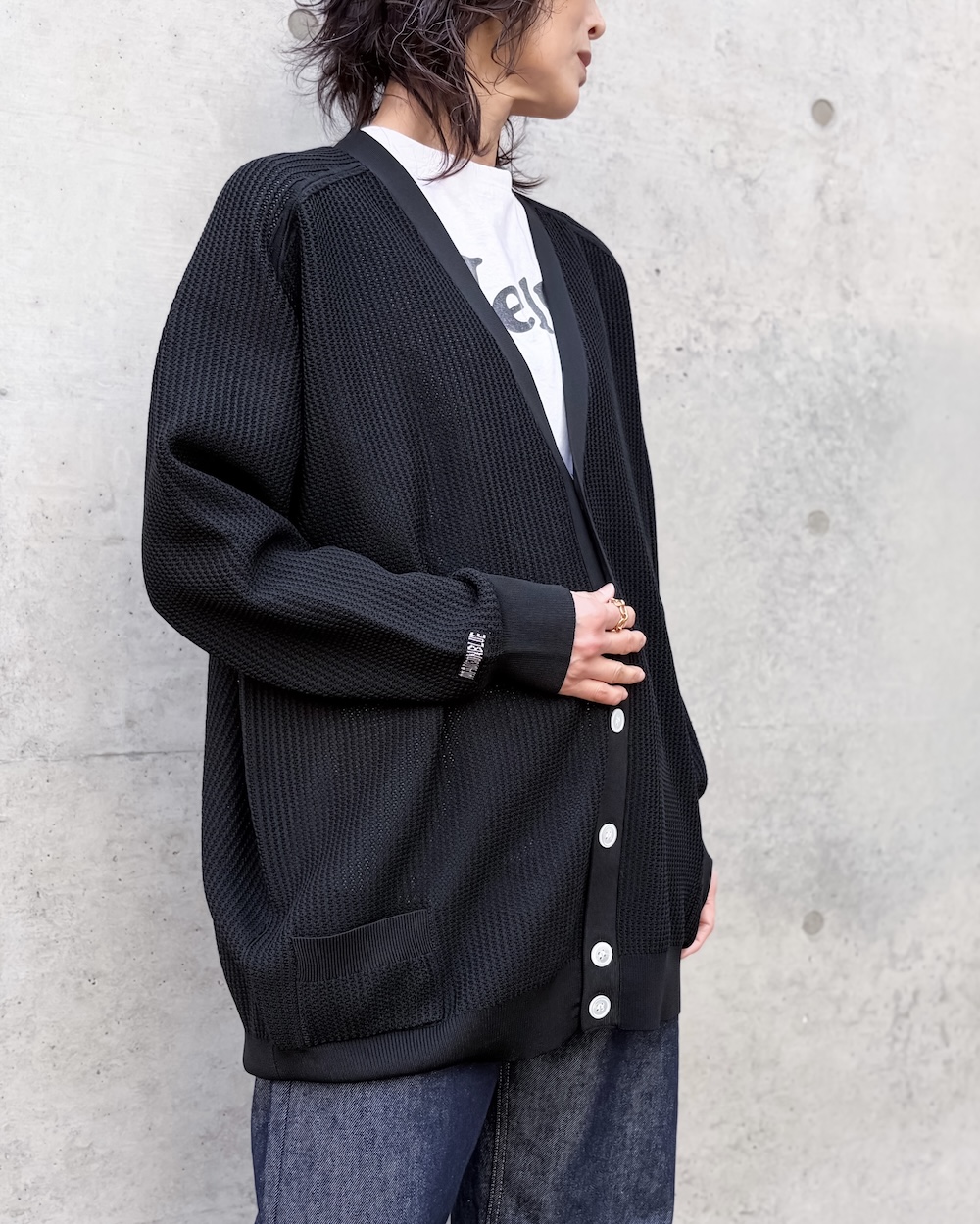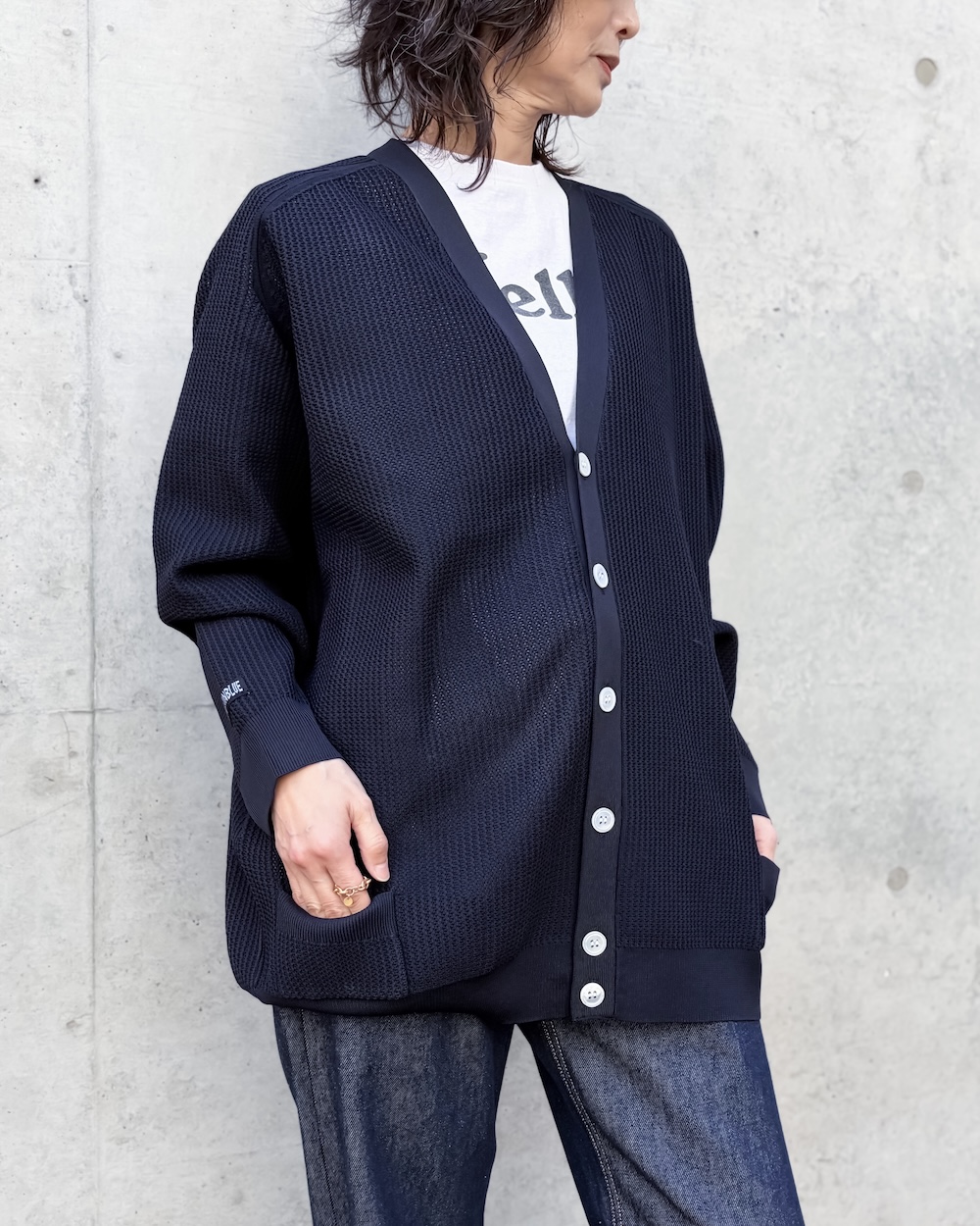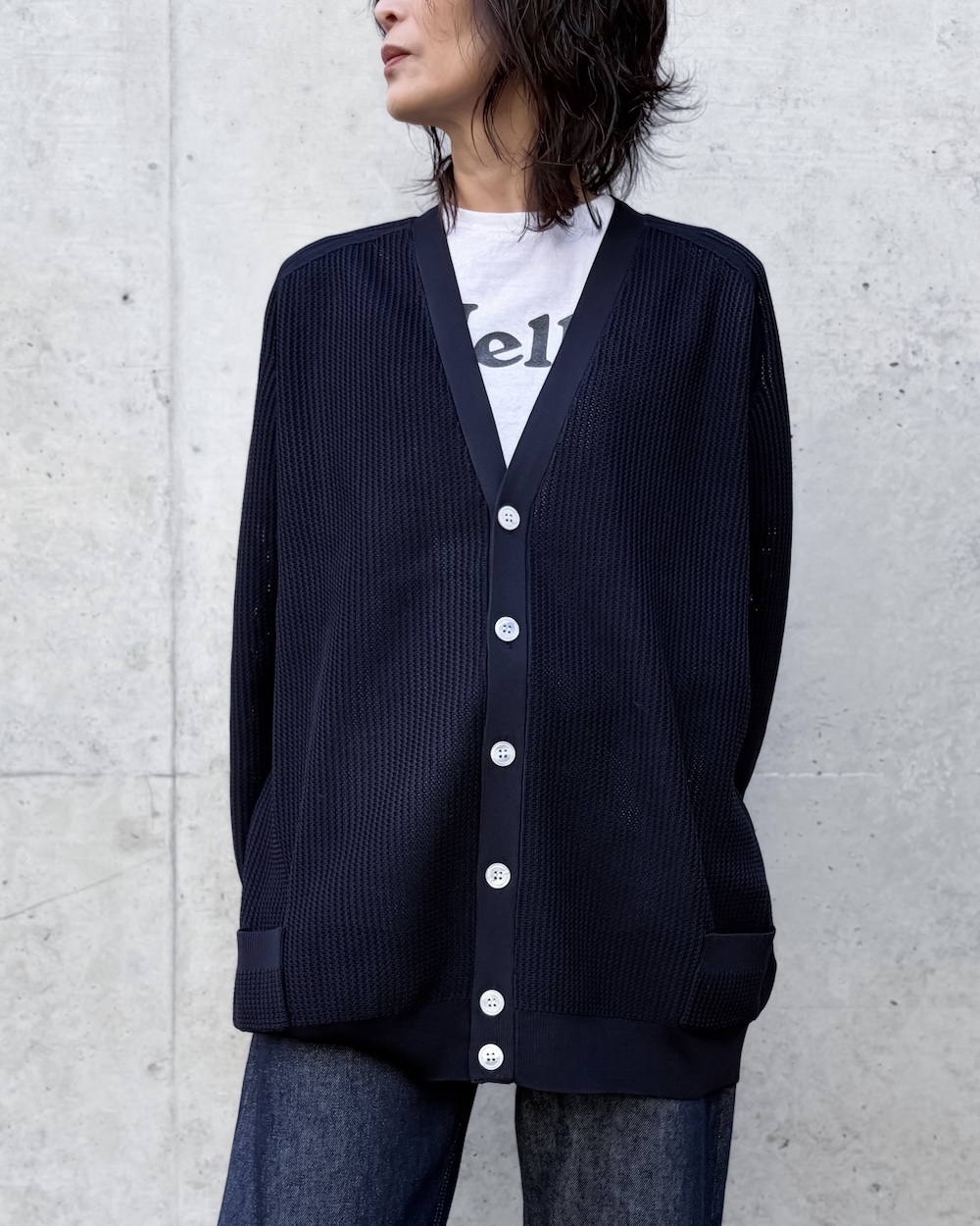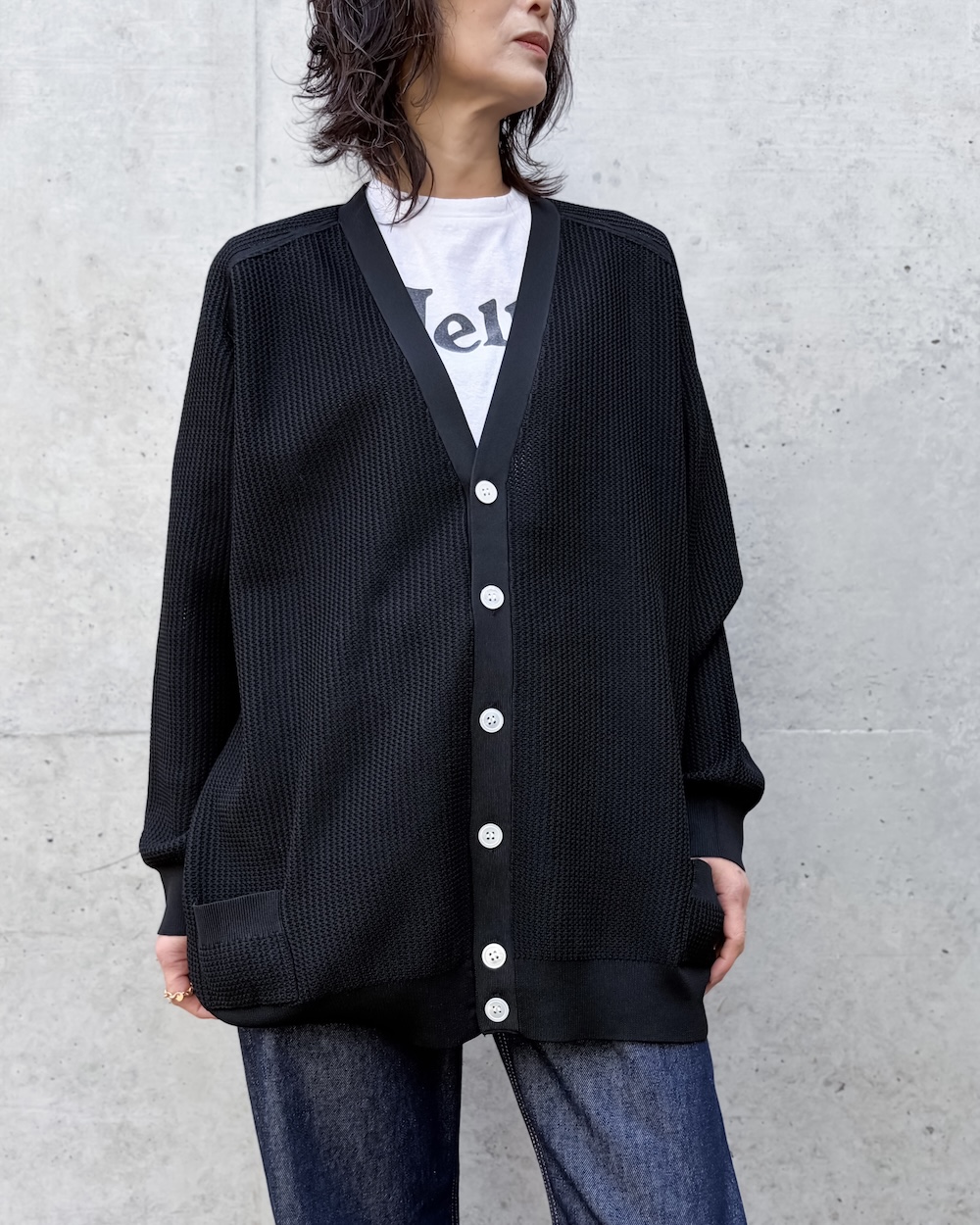 スポーティーなメッシュ感を表現した透かし編みのカーディガンですが、上品に透けるため大人なカーディガンとして様々なコーディネートに活躍する1着です。