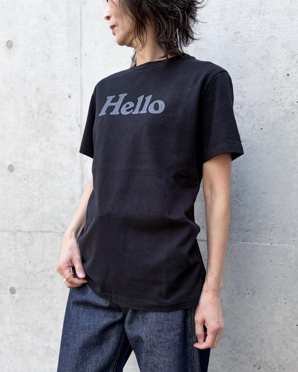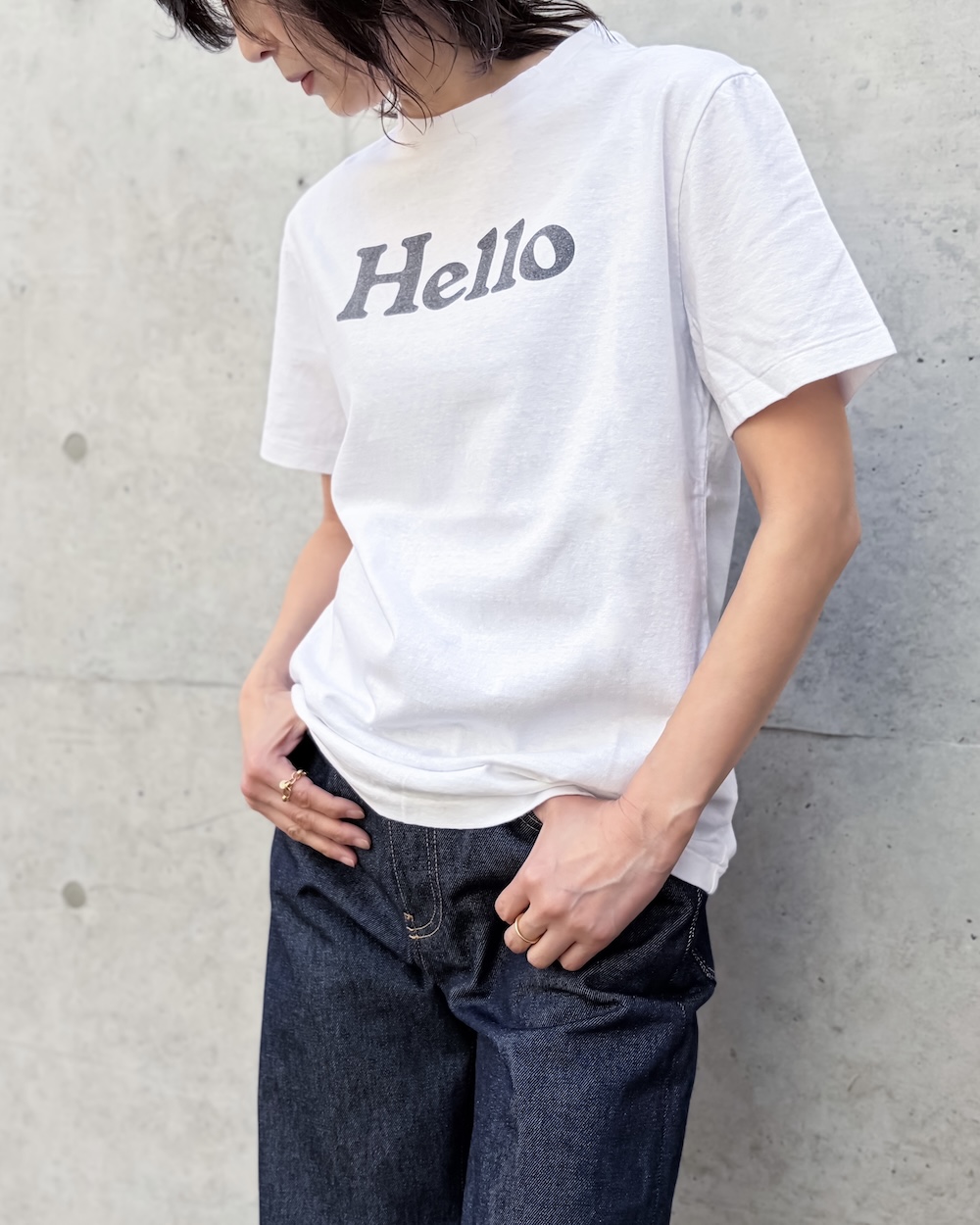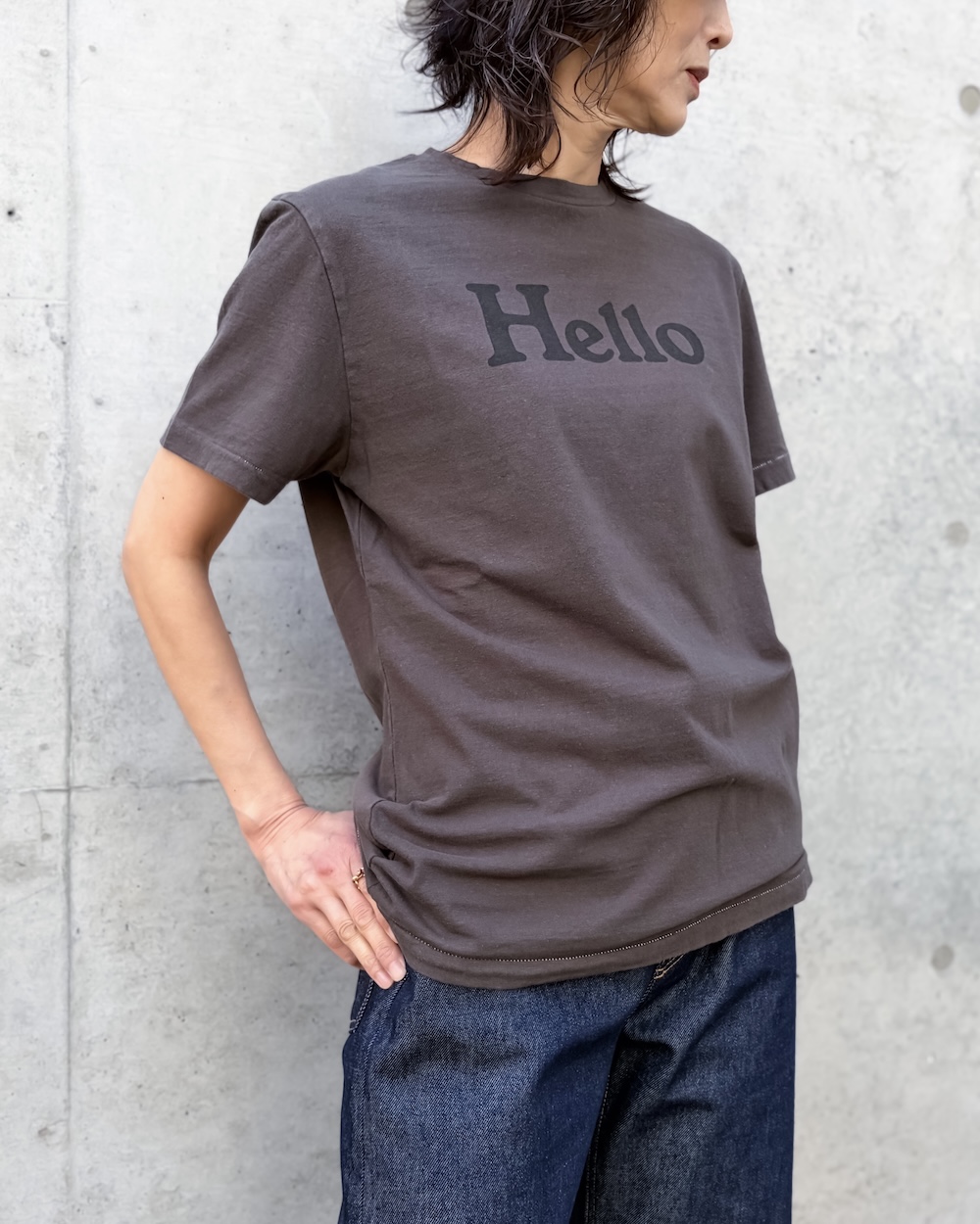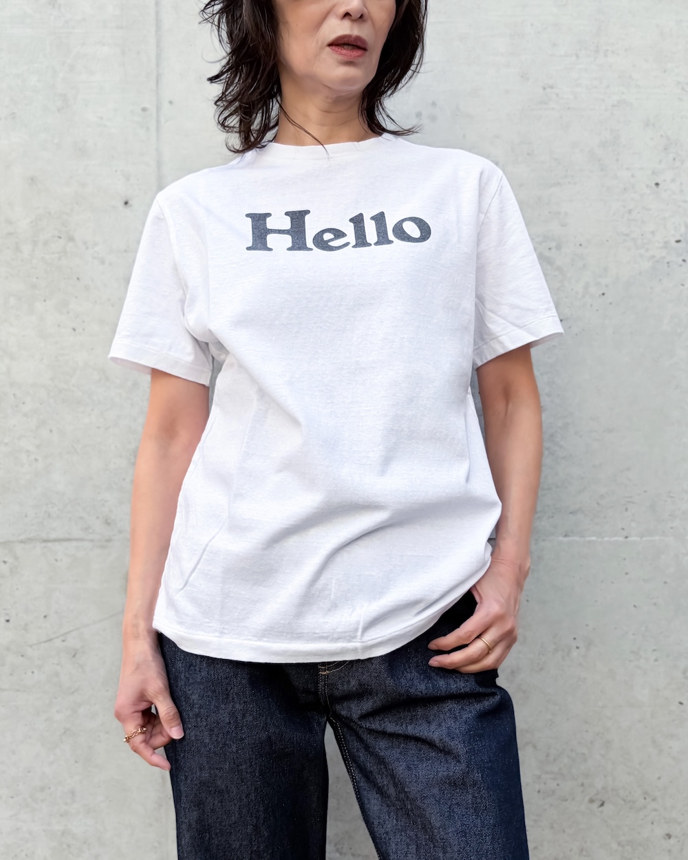 緩くて抜け感のある初期の<HELLO TEE>を再現するために、糸や生地を一から作成し、着込んだ風合いを表現したこだわりのTEEシャツです。