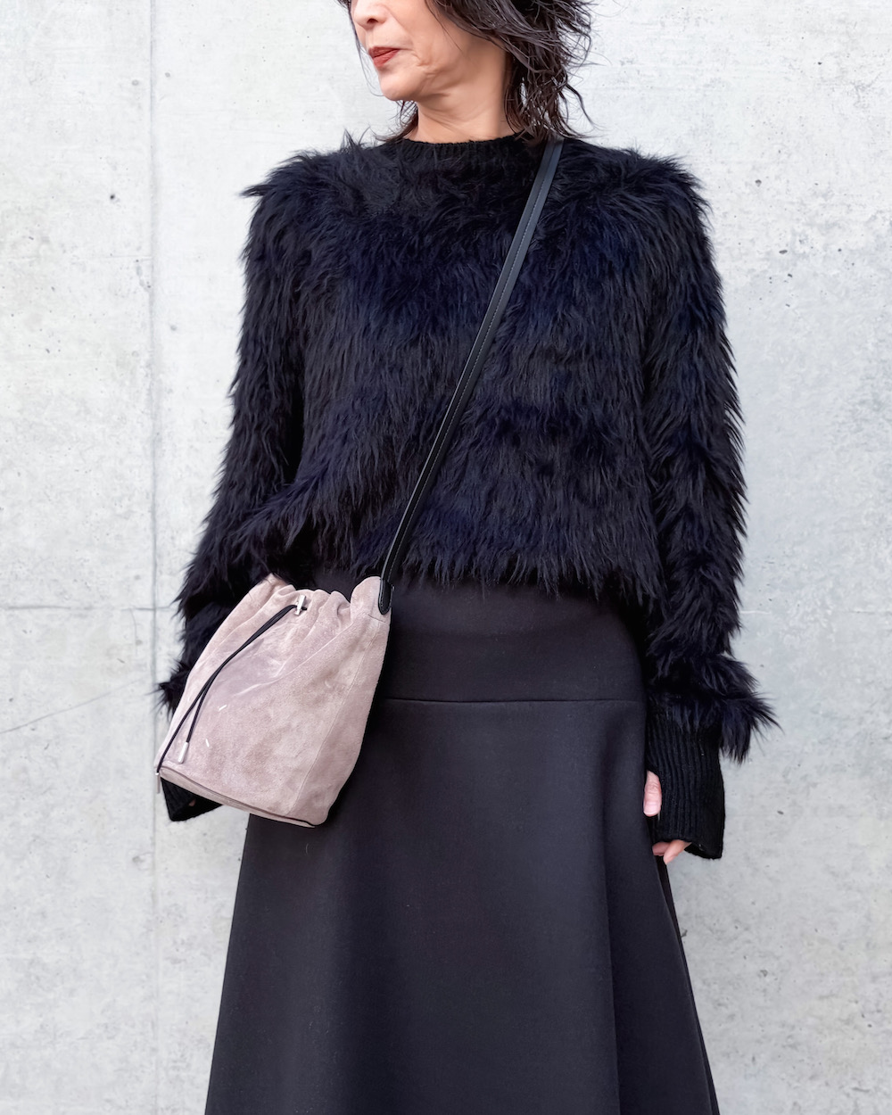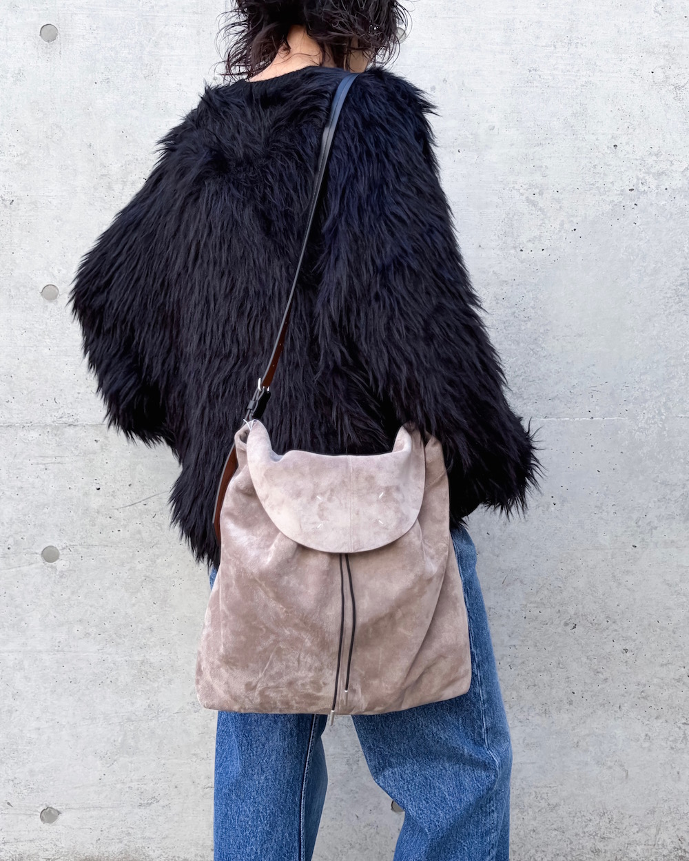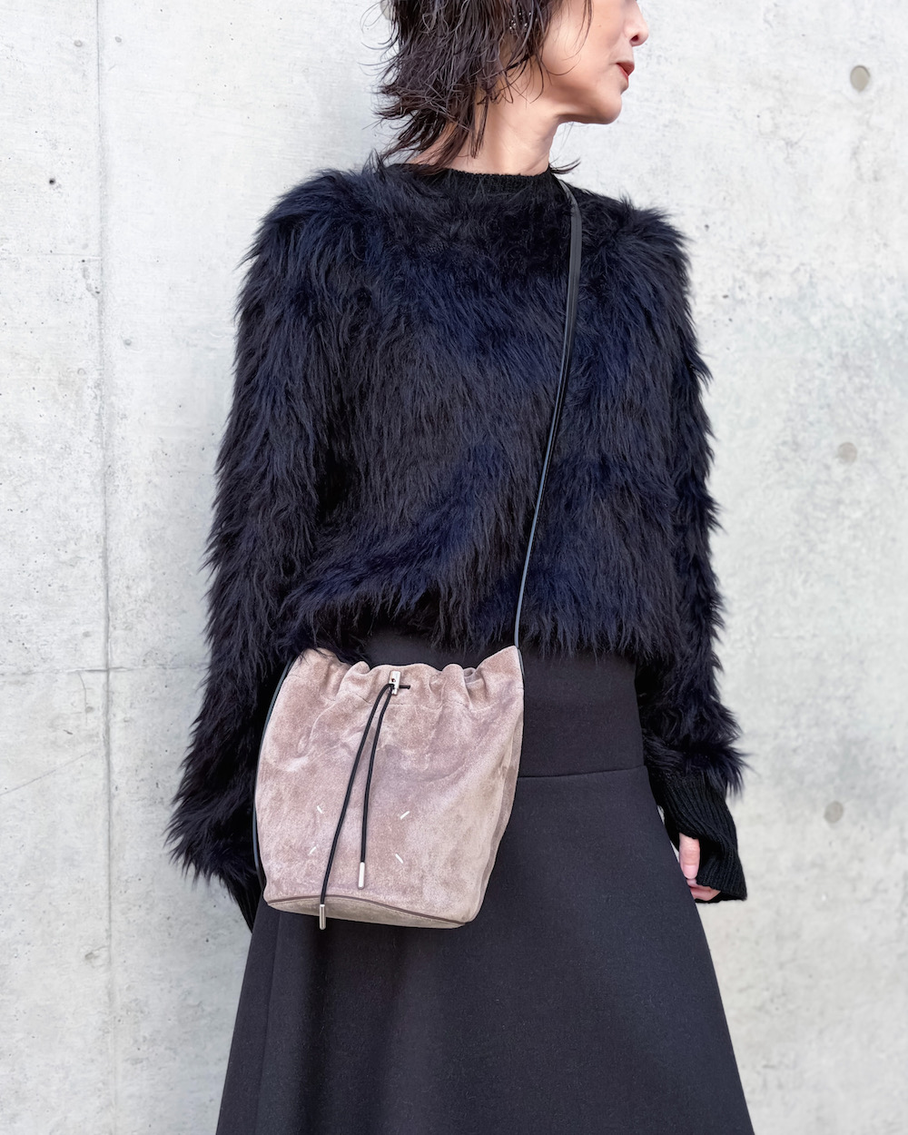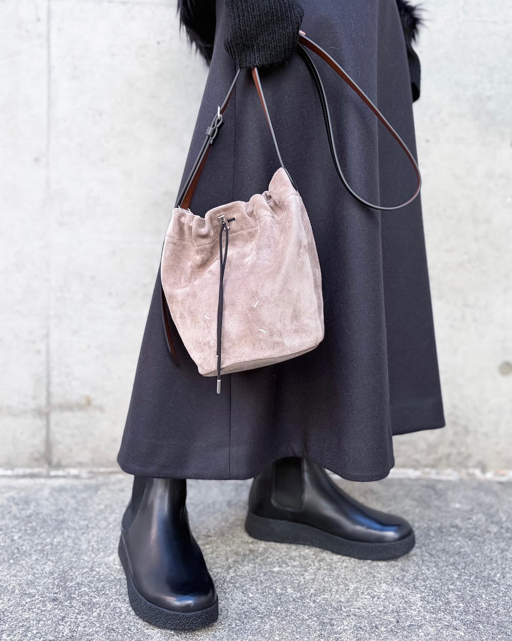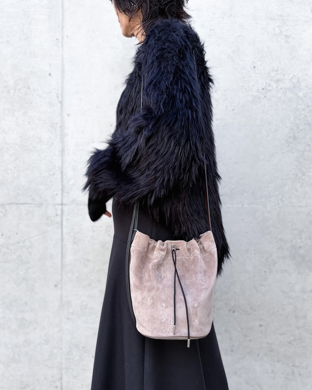 カジュアルなフォルムを洗練された表現に昇華したバケットバッグ。スエードで構築された彫刻的なシルエットが特徴で、ドローストリングクロージャーで開閉し、コントラストの効いたベルト風ショルダーストラップは調整可能。クロスボディ、ショルダーの両方で楽しめます。フロントにはメゾン マルジェラおなじみの4ステッチが入り、ラベルの代わりとして存在感を放ちます。