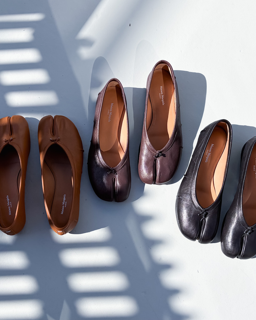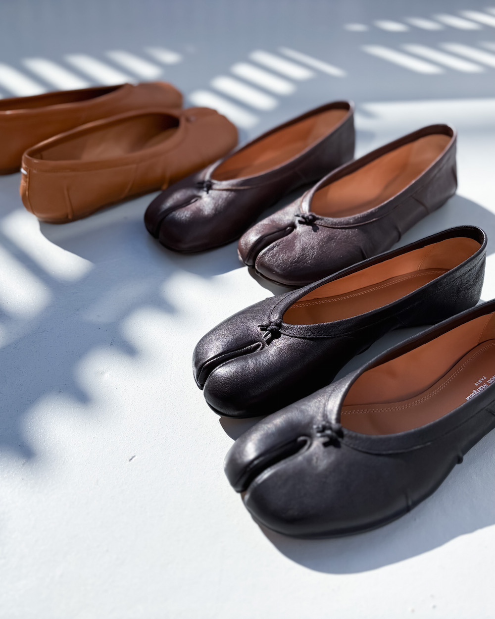 Maison Margielaによる「タビ」の新作バレリーナシューズ。アーカイブのバレリーナシューズのデザインを踏襲しています。柔らかなナッパレザーを使用し、折り目や底、縫い目に手作業によるユーズド加工を施すことで、職人技によるヴィンテージ感を表現しています。15世紀の日本の伝統的な靴下からインスピレーションを得て、1989年のメゾンのデビューコレクションで発表されたスプリットトゥの「タビ」は、メゾンのアバンギャルドで反抗的なスピリットを表現しており、受け継がれる定番デザインとして、毎コレクションで探求され続けています。