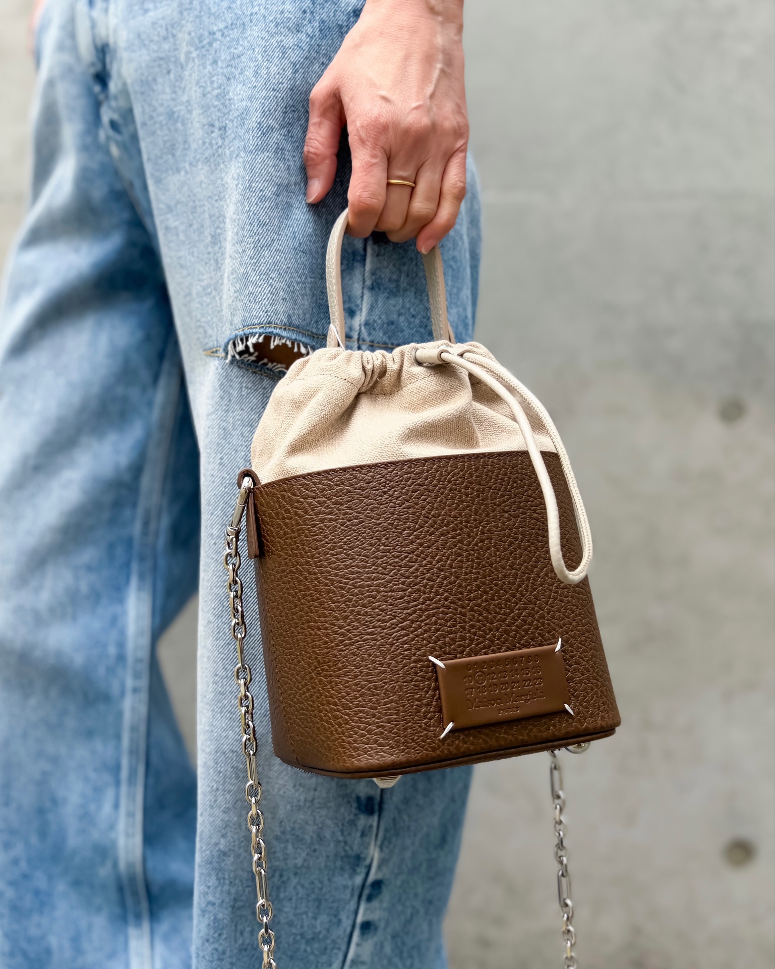レザーでしっかりと形付けられたボディーの中のキャンバス地のインナーが蓋のように絞られたバケットバッグです。