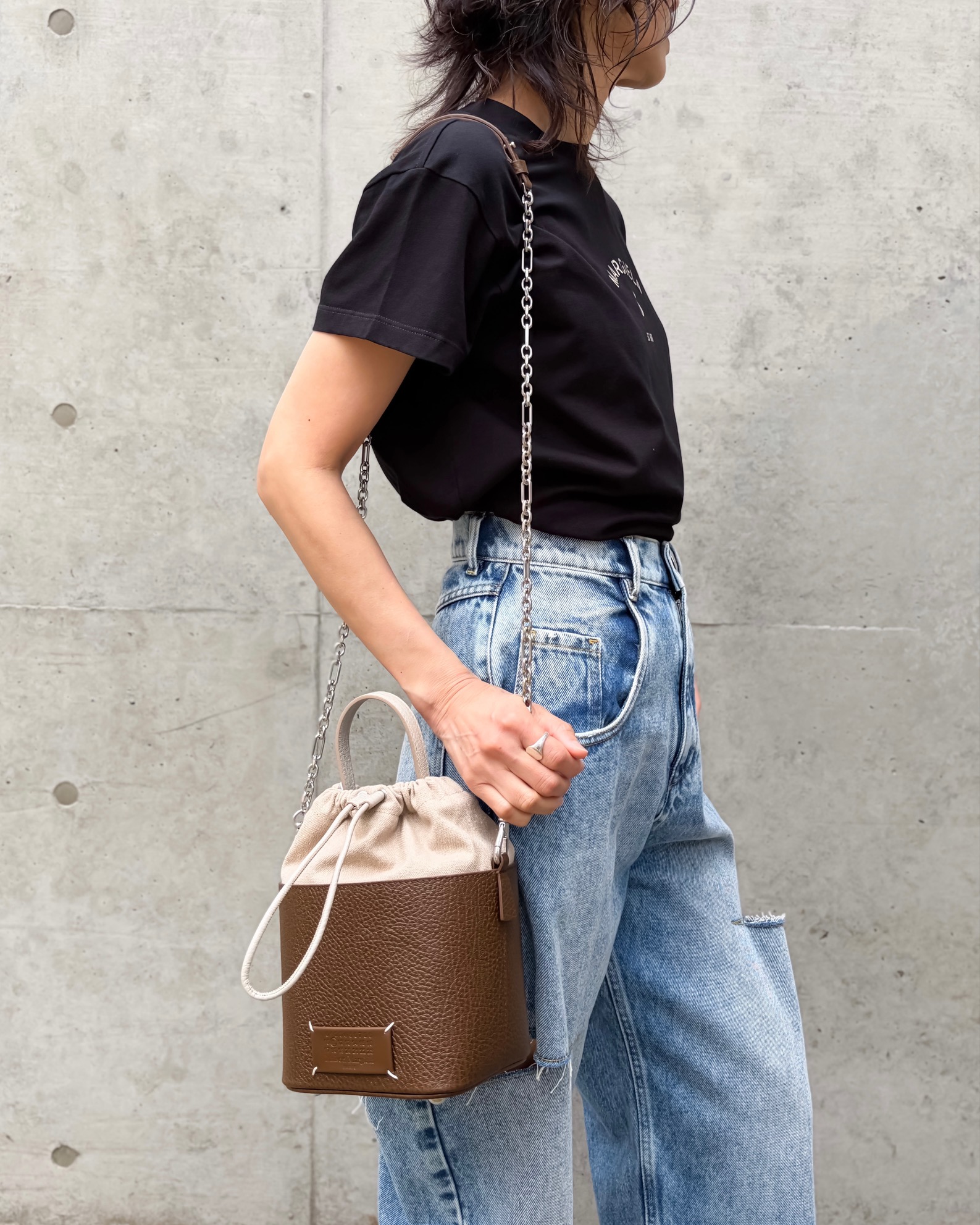 レザー、布、チェーンという異素材の組み合わせや、ブラウンベージュの配色もポイントです。