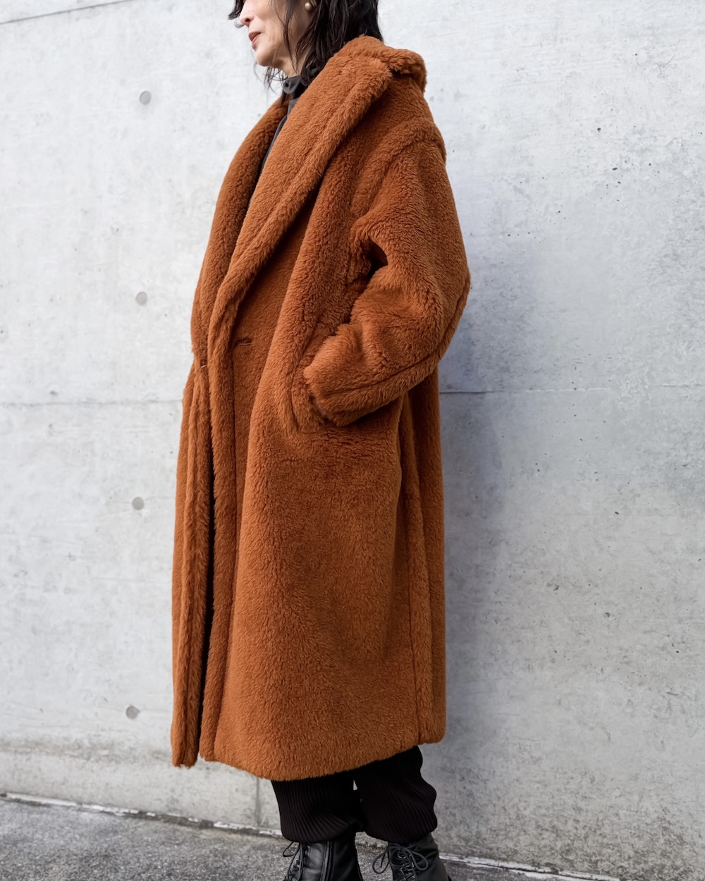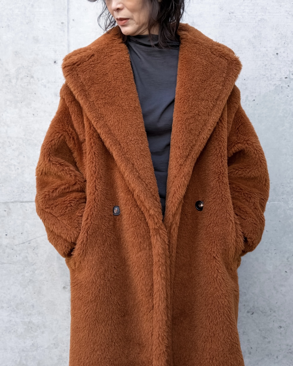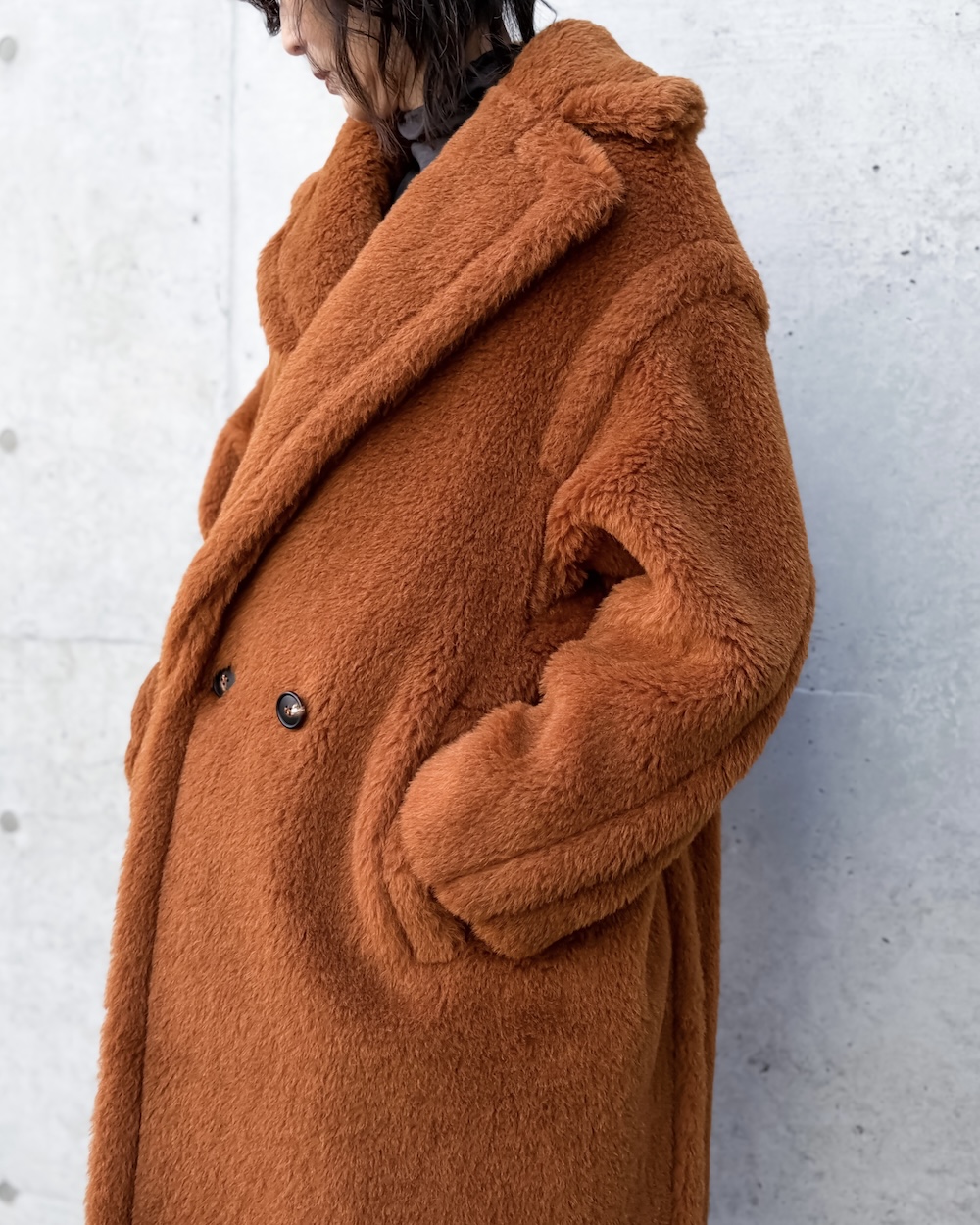 高品質なキャメルとシルクを使用した、上品で光沢のある短い毛並みの生地は保温性に優れ、ファーのようなボリュームがあるにもかかわらず軽い着心地が魅力です。