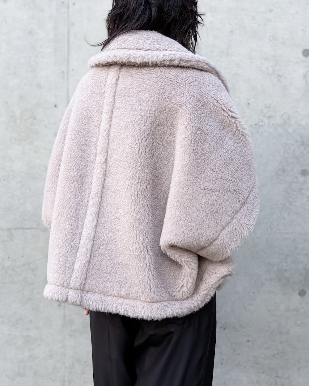 高品質なアルパカとウール、シルクを使用し、上品で光沢のある短い毛並みに仕上げた生地は、ボリュームがあるにもかかわらずとても軽い着心地が魅力です。